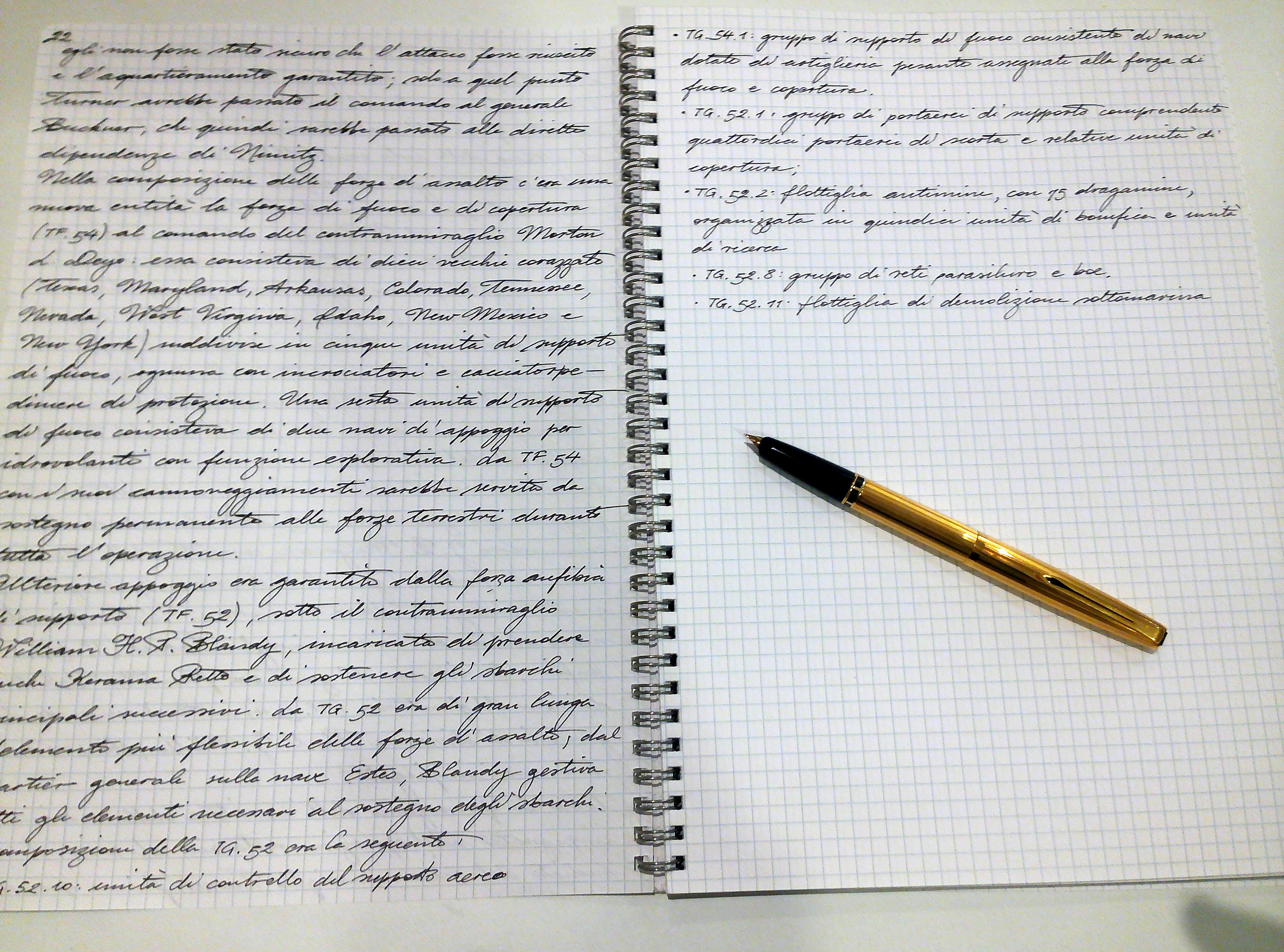 La Omas Extra 620 (a stantuffo) l'ho prima scaricata del costosissimo Iroshizuku Kon-peki - con quel che costa mica ci scarabocchio a caso delle pagine giusto per vedere quante ne riempio! - e poi l'ho riempita col Pelikan 4001 Bleu Royal "ventennale" da giubilare. La Omas ha un serbatoio un po' più piccolo della M250, e in più ha un pennino M e un flusso adatto (non esagerato ma "giusto"). Così non è arrivata a completare il quarto foglio A4 fermandosi a metà dell'ottava facciata. Fanno 230 righe A4, che comunque equivalgono a circa 22 pagine di quaderno A5.