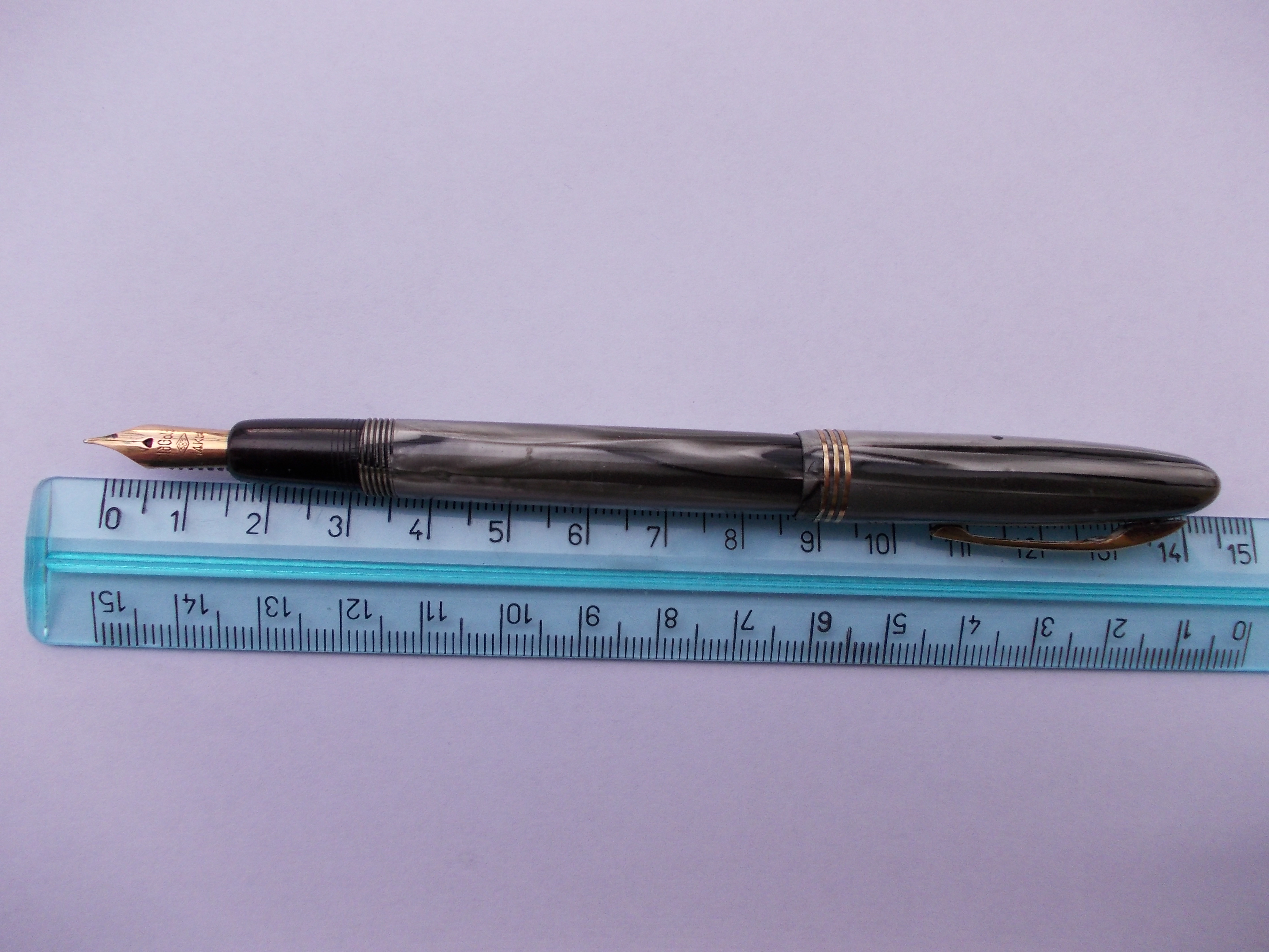 A quanto pare Letizia Jacopini è conosciuta tra i pennofili con il nome proprio, come Leonardo e Michelangelo. Non si capisce poi perchè l'italianissimo produttore di penne stilografiche abbia scelto un nome inglese, inventato per giunta. La Hoower è quindi una sorellina della mia Atlantica, entrambe prodotte fino alla fine degli anni '40. La penna è arrivata con il gommino in polvere e la barra di pressione arrugginita, ma recuperabile. Fusto e cappuccio sono di celluloide, in buone condizioni, tranne qualche piccola crepa alla base del cappuccio. Quello che mi ha stupito è il pulsante di fondo filettato dalla parte esterna, non so per quale motivo (ma ho visto su internet questa particolarità anche per una Parker Victory).