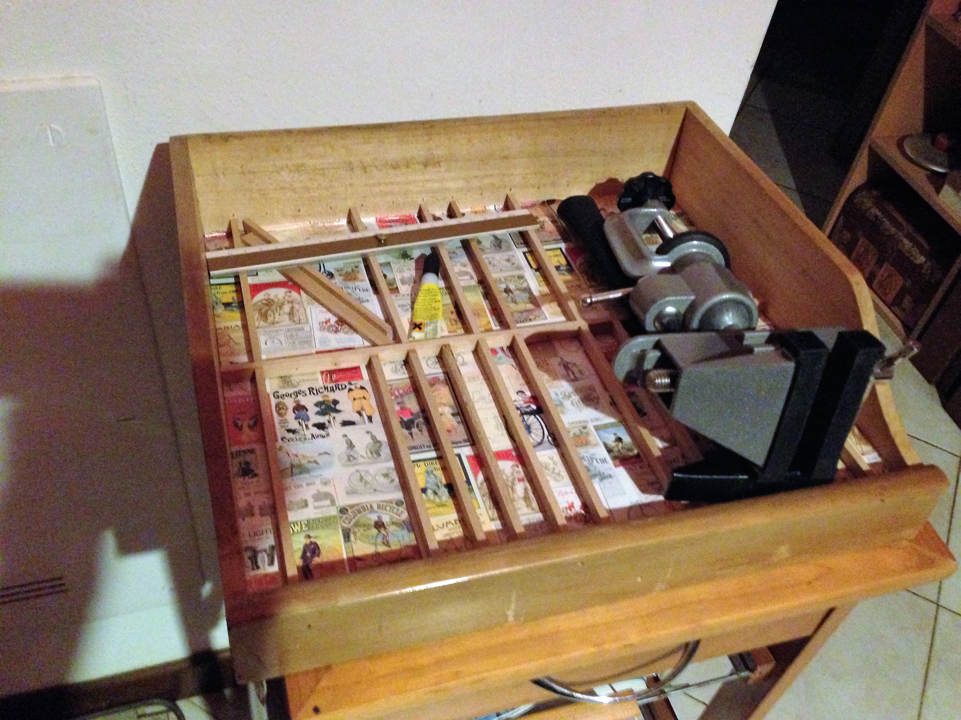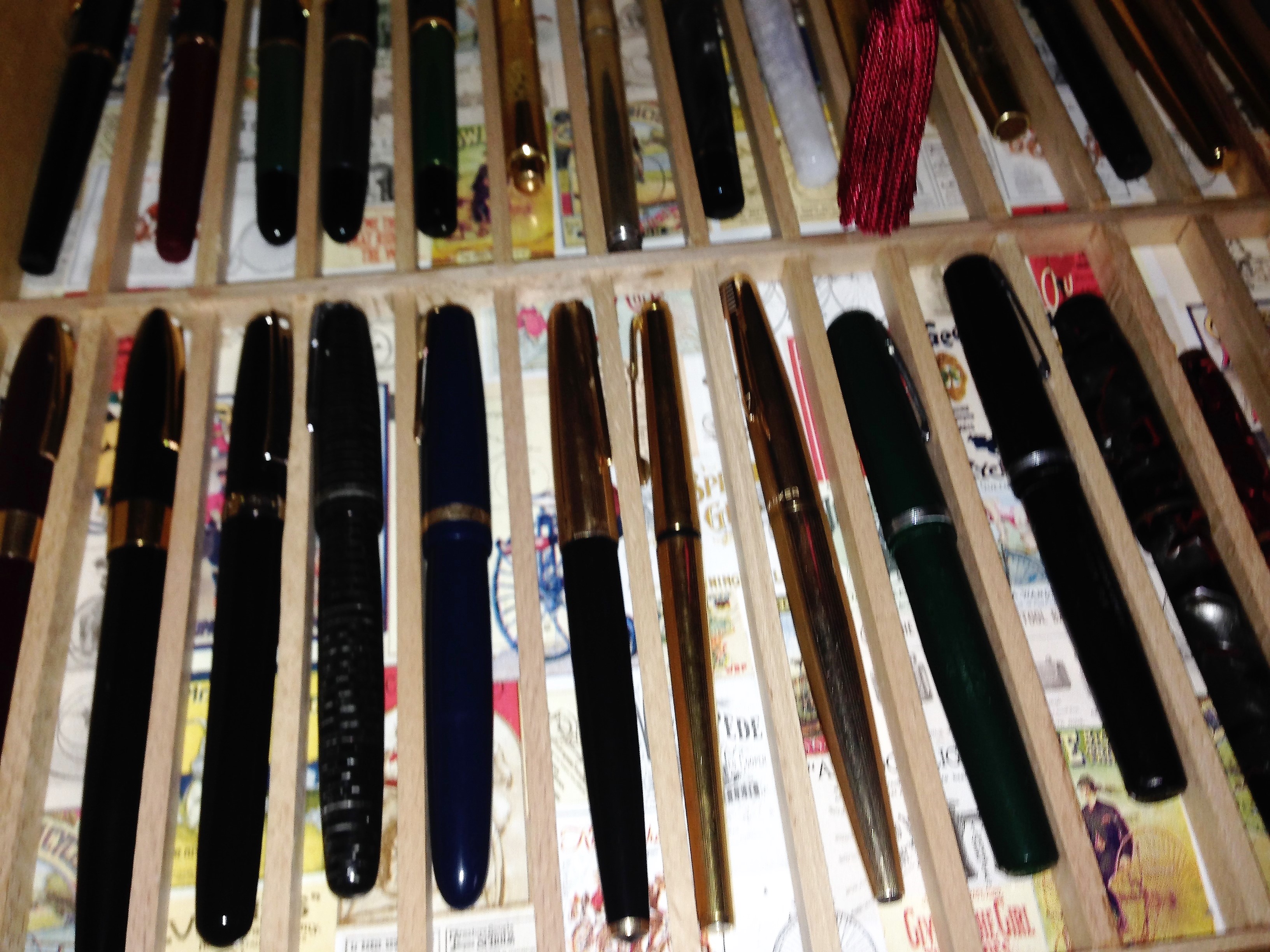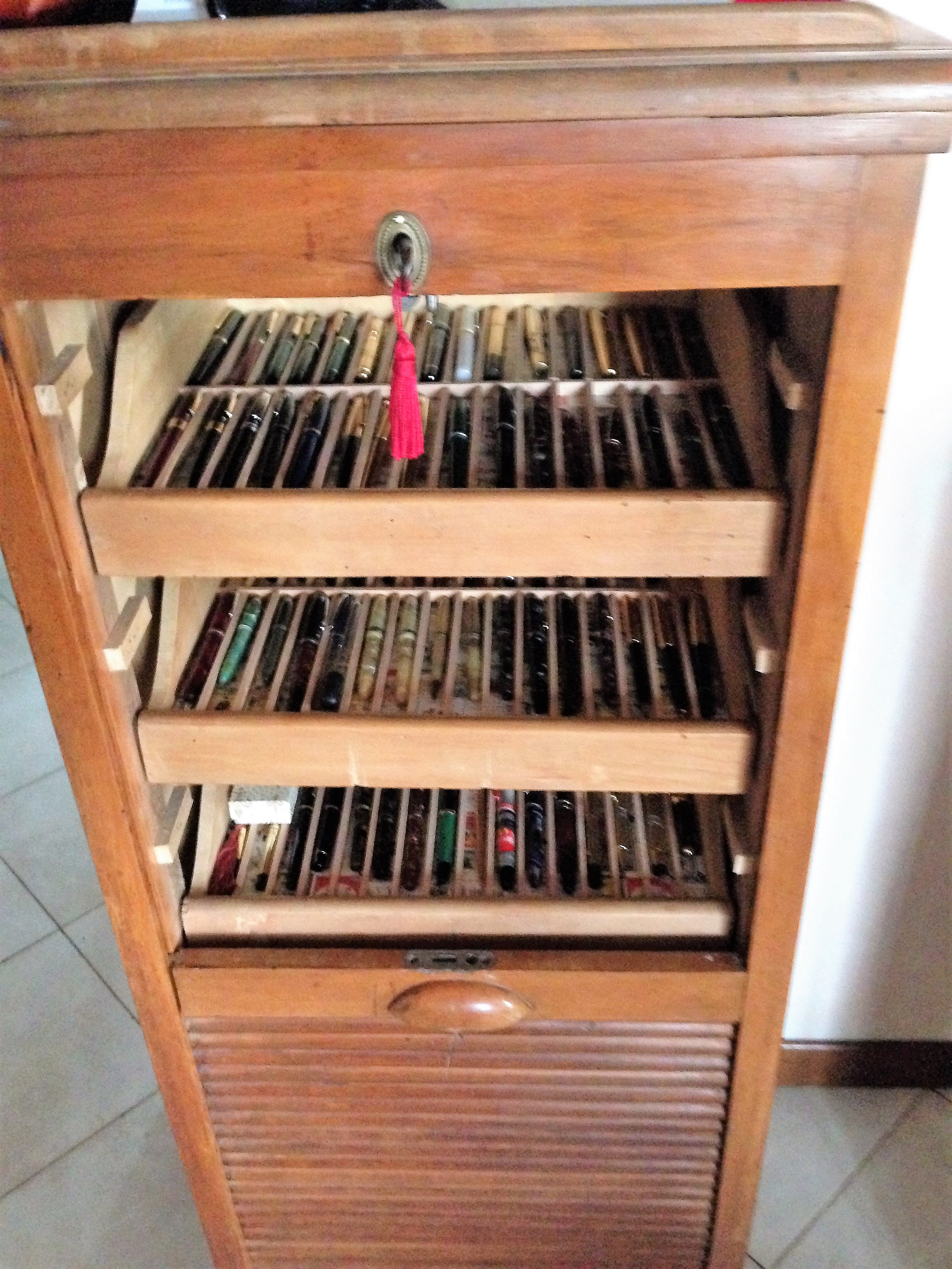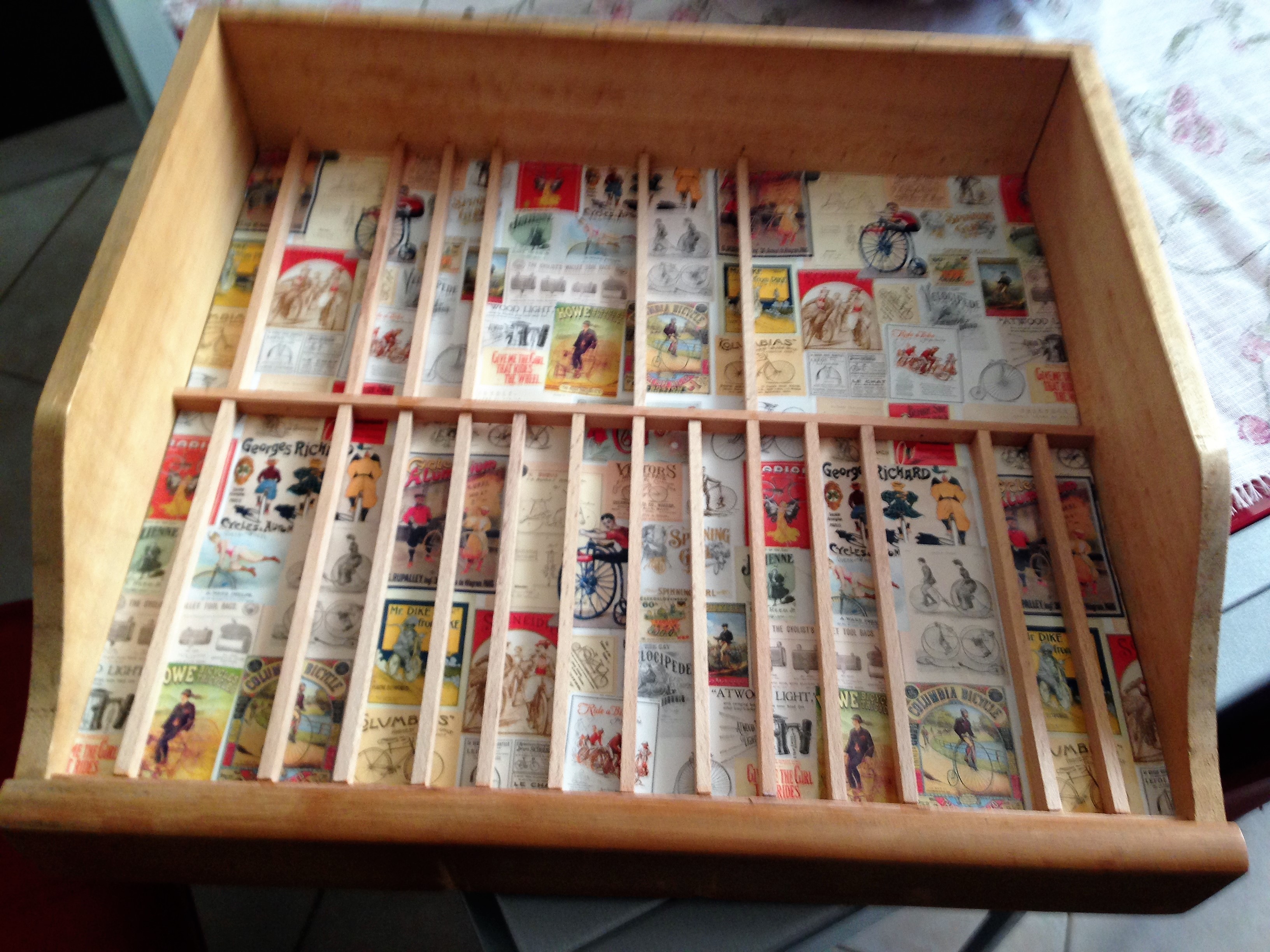 Avete ragione un altro fondo avrebbe fatto risaltare le penne, ma mi piaceva quella carta con le biciclette vintage, avevo provato con una seta pesante ma era troppo scura e poi viste le irregolarità dei cassettini sarebbe stato molto difficile farla aderire perfettamente al fondo senza contare che una goccia di attack caduta l'avrebbe rovinata subito.