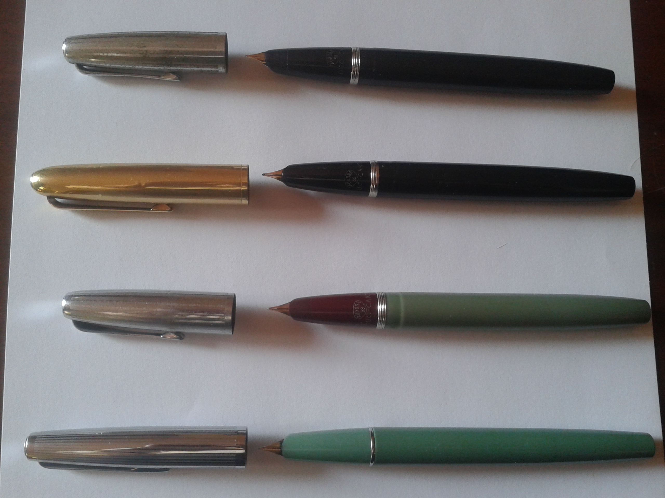Fra quelle fotografate solo l'ultima in basso NON ha l'allarme della riserva di inchiostro (ovvero della mancanza della seconda cartuccia), ed in effetti è più sottile e slanciata delle altre 3, con cappuccio più lungo ed anellino più sottile, pur conservando all'interno la cartuccera metallica ed utilizzando le medesime vecchie cartucce ad imboccatura larga.