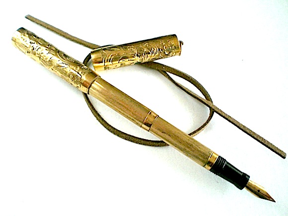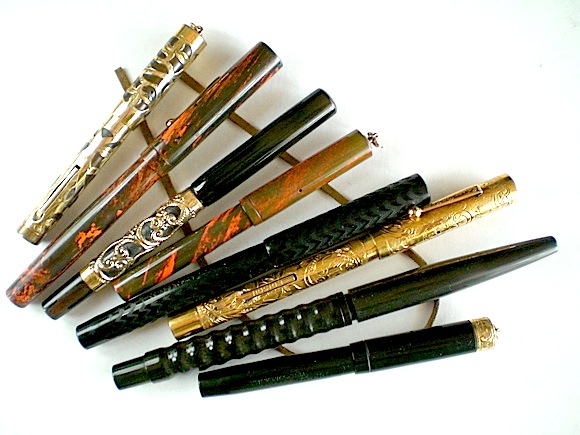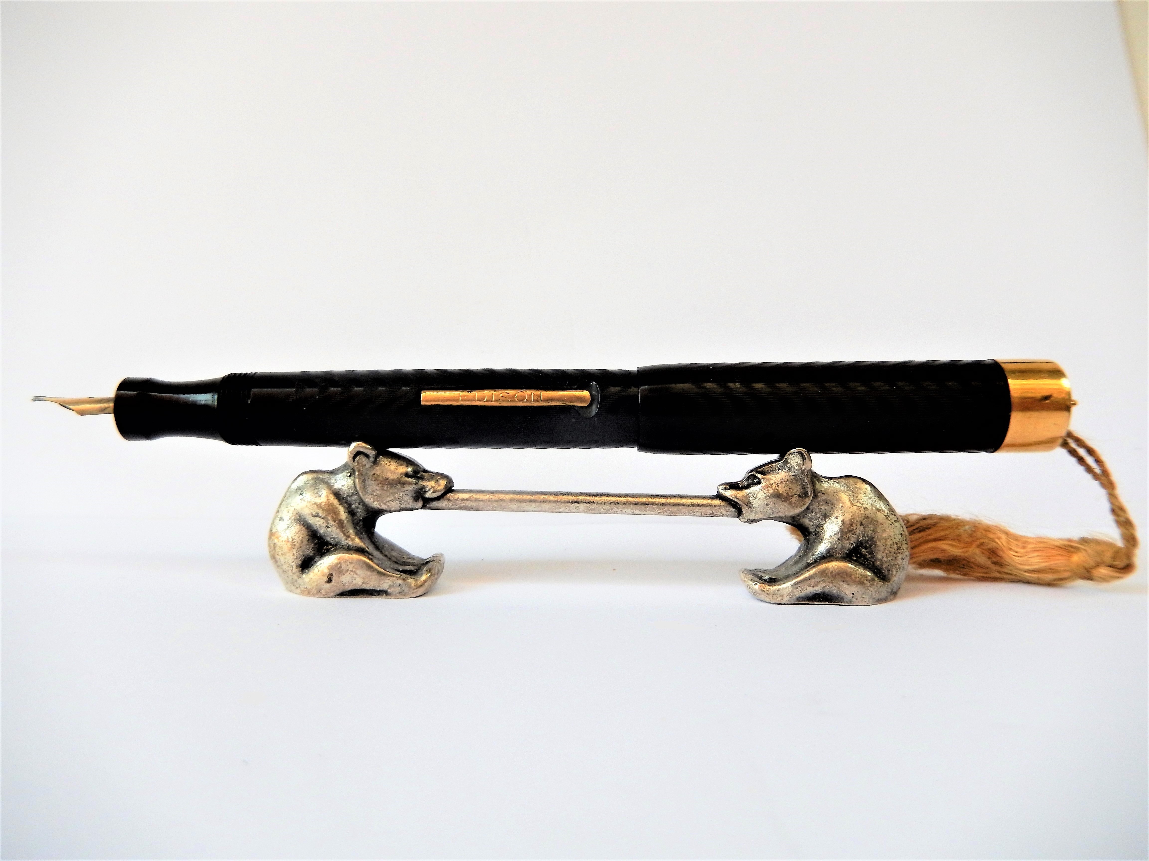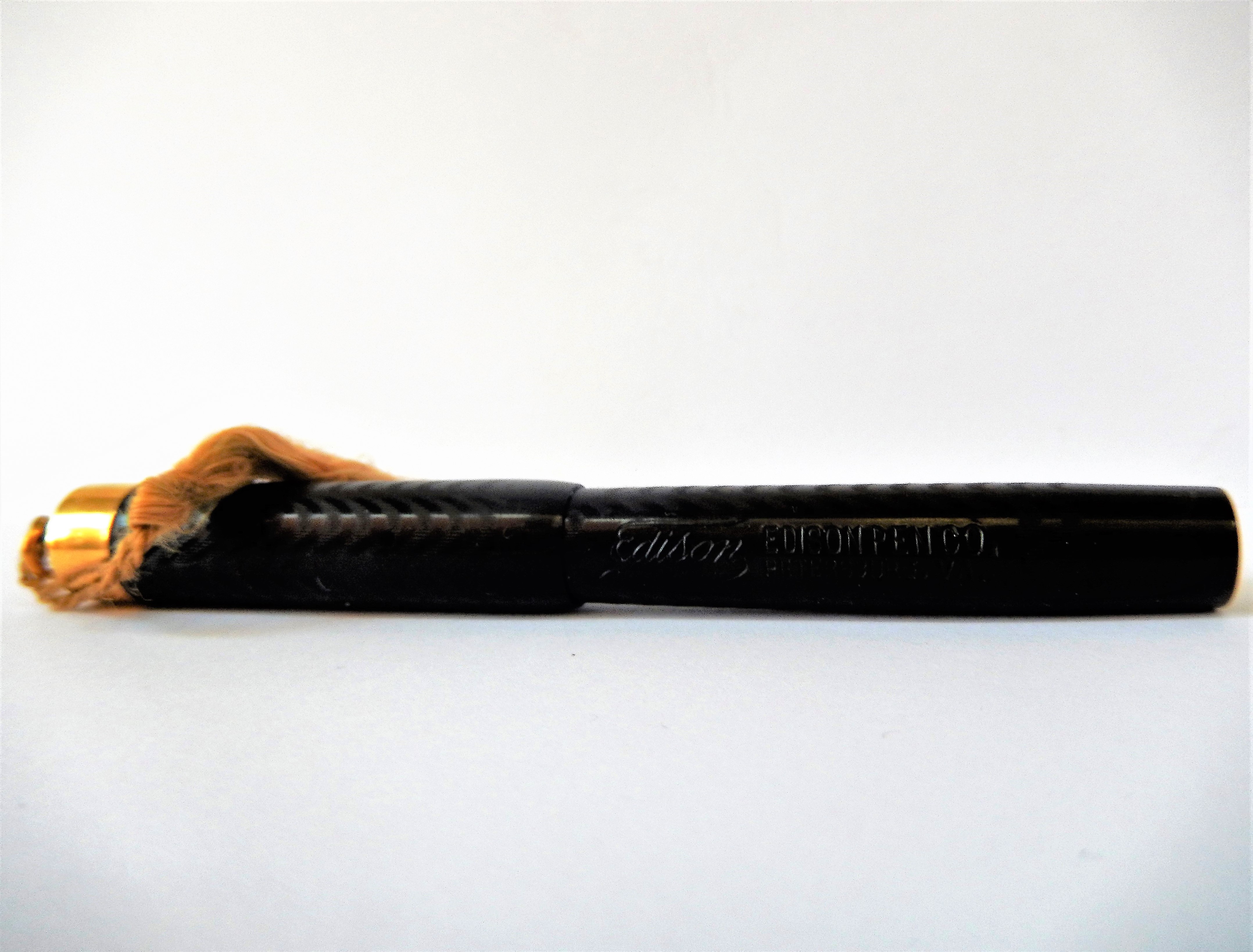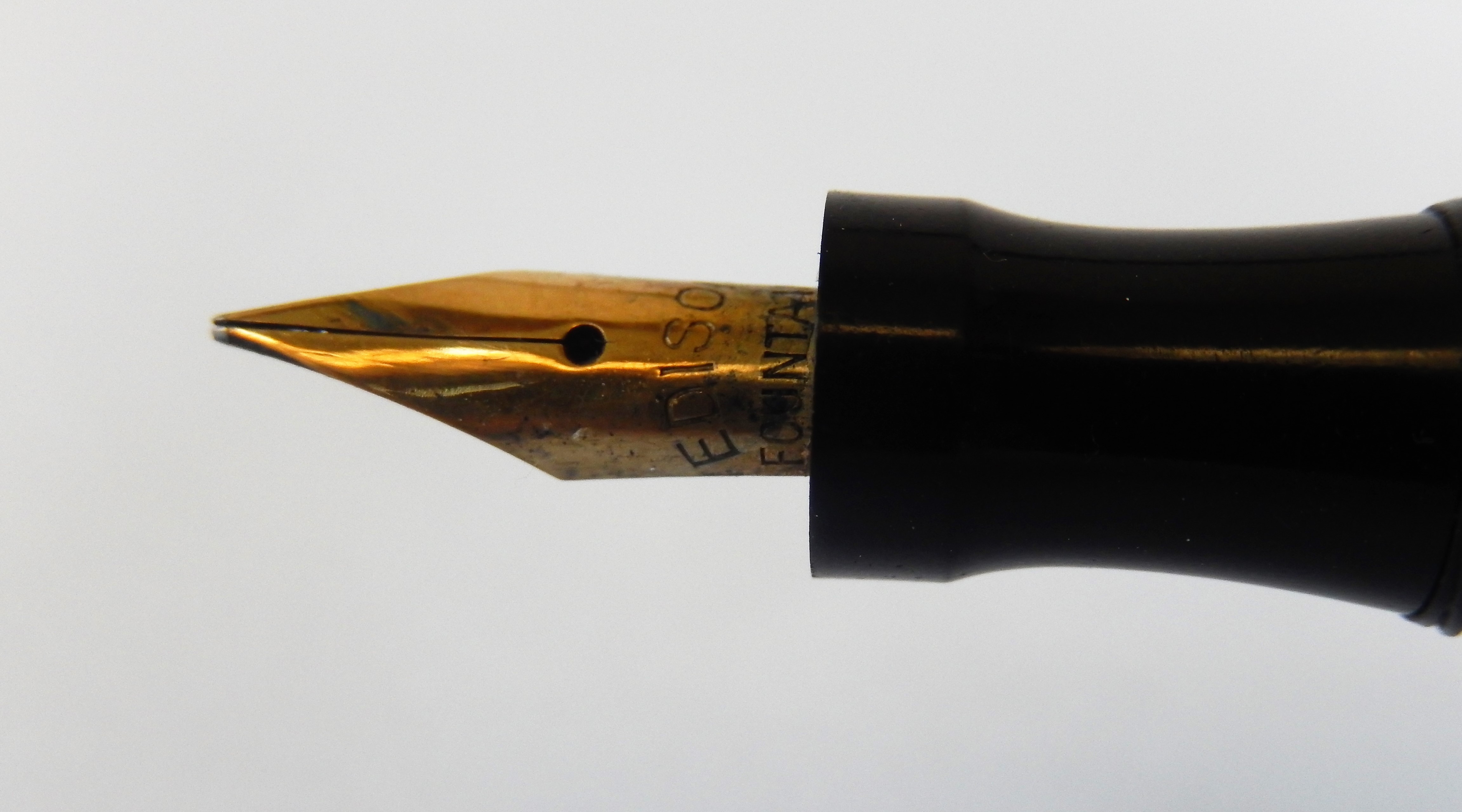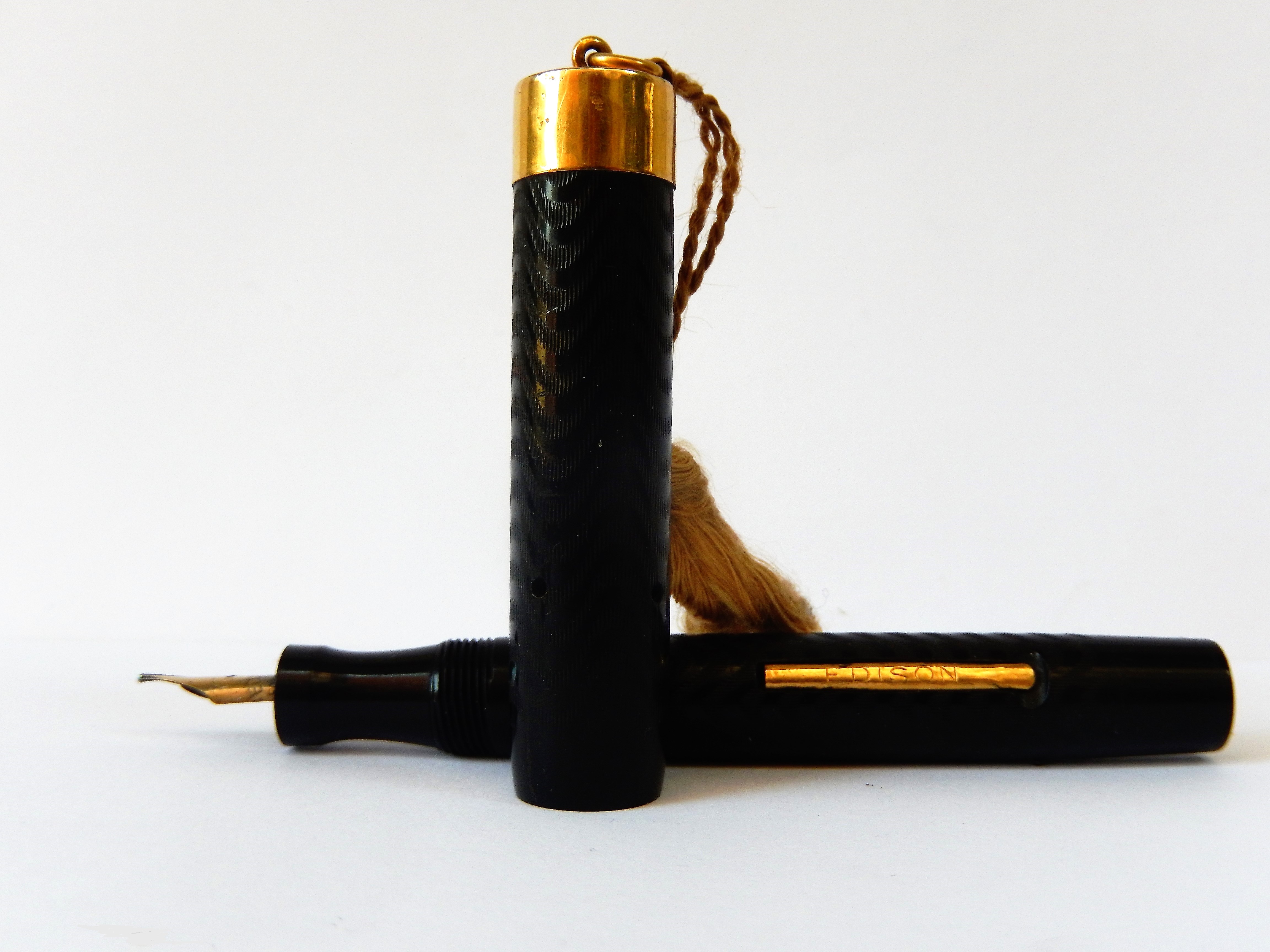 ]E' una lady con un caricamento a leva e lunga chiusa 11.3 cm, in una bella ebanite nera a festoni rimasta lucida e ben scolpita; altrettanto nitide le impronte sul corpo " Edison ( in corsivo) trade mark EDISON PEN.Co. PETERSBURG. VA."