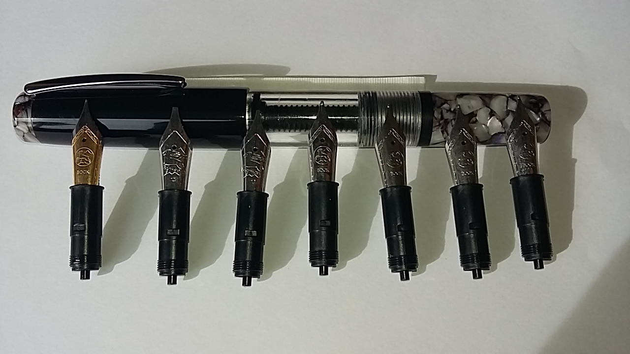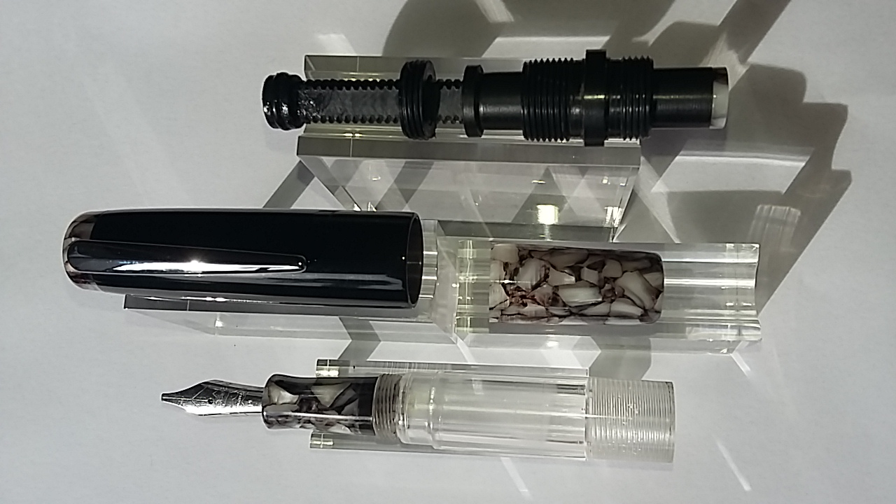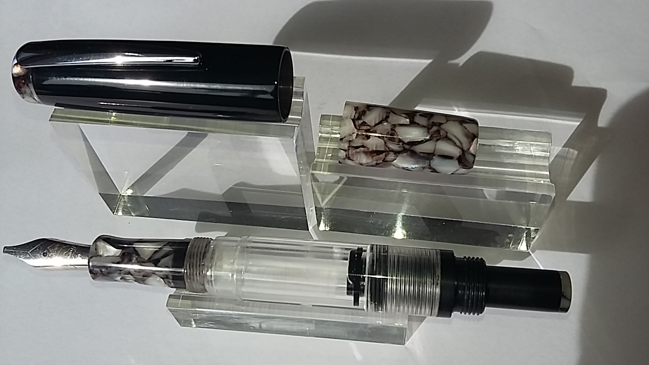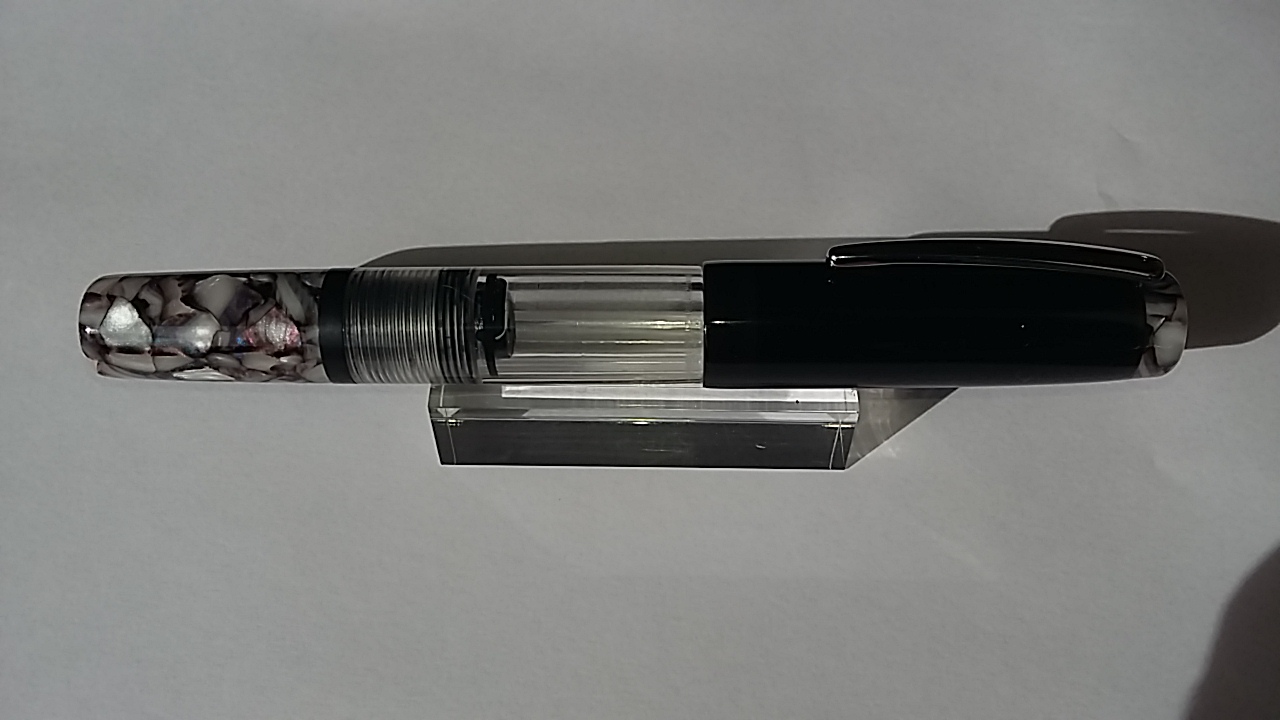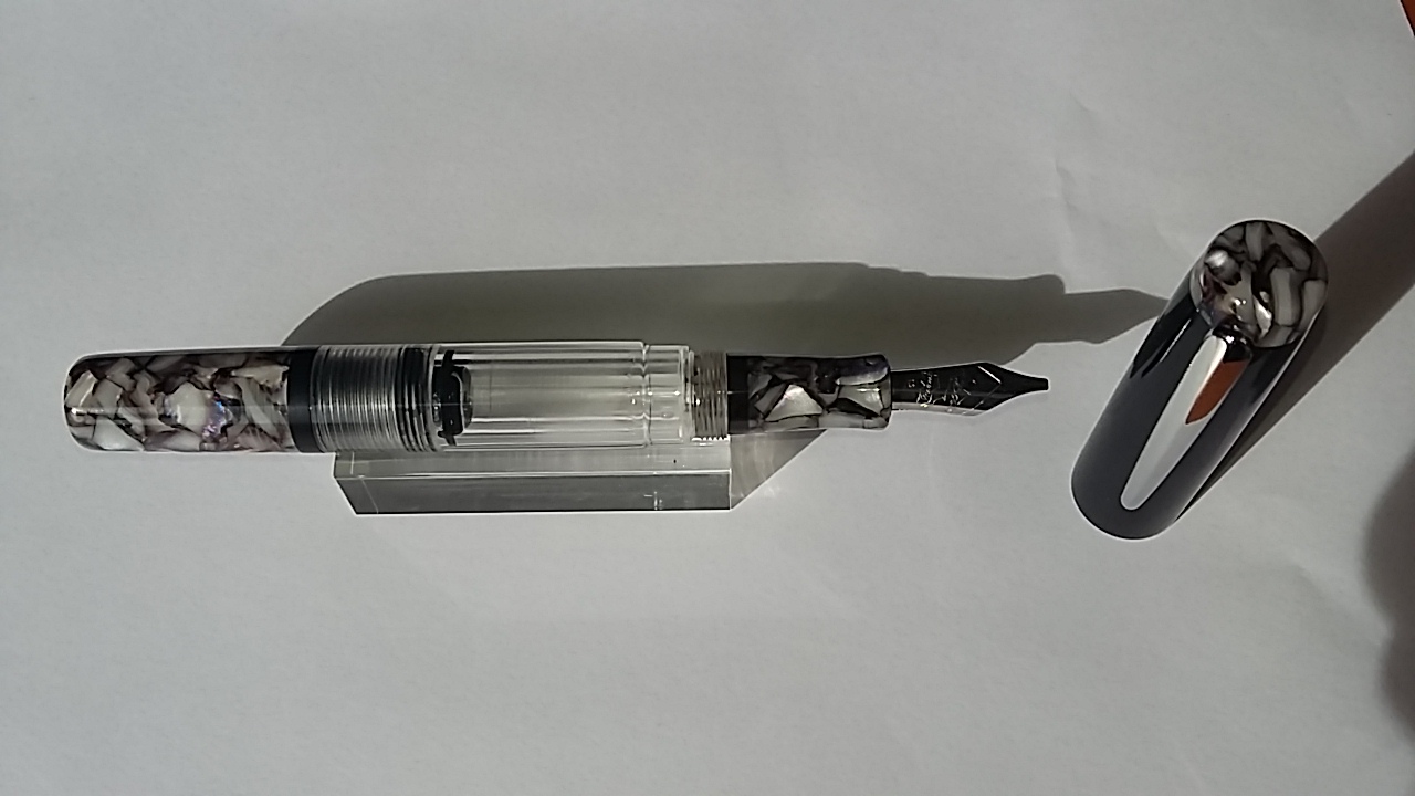 Invece per la parte estetica ho preso spunto dalla stilografica Wancher Crystal,a mio avviso una penna interessante dal punto di vista cromatico,perché partendo da una base cappuccio nero/corpo della penna trasparente, il resto della penna (sezione - fondello - fondello cappuccio) ci si può abbinare una vastità di colori.