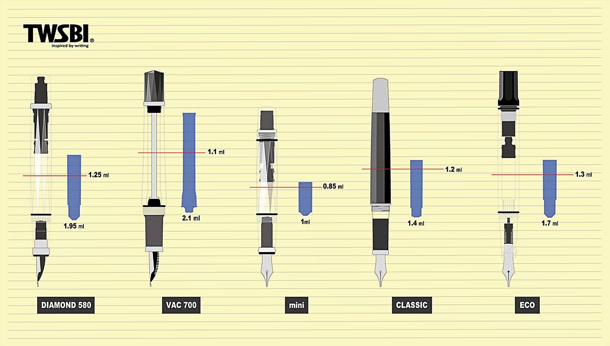 Se non sbaglio la Eco dovrebbe tenere 2ml di inchiostro, mentre le boccette vanno dai 30, 50, 60, 80... praticamente ogni produttore ha la sua misura.