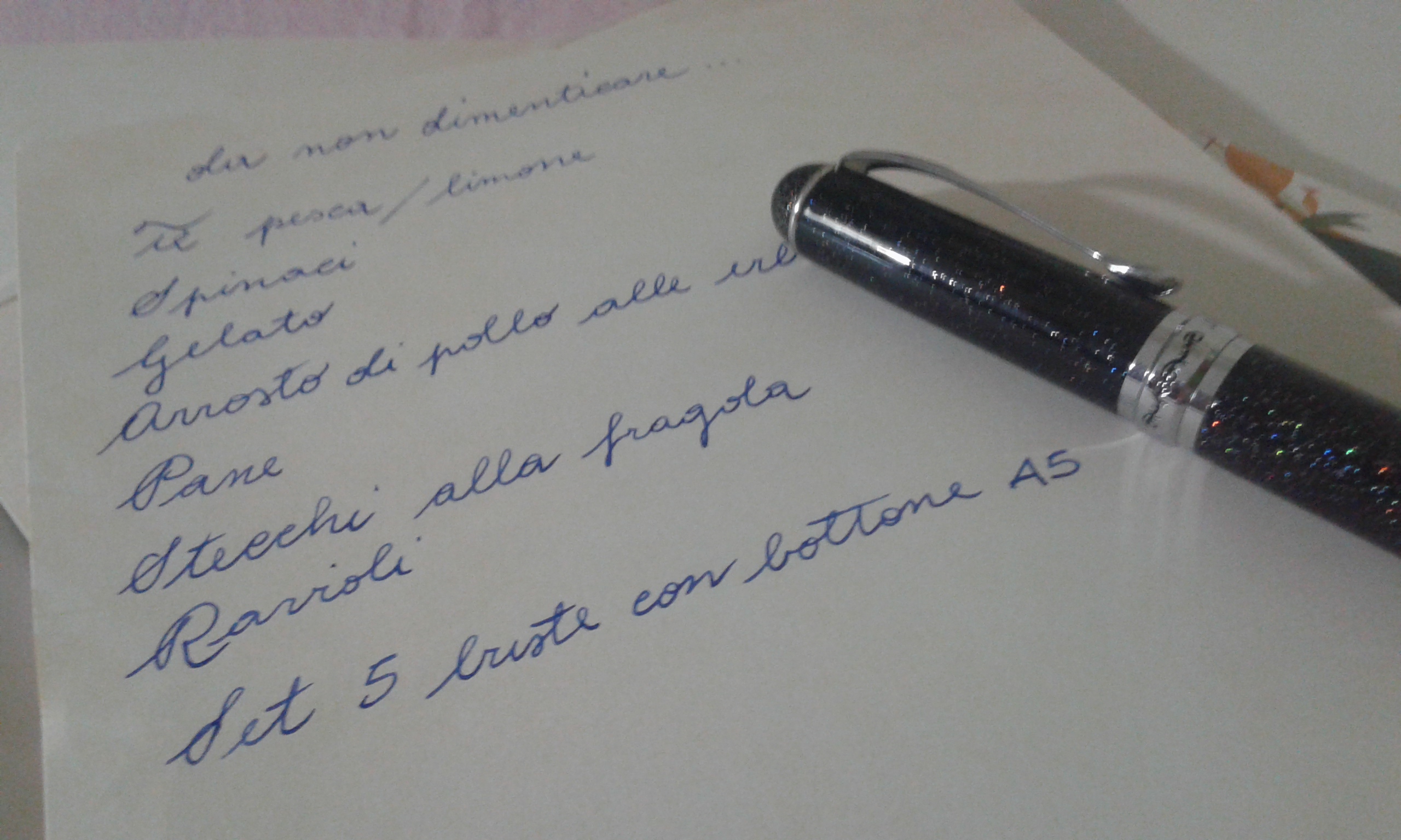 Ed ecco, con il mio semplice corsivo arricchito con qualche Capitale, neanche poi tanto precisa, la mini lista delle cose da non dimenticare della spesa del lunedì ! Ho usato una fantastica Jinhao x750 e il classico dei classici, il mai superato Royal-Blue Pelikan!