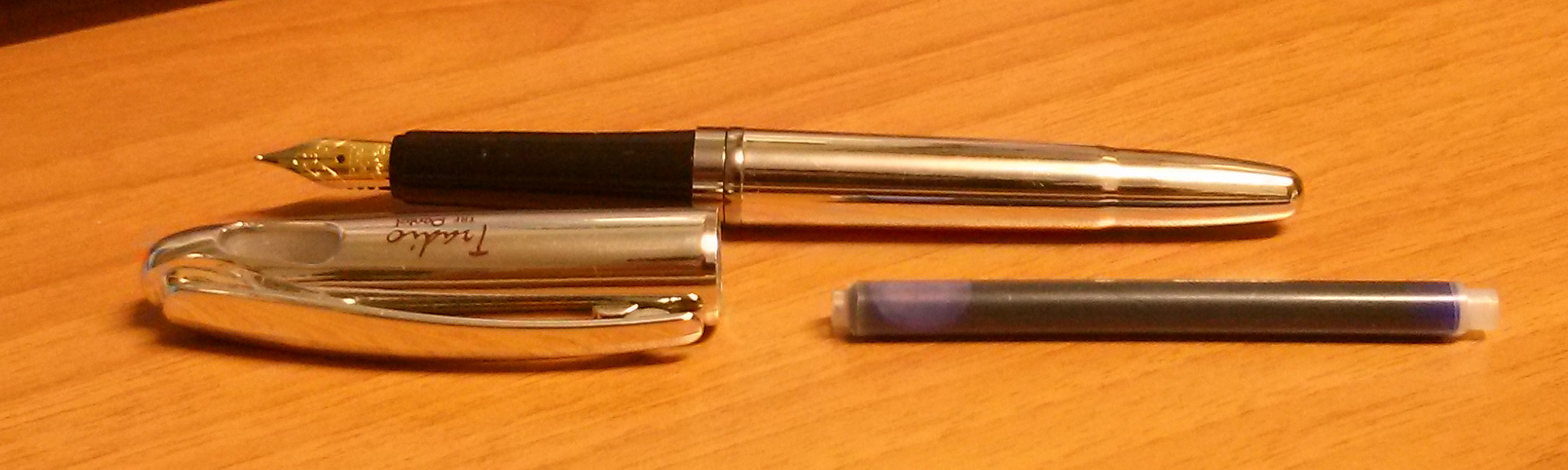 Mi è piaciuta subito, quando ho visto "Japan" sul fusto e le finiture simil-oro del pennino ancora di più! In dotazione c'era una cartuccia lunga col doppio attacco Pelikan-Lamy, anche se questa segue lo standard internazionale Pelikan. L'aspetto è plasticoso, molto leggera, la finitura cromata magari si deteriorerà, ma mi sembra un buon prodotto per la fascia di prezzo.