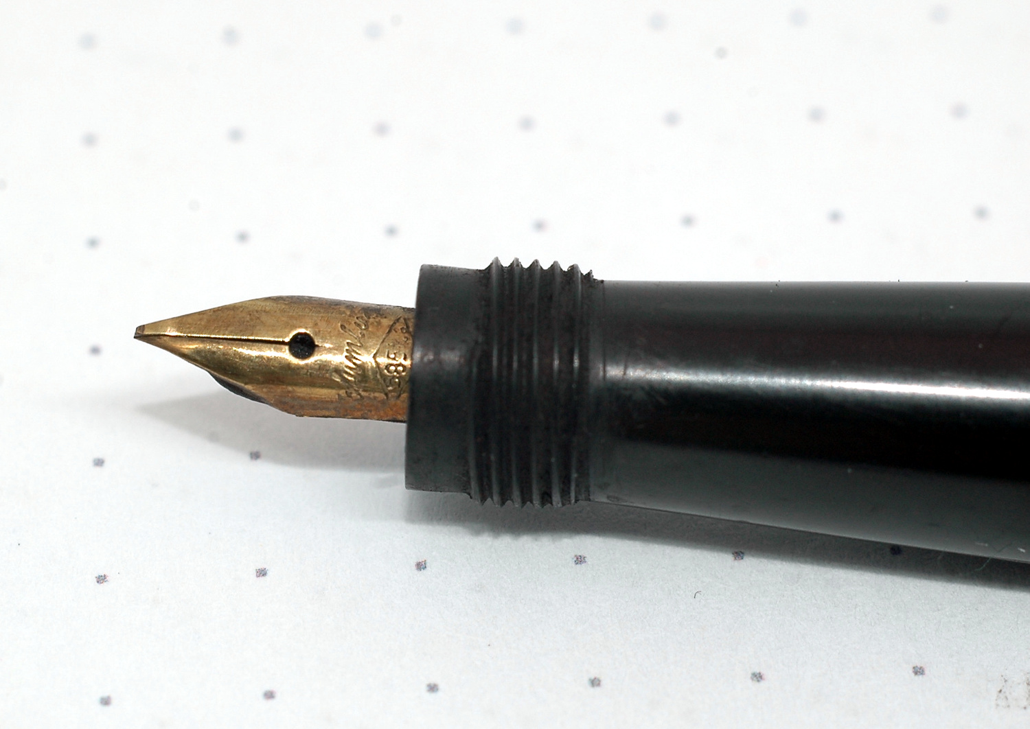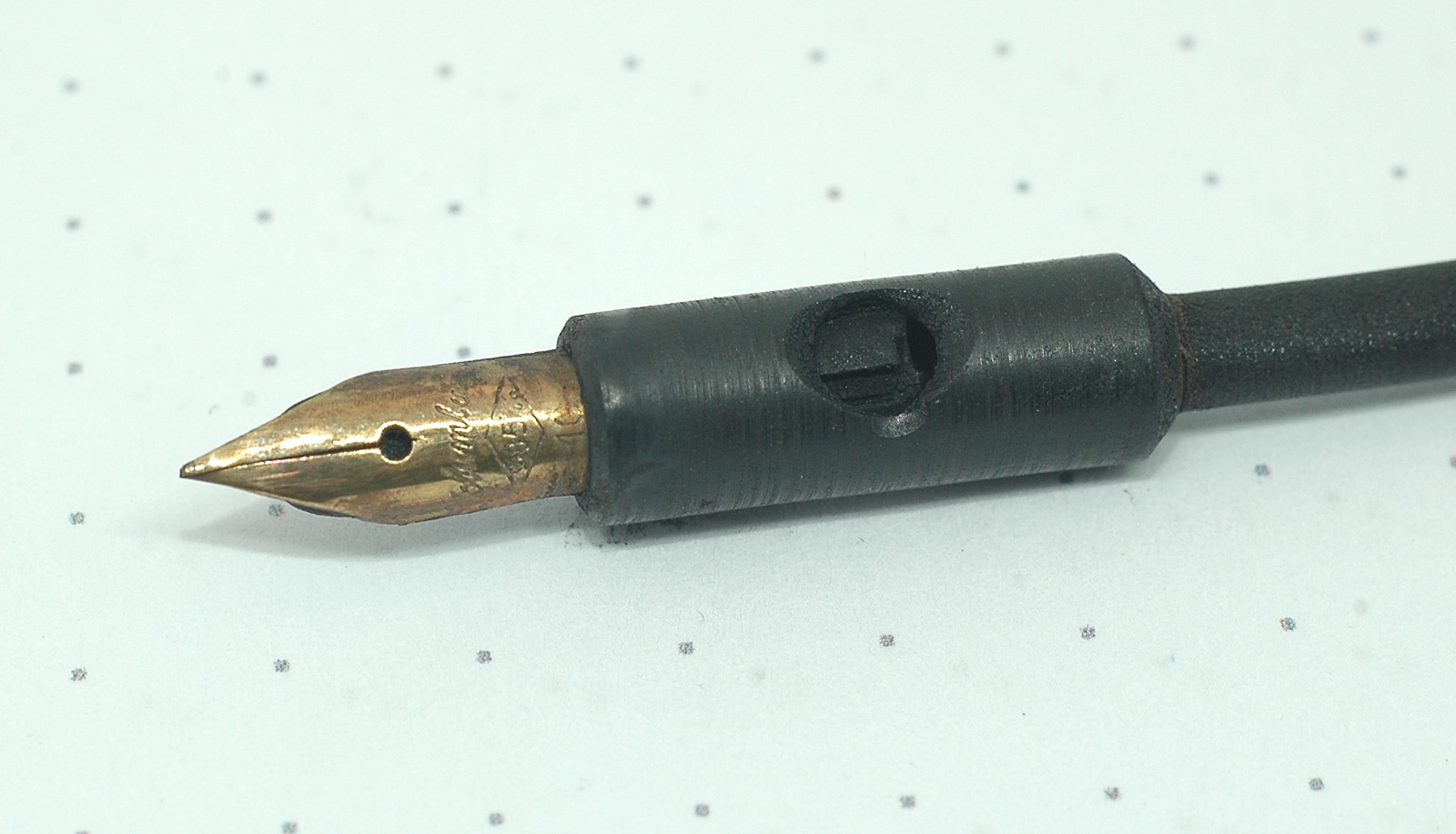 Inoltre mi sembrerebbe che pennino ed alimentatore siano infilati troppo a fondo nella sezione (o come si chiama il pezzo in cui è infilato alimentatore e pennino). Infatti nella seconda foto dall'alto (qui sopra) si nota che il foro laterale della sezione è tutto "riempito" dalla coda dell'alimentatore, mentre in foto di altre penne quel foro mi appariva vuoto. Inoltre il pennino tutto estratto sembrerebbe spuntare troppo poco: