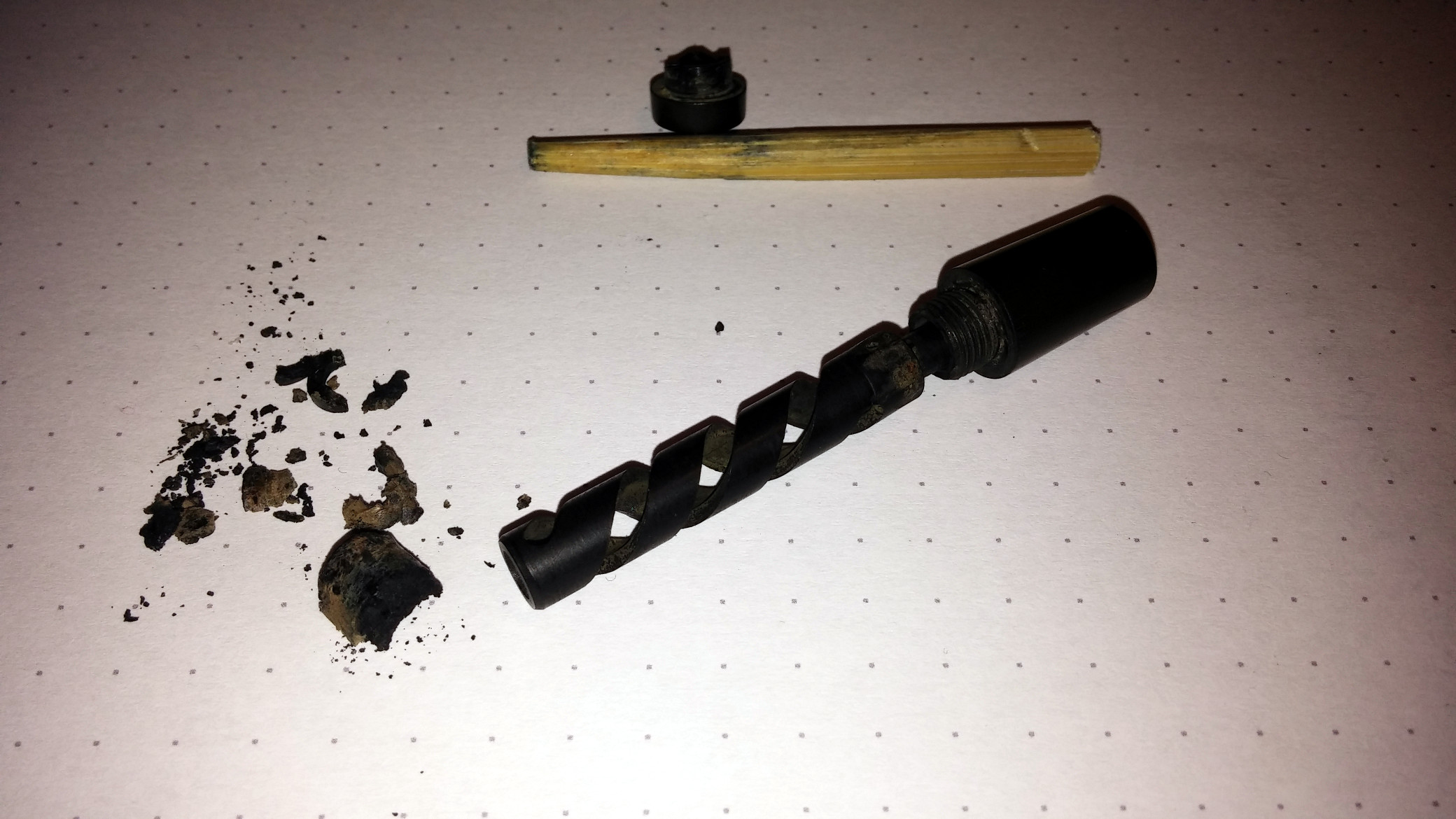 A destra invece il fondello con alberino e tortiglione (elica? Comelochiamatevoi?) che più di così non riesco a smontare. Sembrerebbe che ci sia un piolino metallico nella parte dell'alberino che sta dentro al fondello e che prima si trovava nel sughero.