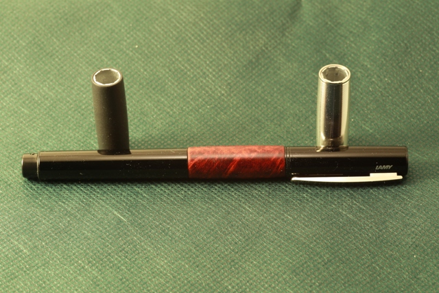 Ho preso come si vede nella prima foto anche due "corpi" rimobili aggiuntivi, uno in gomma morbida che da una presa eccezionale, l'altro in acciaio inox, oltre a quello briarwood che era già montato. Nella euforia della chiusura mi hanno regalato anche un pennino F mentre quello montato è un M.