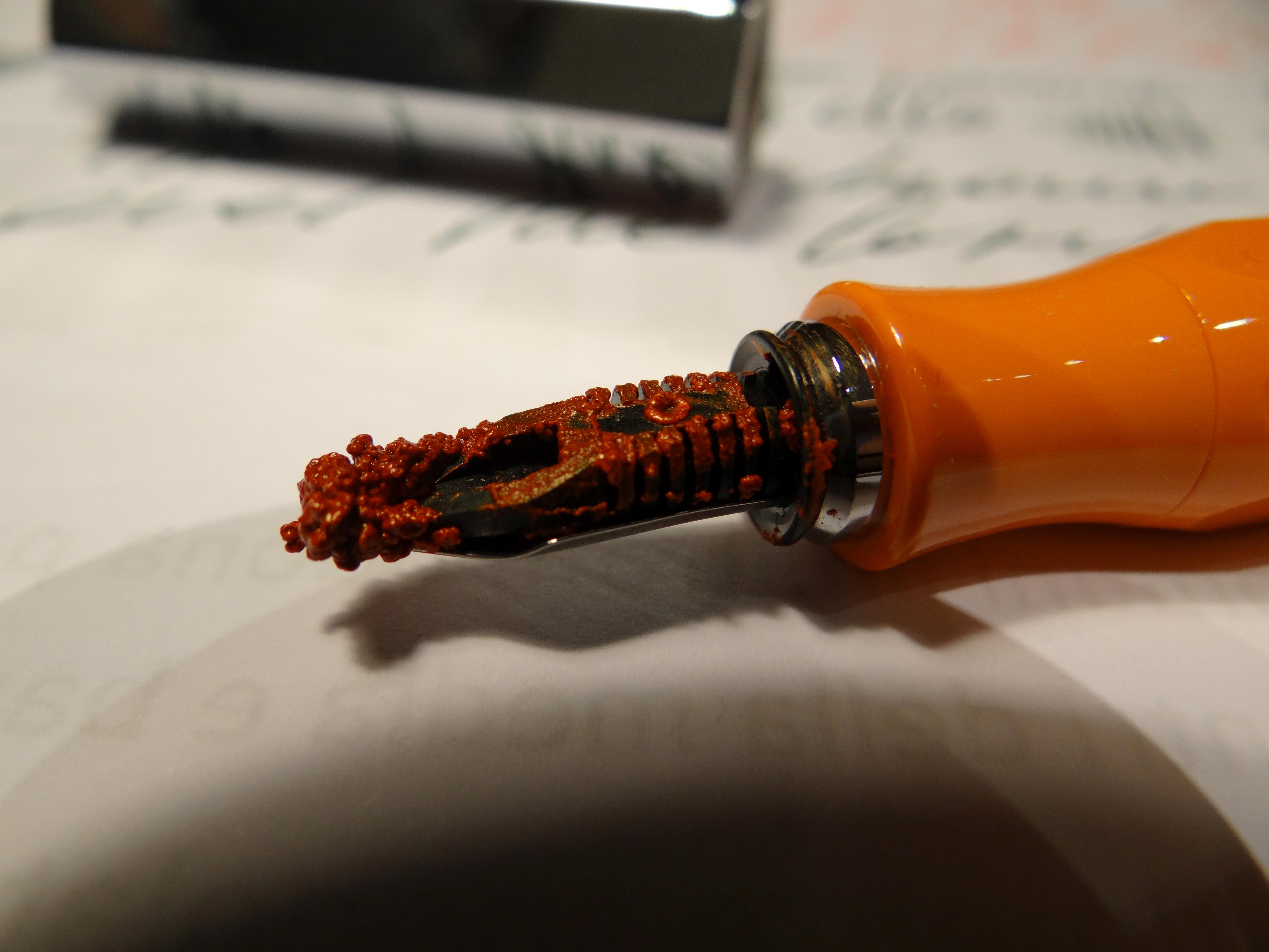 E' capitata la stessa cosa pure a me! Una volta con il Diamine Oxblood, e l'altra con il KwzInk green#5. In entrambi i casi le penne caricate erano inutilizzate da un pò(una settimana... due? forse di più..... non ricordo...)e in entrambi i casi le penne sono sopravvissute... un bel lavaggio e son tornate come nuove! Ovviamente prima di ricaricare quegli inchiostri è passato qualche tempo...