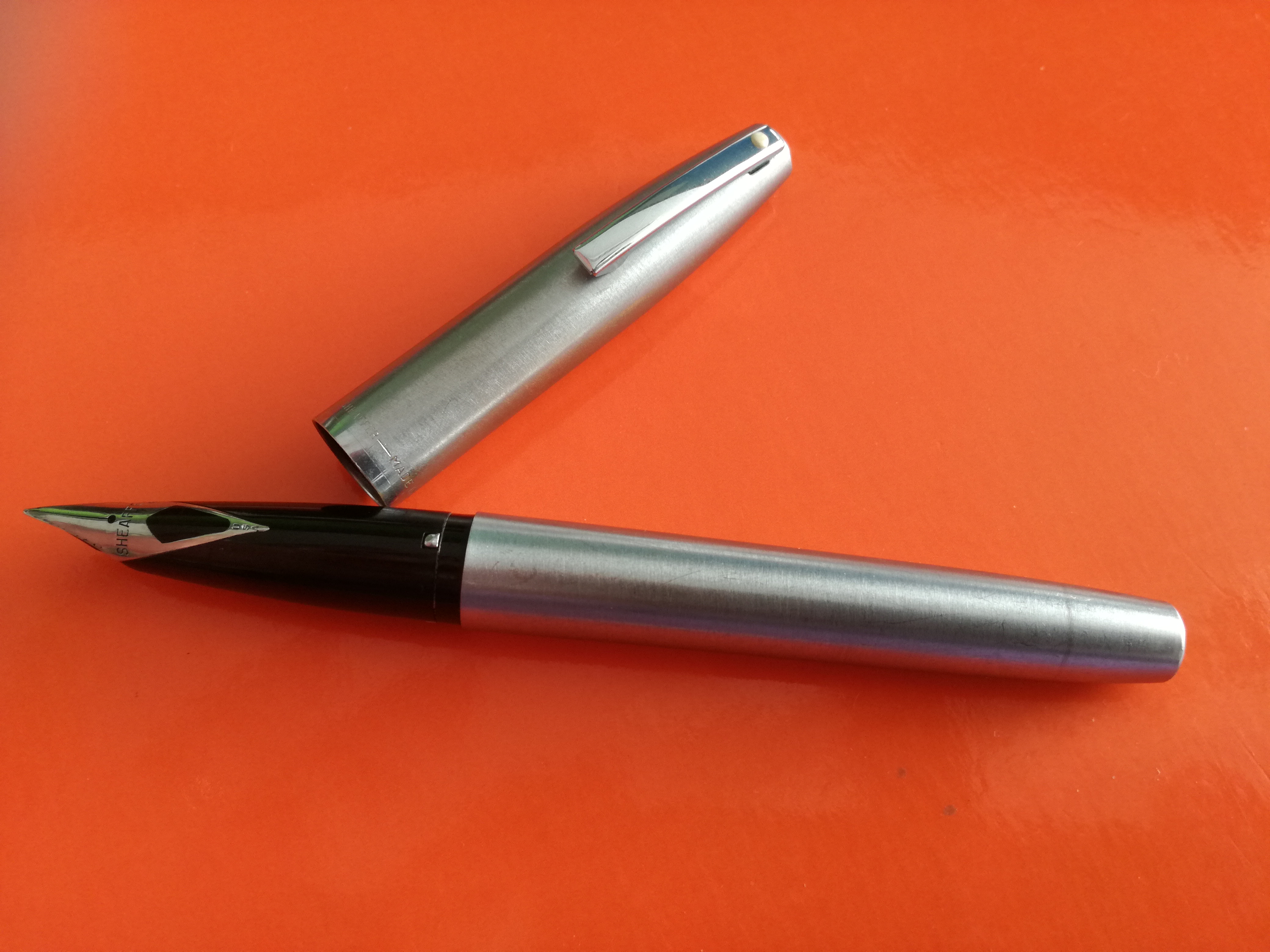 Tipici pennino (M) Sheaffer, rigido ma molto "liscio" e scorrevole. Su Internet il materiale viene definito "steel", "brushed steel", "chromed steel" e così via.