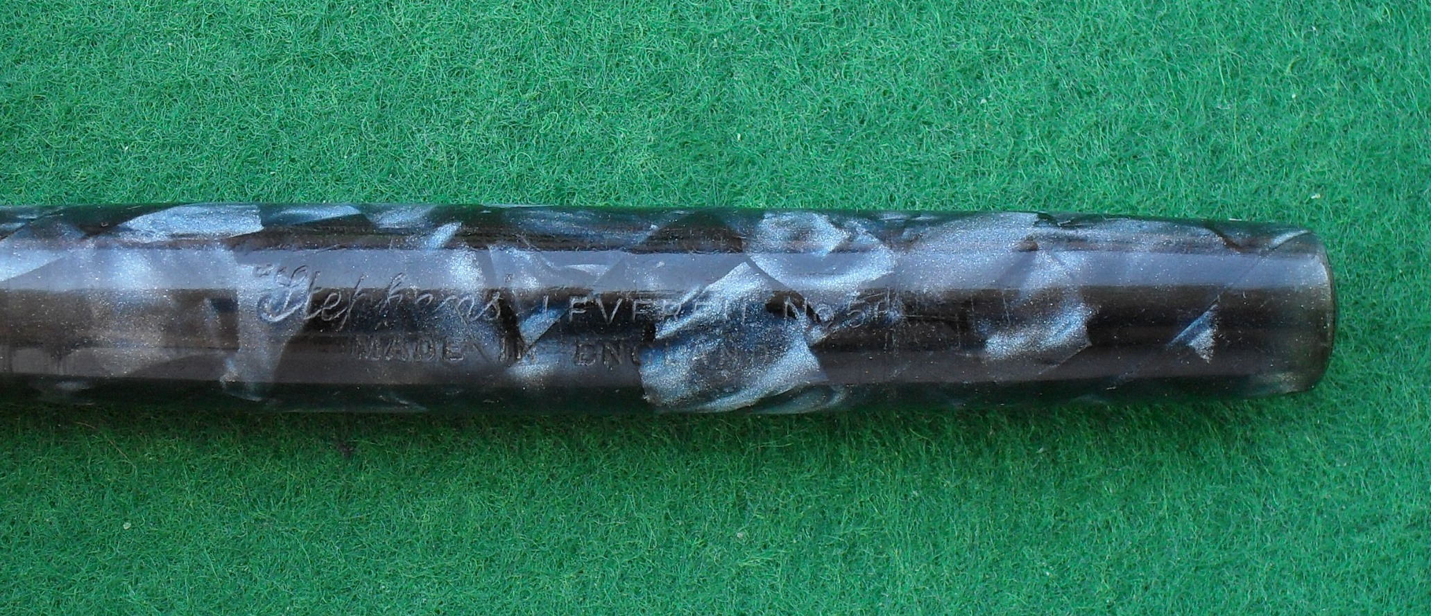 Corpo, sezione e cappuccio sono in celluloide, mentre il disco del fondello ed il tassello del cappuccio sono d’ebanite. Il corpo riporta l’incisione seguente, su due livelli: “Stephens’ Leverfil No 56” – Made in England.