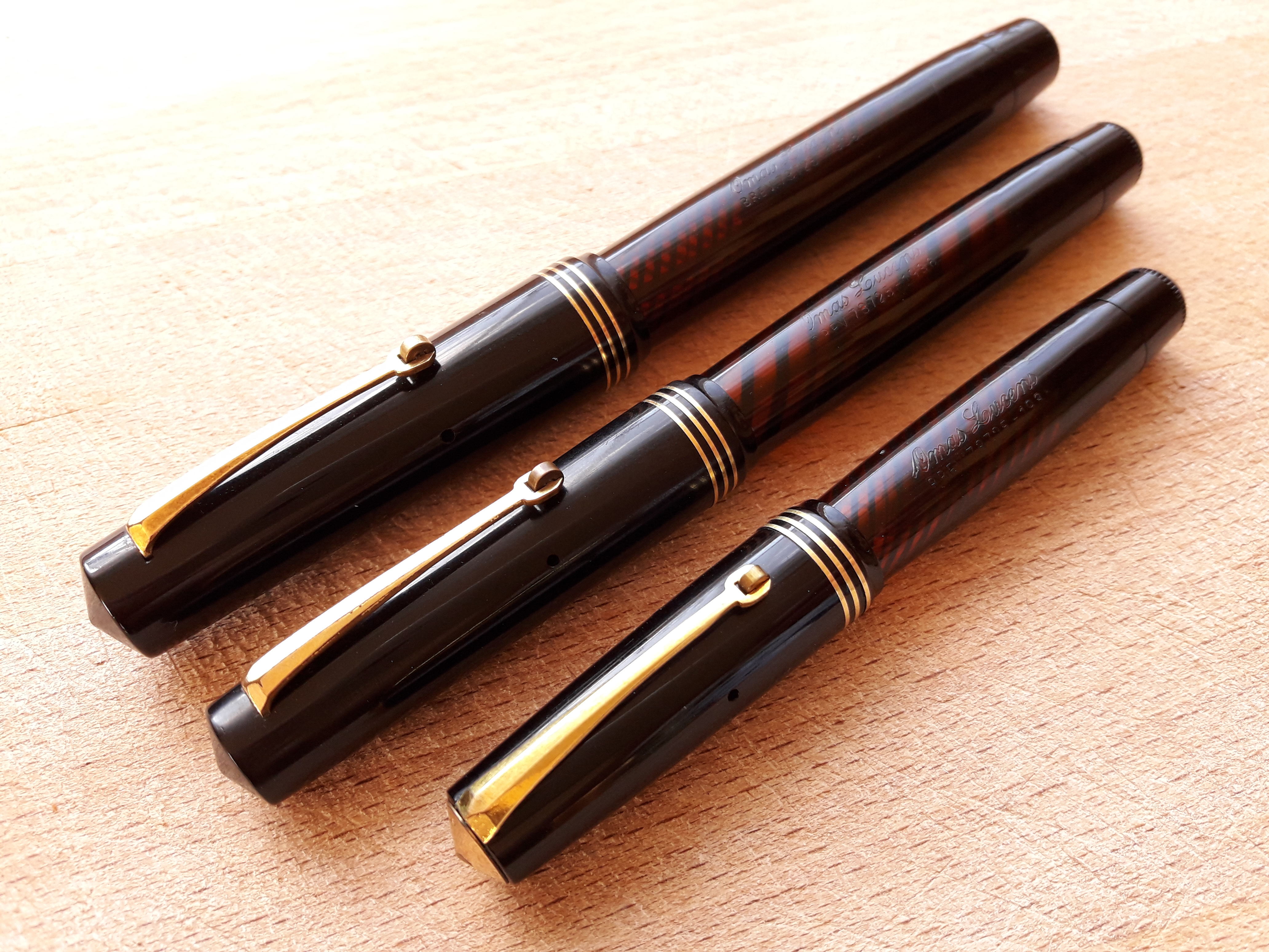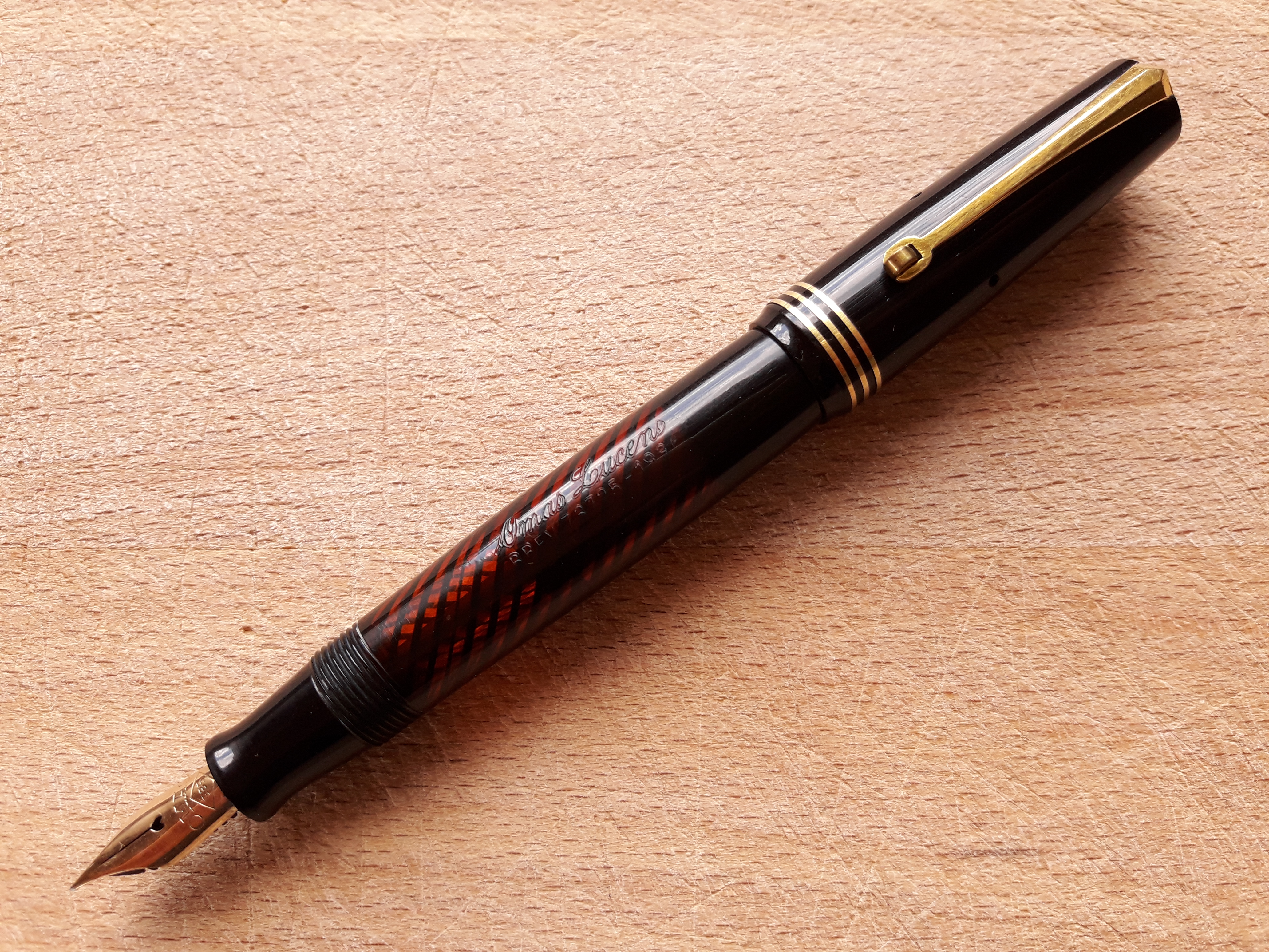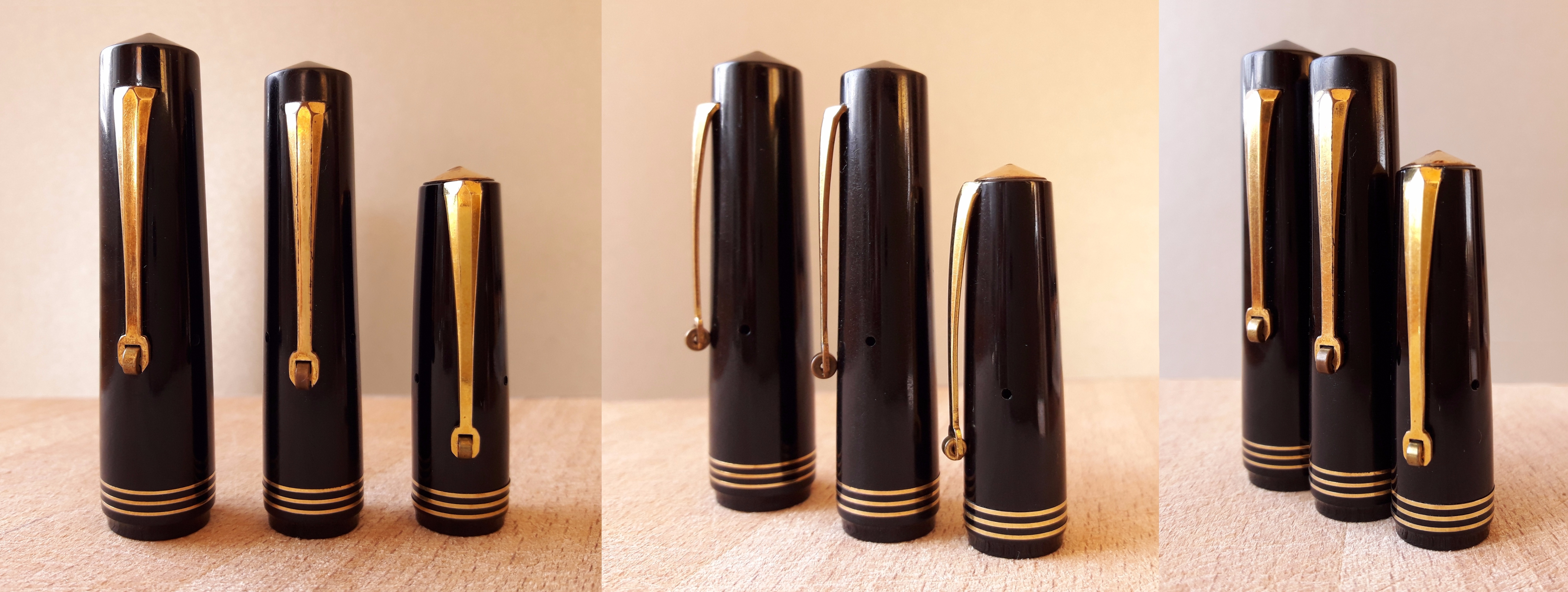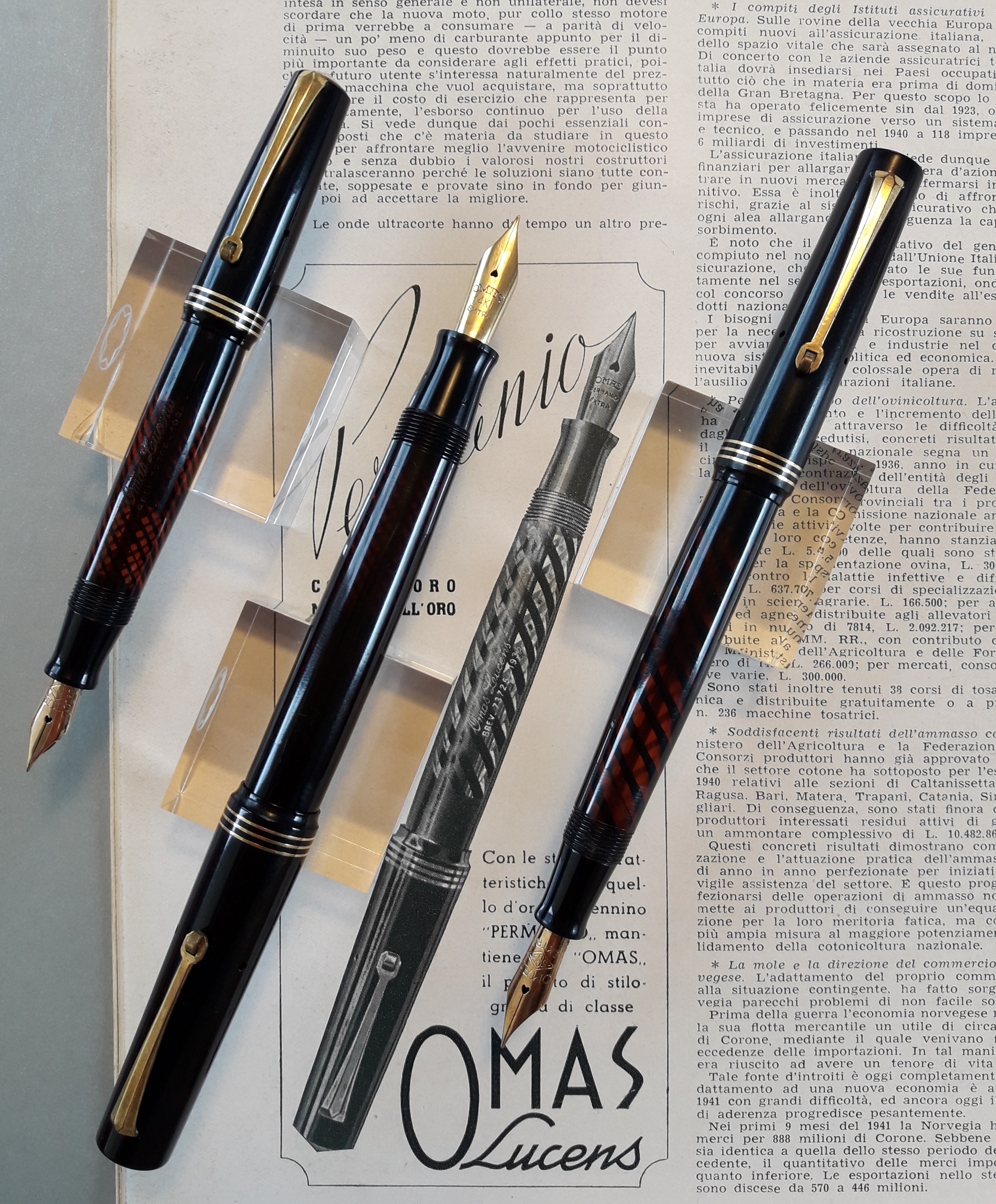 OMAS LUCENS IIa serie 1938 nelle tre misure (grande, media e piccola), in celluloide nera e semitrasparente “red spiral” tornite da barra piena, pennini Omas Extra in oro 14 carati, parti metalliche a vista laminate in oro, caricamento a stantuffo tuffante, prodotte in Italia nel 1938.