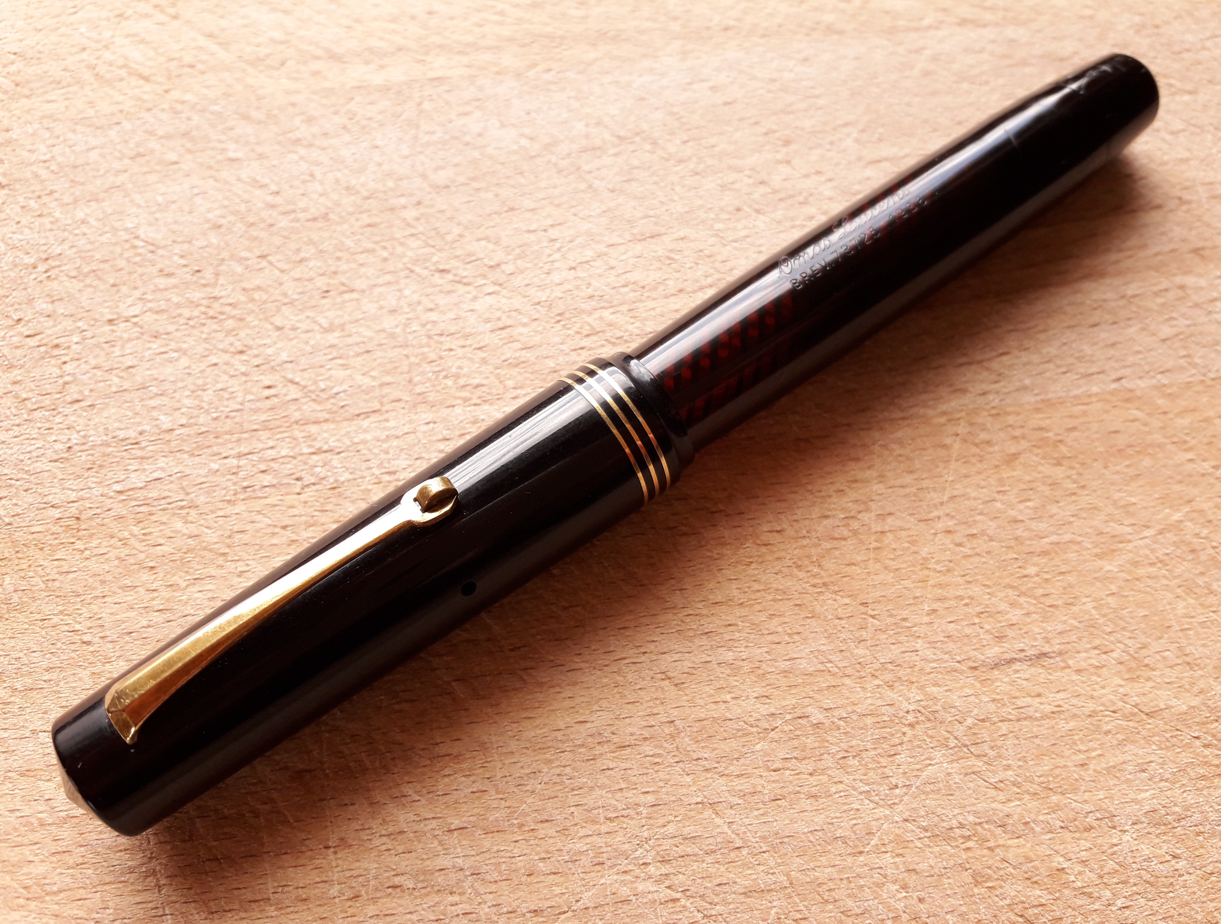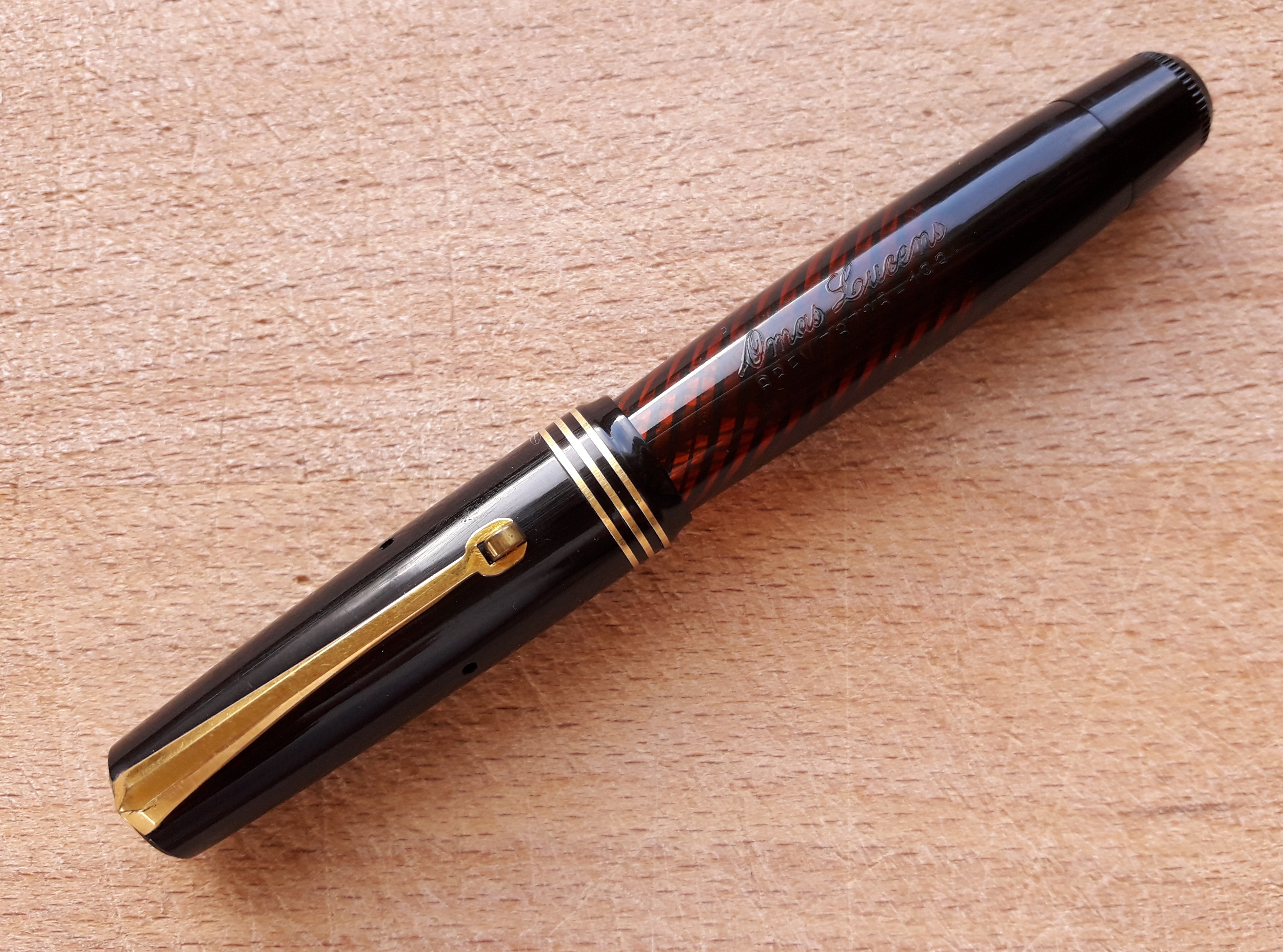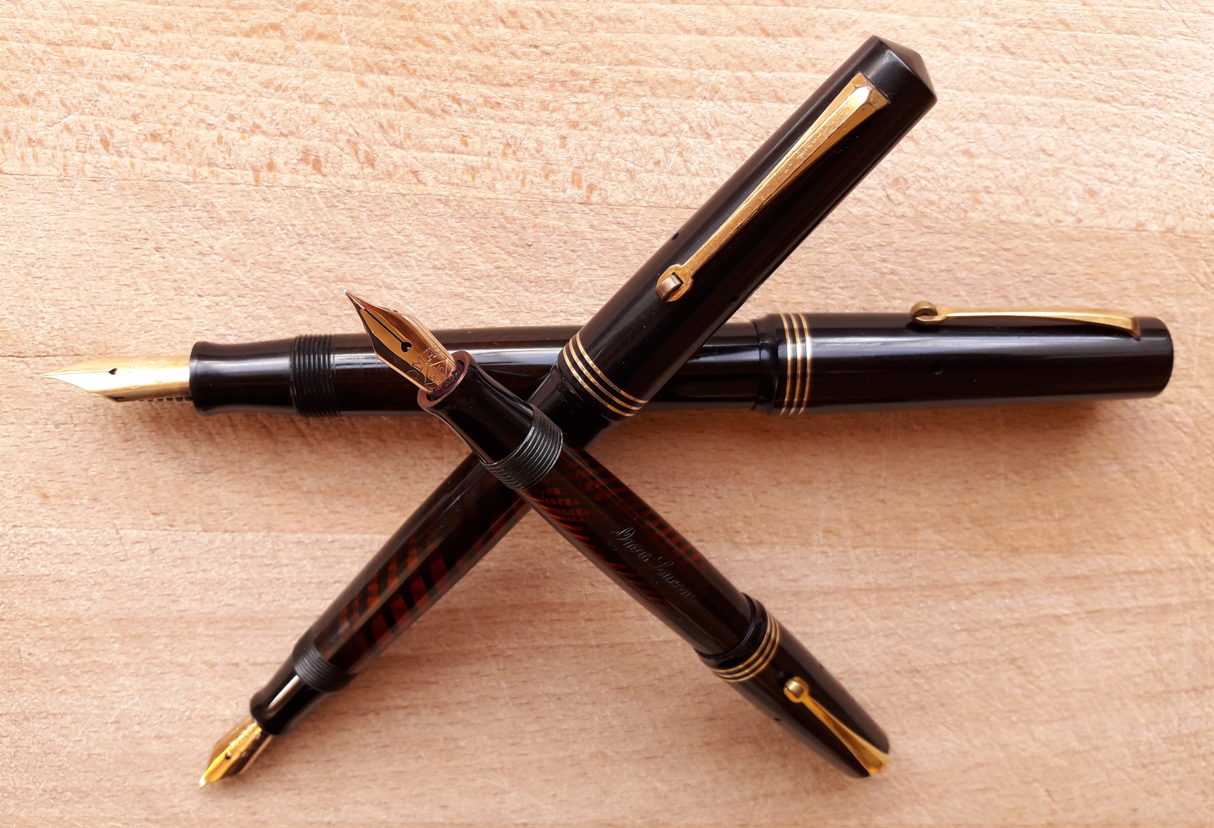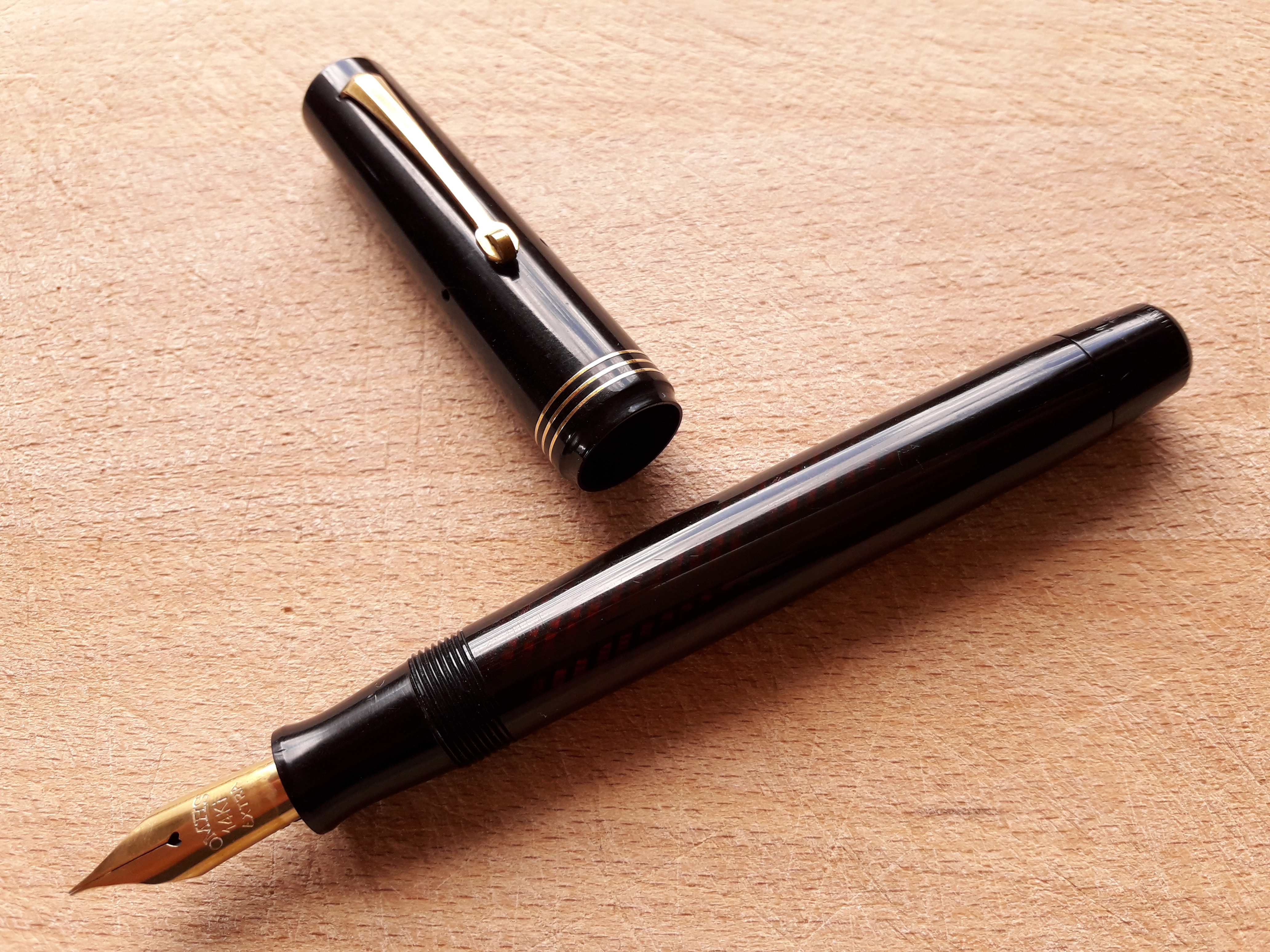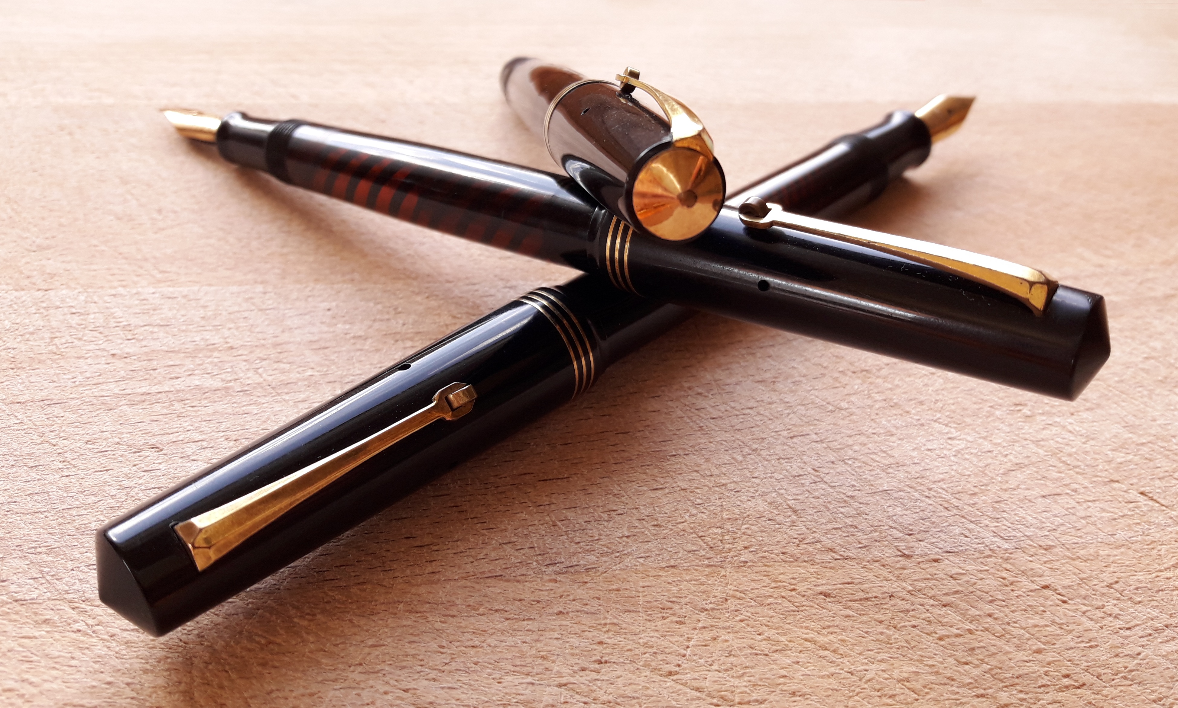 OMAS LUCENS IIa serie 1938 nelle tre misure (grande, media e piccola), in celluloide nera e semitrasparente “red spiral” tornite da barra piena, pennini Omas Extra in oro 14 carati, parti metalliche a vista laminate in oro, caricamento a stantuffo tuffante, prodotte in Italia nel 1938.