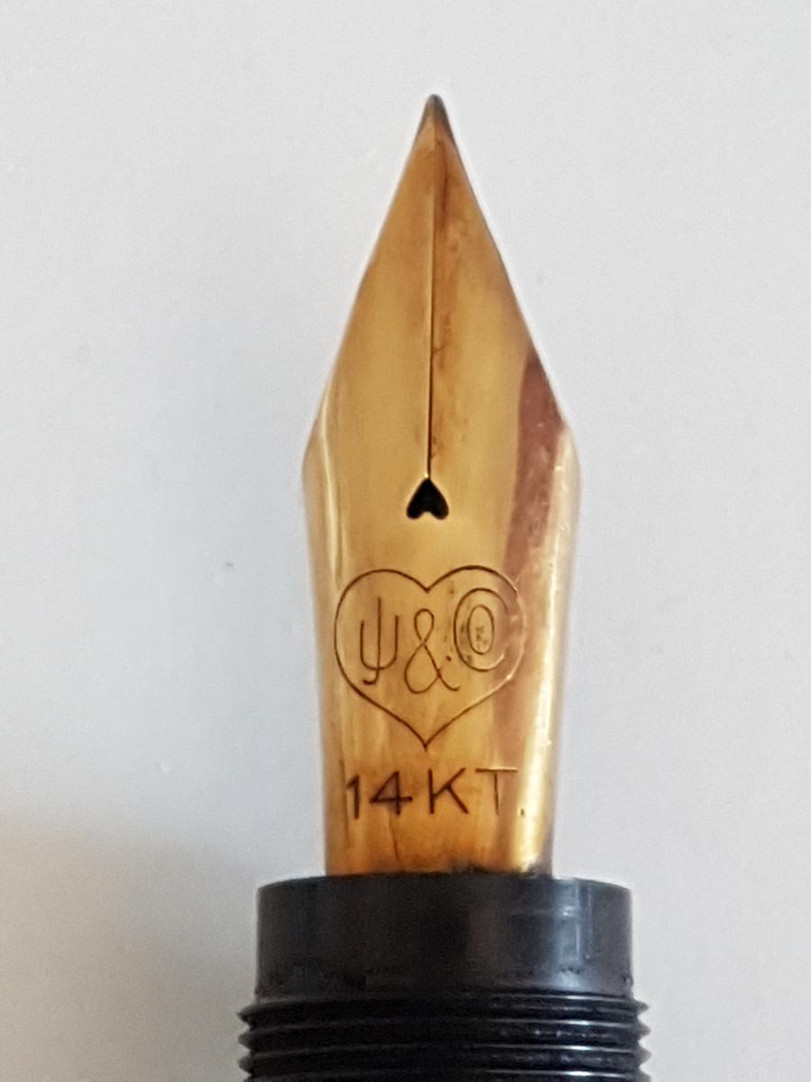 Per quanto riguarda il pennino, quello che sembra un tridente si può forse interpretare come una lettera greca psi, e anziché di una "O" credo si tratti di un "Co." stilizzato. In questo caso la scritta si potrebbe leggere "Psi & Co.", ma non ho trovato nessuna notizia di una ditta con questo nome...