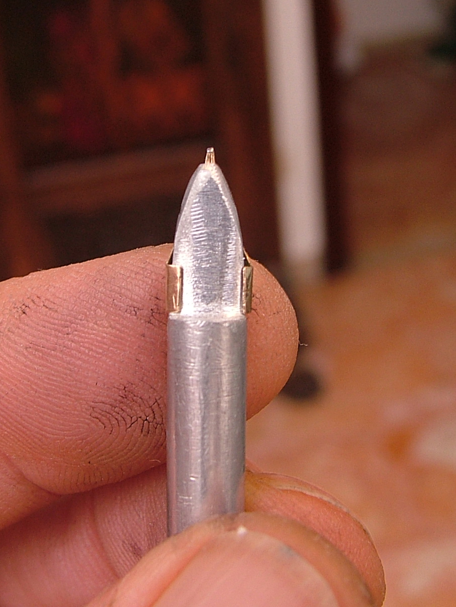Ho costruito questo nuovo attrezzo multi funzione., un lato è per la riparazione dei pennini Aurora 88 , 98, 888, Duo-cart ecc..., si mette il pennino e delicatamente si agisce con un martelletto e si ridà la forma originaria.