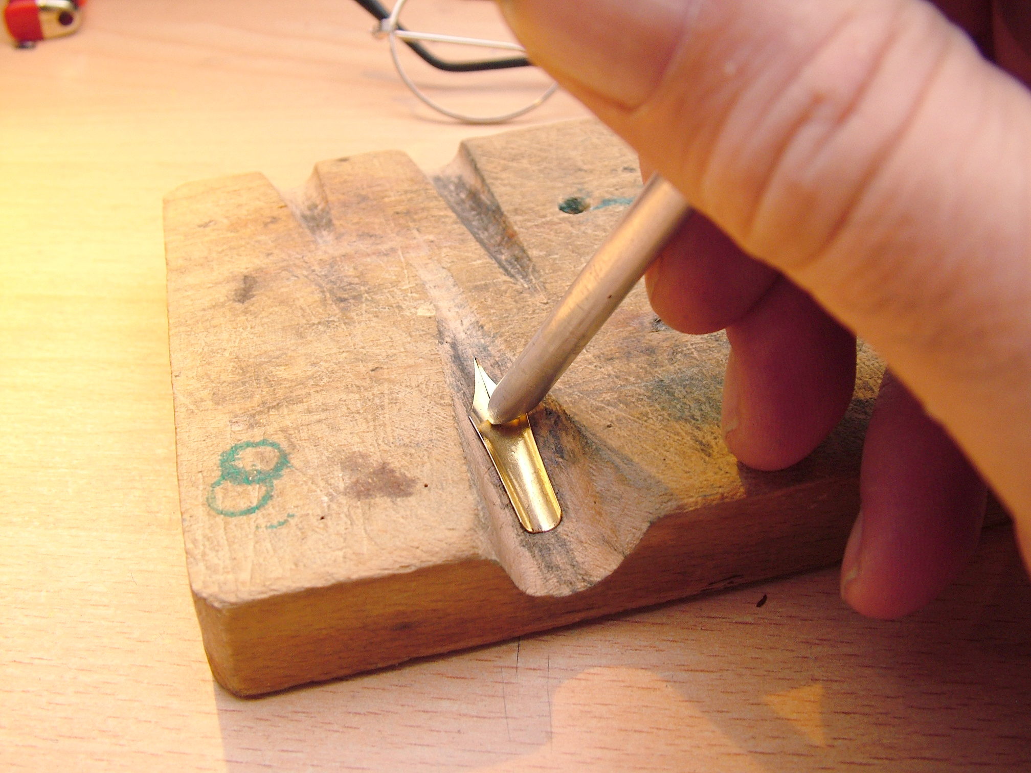 L'altro lato è per raddrizzare i pennini quando si trovano nella "forma" e per la riparazione delle botte su cappucci laminati e fusti laminati.