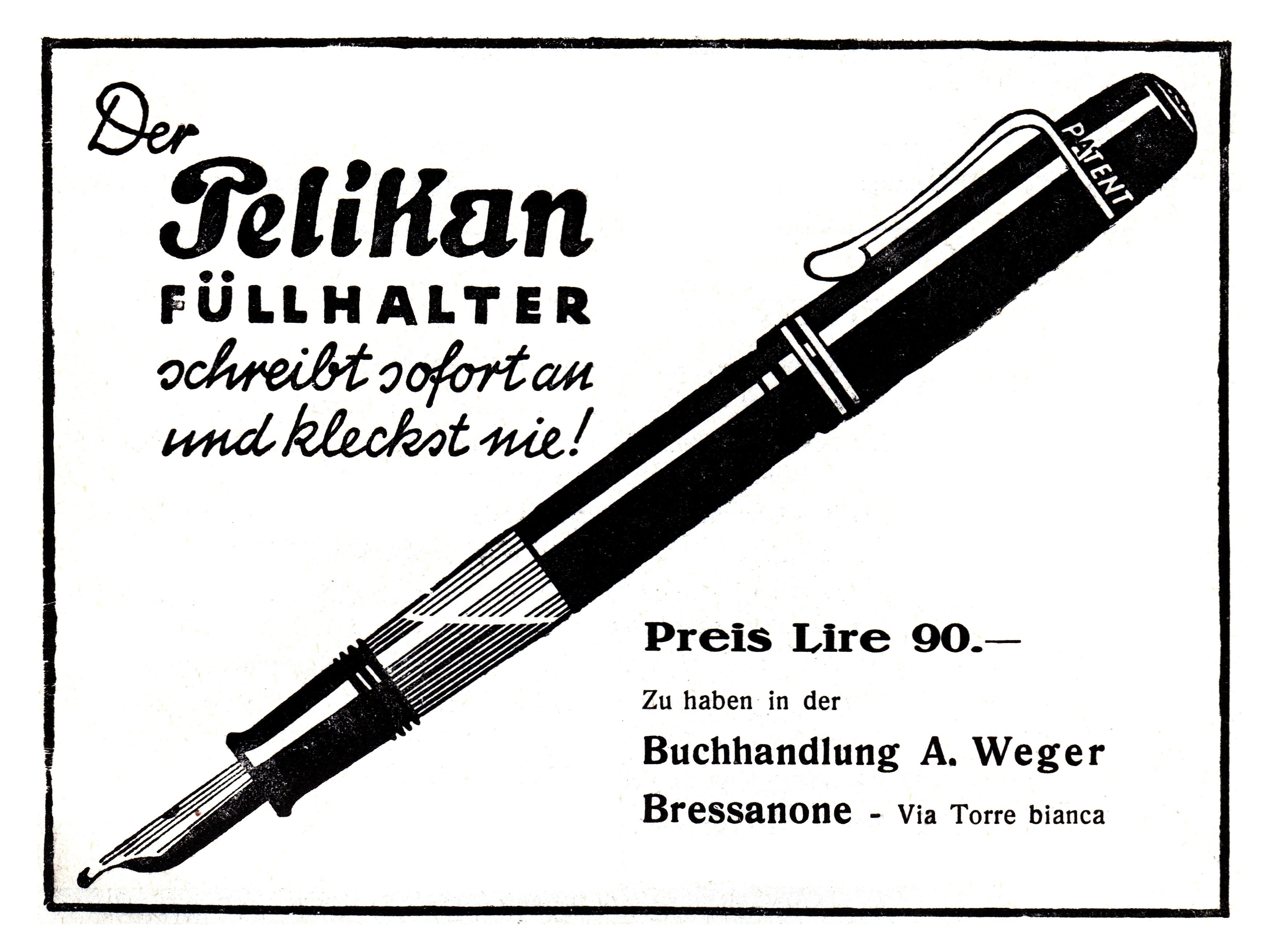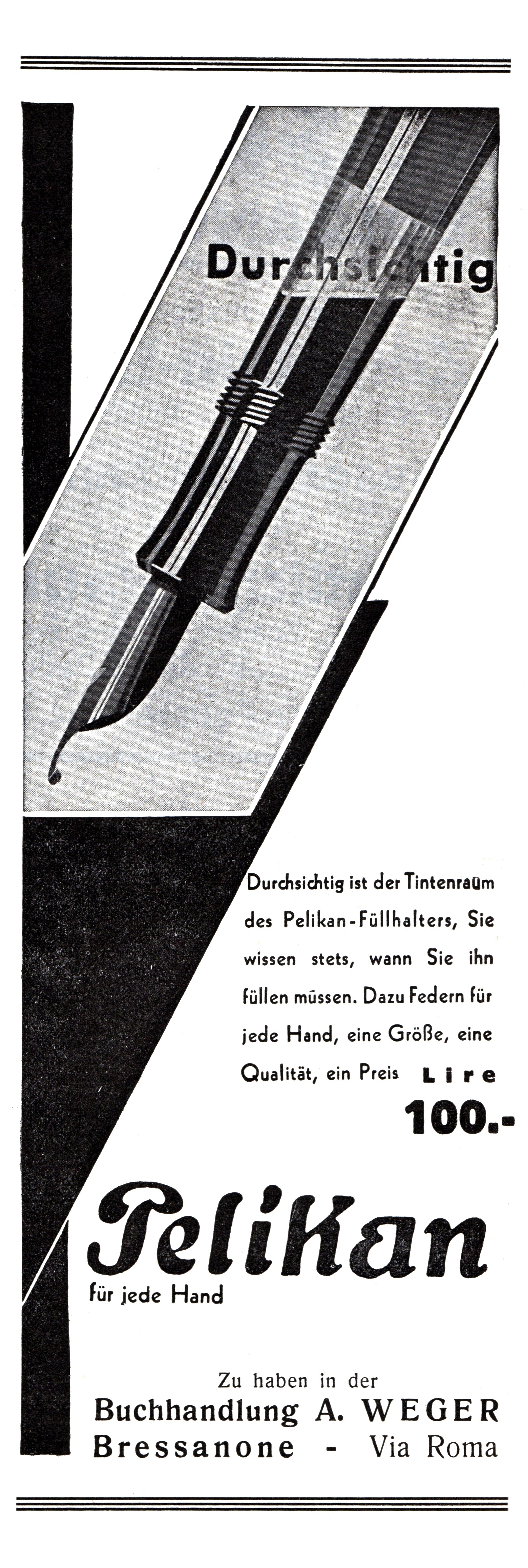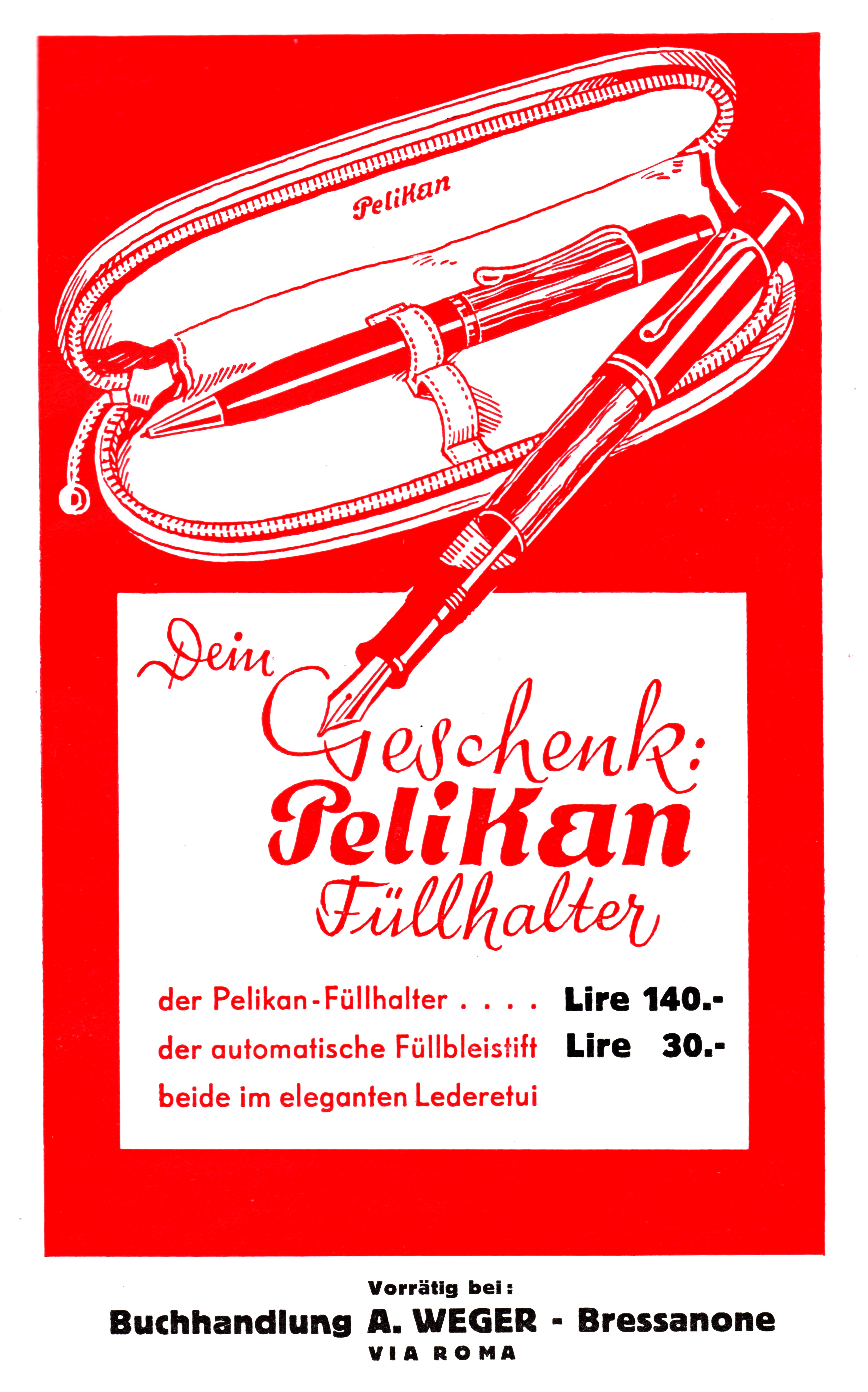 L’anno seguente Pelikan, o meglio la cartoleria A.Weger di Bressanone (che ancora oggi pubblica il Calendario), tenta di ingolosire i potenziali clienti andando a ripescare l’originale tedesco di una pubblicità che era in uso almeno dal Maggio 1931 nel resto d’Italia (archiviata in tre versioni sul Wiki). La penna era originariamente proposta a Lire 90: ma già dalla fine dell’anno 1931 il prezzo era stato portato a L.100 (ancora niente politica del --,99