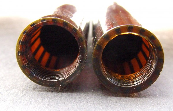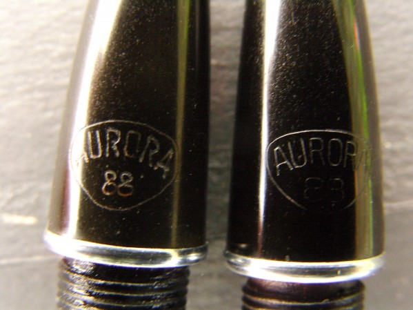 Visto che vi ho incuriosito, allego un paio di vecchie foto delle differenze delle filettature di corpo e puntale tra i primissimi modelli della 88 ed i successivi: come si può vedere non sono così rilevanti da balzare agli occhi, ma abbastanza evidenti nel confronto diretto.