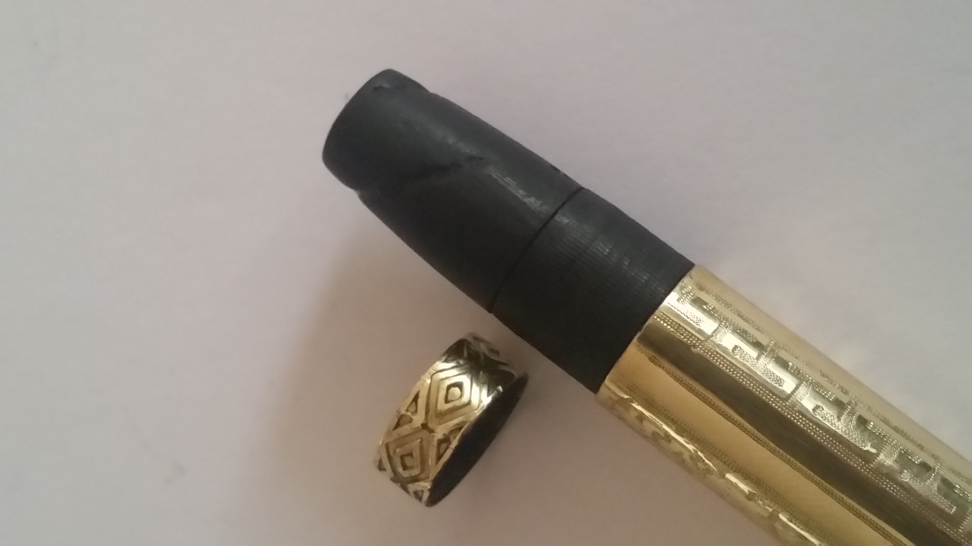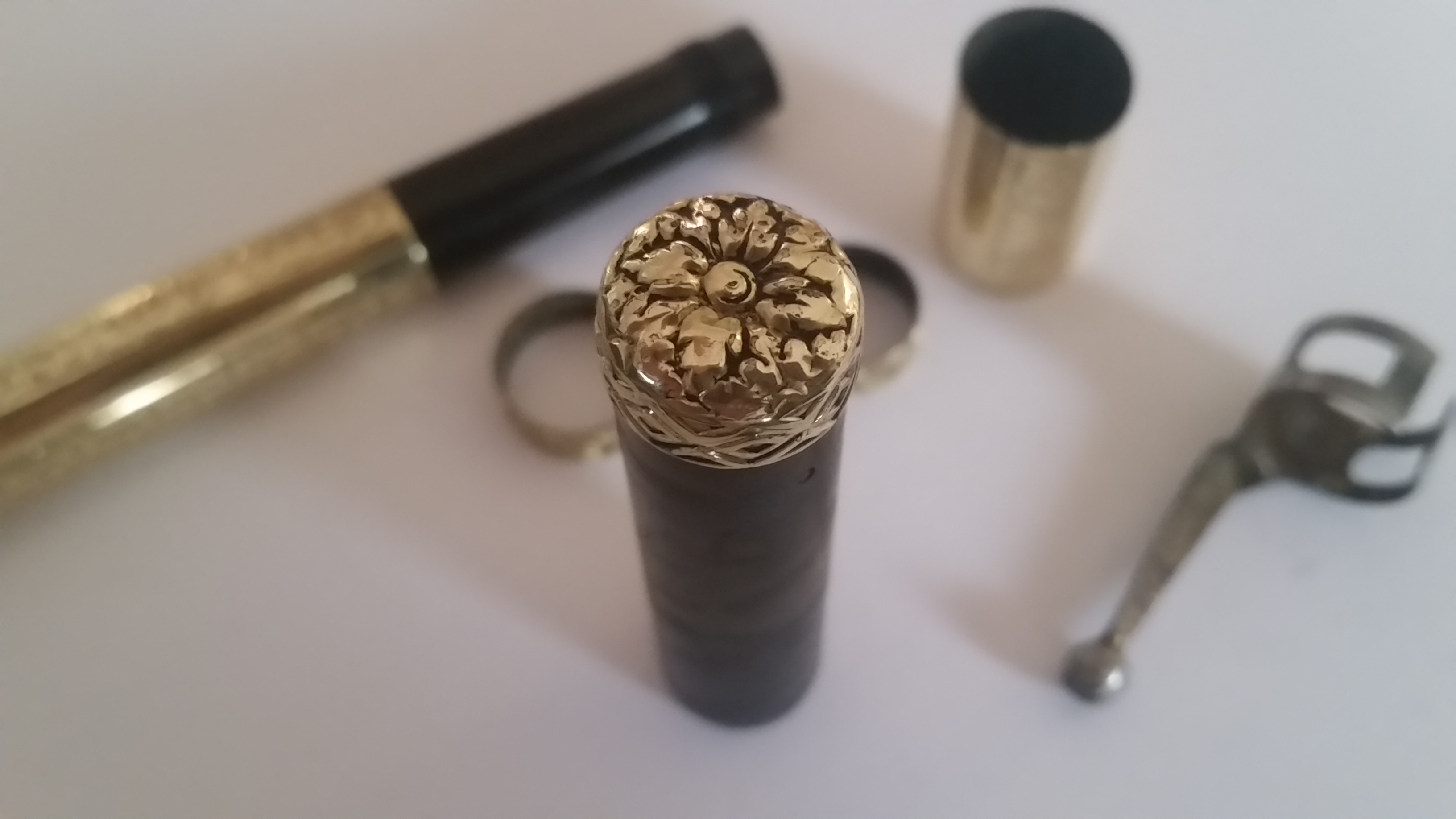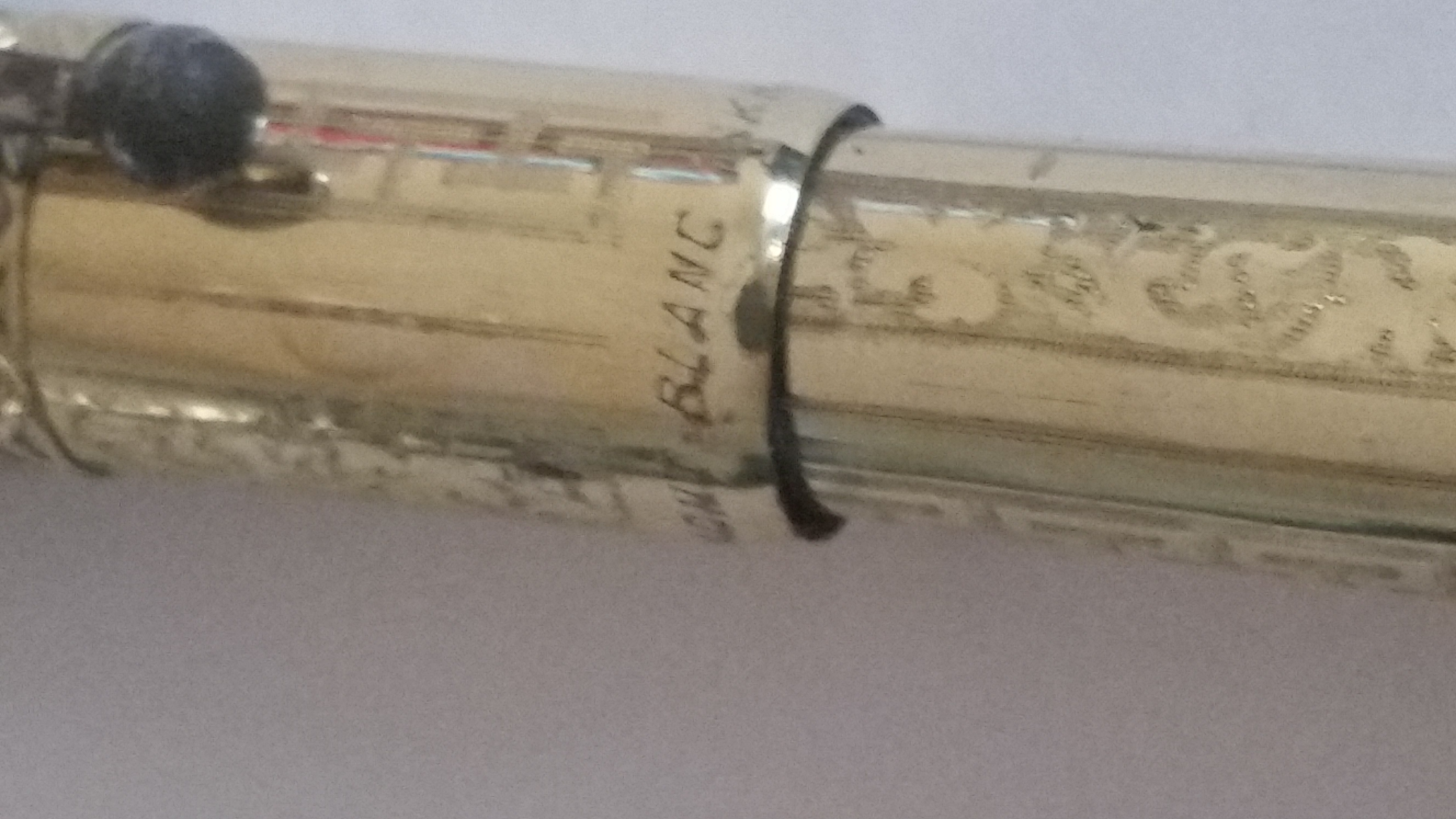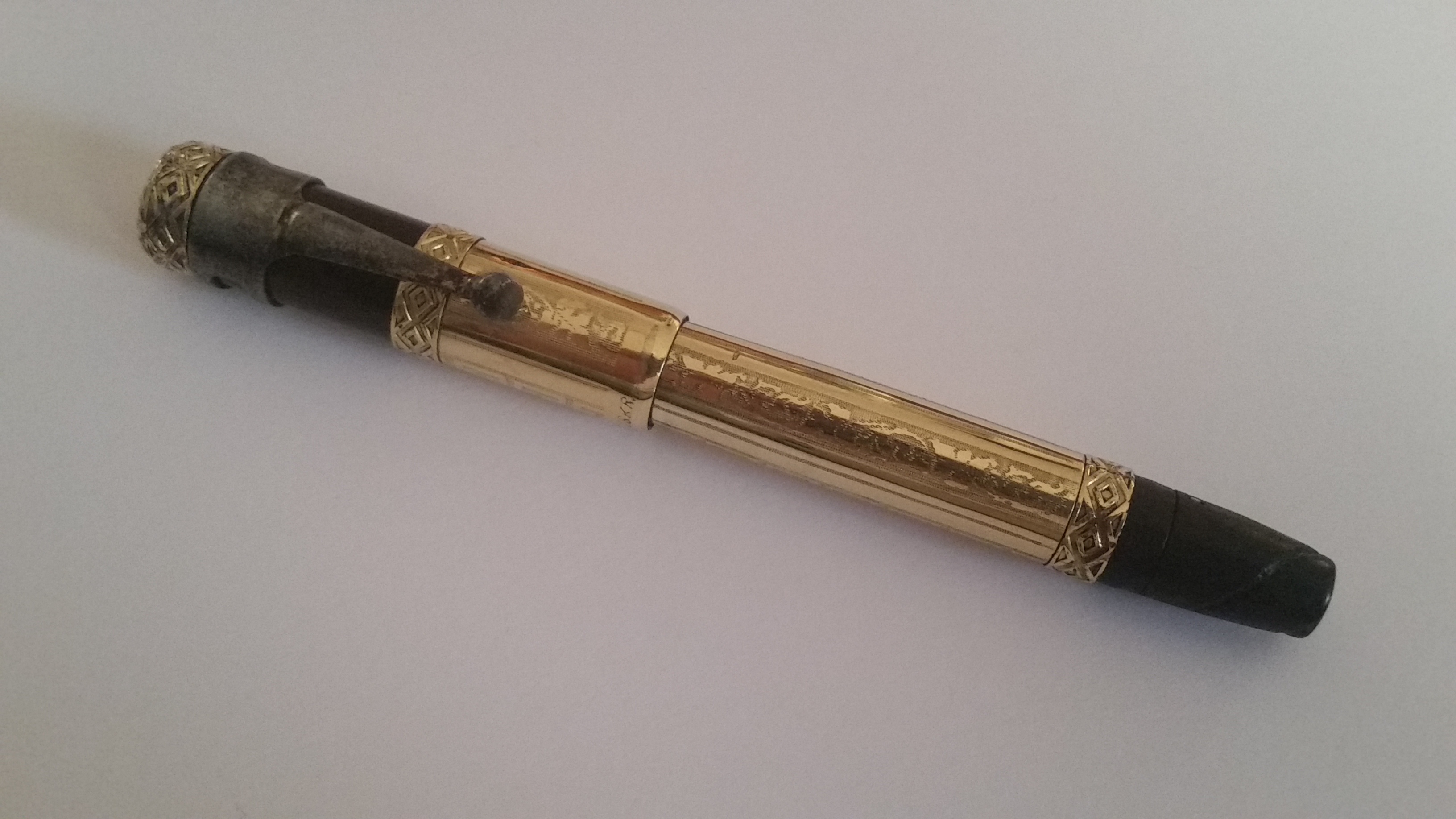 Oggi vi voglio presentare una delle ultime arrivate, ancora bisognosa di cure, ma con un fascino incredibile! Comprata al mercatino dell'usato di San Donato Milanese per 4 euro, questa penna era ricoperta da una sostanza bianca cristallizzata (immagino una muffa) che, insieme alla ruggine, ne aveva nascosto ogni incisione. Il pennino era bloccato e non potevo riconoscere né la marca né il materiale della penna. Presa per pura curiosità (vado matto per le rientranti), la portai a casa e cominciai a grattare via tutta la ruggine e quella sostanza cristallizzata, quando infine riportai alla luce le incisioni alla base del cappuccio e i miei occhi si illuminarono alla vista della scritta "MONT BLANC 18 KR."! Dopo aver rimosso tutta la sporcizia, la smontai rivelando il meraviglioso pennino numero 4 purtroppo gravemente danneggiato (una lunga crepa si fa strada tra le incisioni partendo dal foro di areazione fino al numero 4). Un altro problema consiste nell'assenza di una parte del rivestimento, diviso in parti. Penso che trovare la parte originale sia praticamente impossibile, ma volevo chiedere a voi se è possibile farla ricostruire da un orefice o magari ci sono altri modi. La clip era completamente ricoperta dalla ruggine e durante le operazioni di pulizia non ho potuto togliere la ruggine senza togliere la placcatura che vi era originariamente. Non so se la clip sia originale, ma all'interno di essa vi è inciso un numero 5. Mi ha sorpreso la parte superiore del cappuccio, decorata con un bellissimo fiore inciso, che ho già visto su altre montblanc rientranti. Il pennino è stato rimesso in linea dal gentilissimo Ugo al Pen Doctor Day, che mi ha informato che si trattava di un flessibile. Secondo voi è possibile ripararlo o è meglio sostituirlo? Il pennino era terribilmente piegato perché l'ago di sicurezza che impediva l'avvitamento del cappuccio con il pennino estratto è stato smarrito, e suppongo che la penna sia stata chiusa ancora con il pennino fuori, piegandolo malamente. Il fondello che permette di far uscire il pennino è solcato da due profondi segni a mo' di vite. Immagino che il fondello fosse anch'esso ricoperto da un rivestimento d'oro. Penso che anche qui ci sia bisogno di un pezzo originale (introvabile) o di un orefice. Questo è tutto ciò che so, e chiedo a voi esperti se riuscite a dare una possibile datazione e qualche informazione utile per il suo restauro (mi piacerebbe tantissimo riportarla al suo antico fascino! ). Vi metto di seguito alcune foto. Ringrazio tutti per l'attenzione e auguro ad ognuno di voi una buona serata!