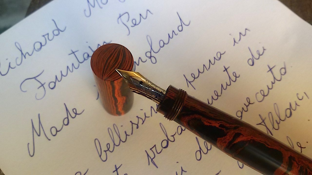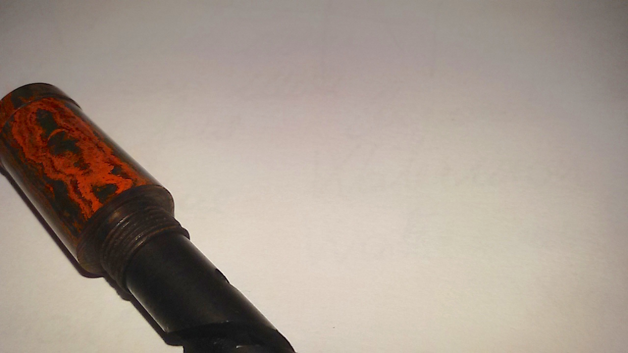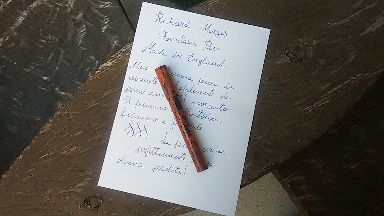 Buongiorno, oggi vi presento questa a mio parere bella penna in ebanite. È una safety filler in ebanite rossa fiammata, riporta il nome del produttore Richard Morges e Made in England. Il pennino retrattile è stata una sorpresa in quanto è un Montblanc 14c probabilmente di una 144 anni cinquanta. L' alimentatore è sempre in ebanite ed è prodotto con gli stessi colori della penna, cosa che ho visto anche su molte Waterman. In rete non ho trovato molte indicazioni riguardo questo produttore, daterei la penna ai primi anni venti del secolo scorso.