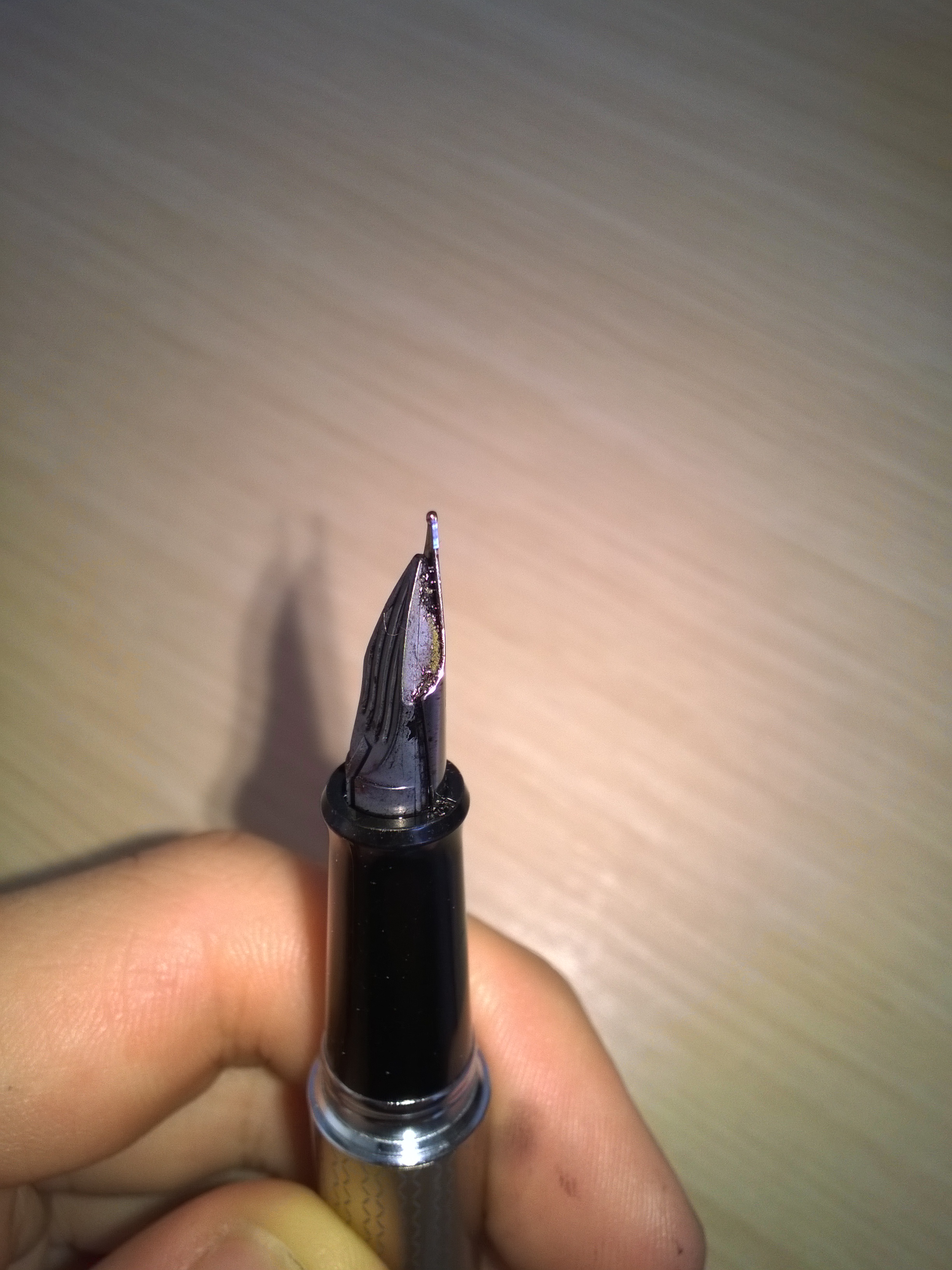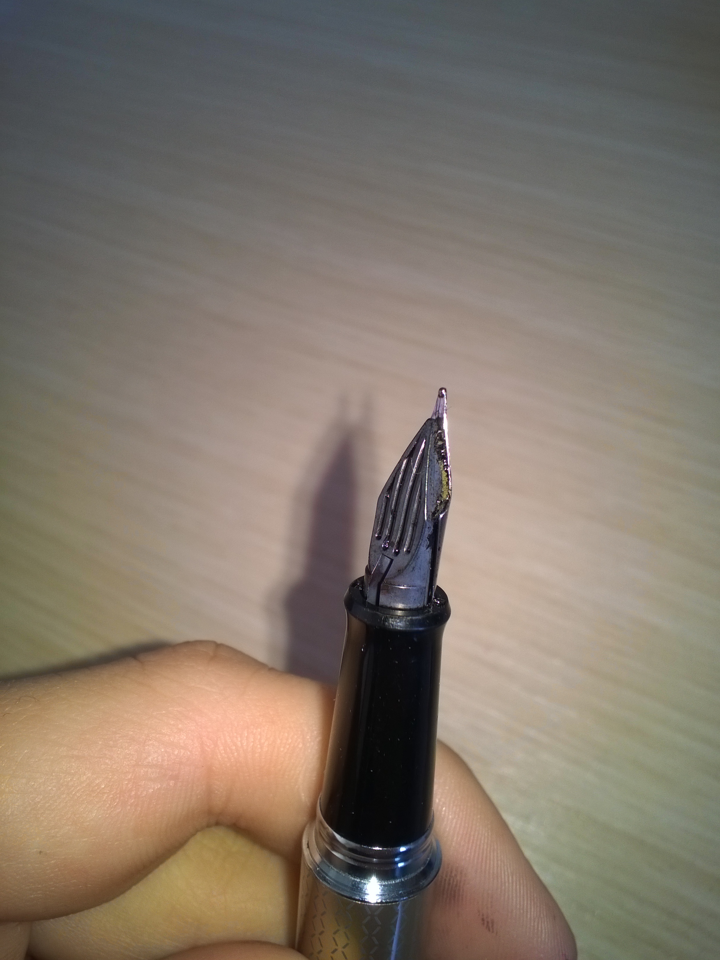 Mentre scrivevo, ho riscontrato salti di tratto da parte della mia Pilot MR. Osservando da vicino la parte posteriore-laterale del pennino, dove negli ultimi giorni trovo sempre una macchia d'inchiostro, ho nonato una sostanza verde: è muffa?
