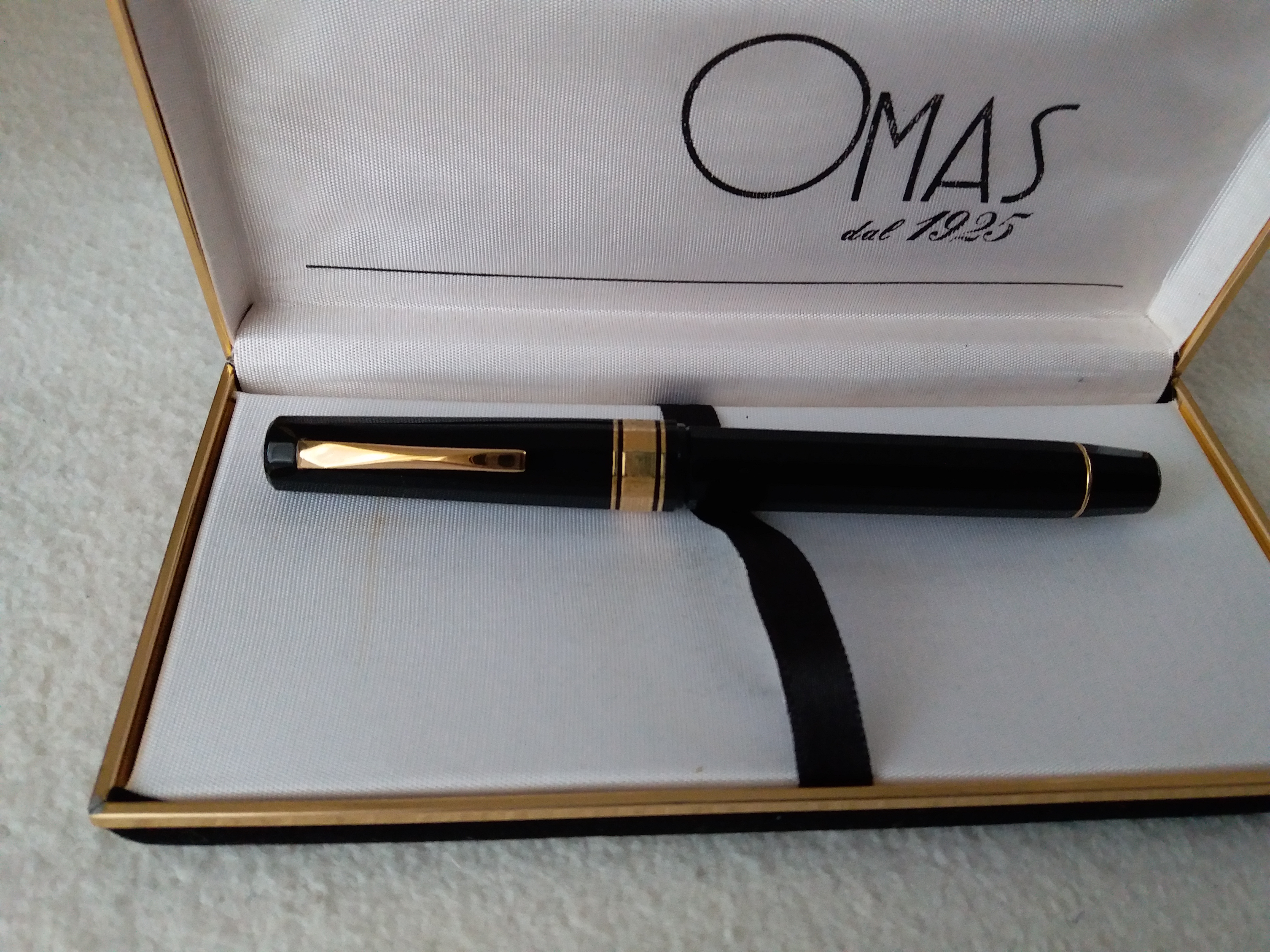 Da pochi giorni felice possessore di una Omas (la mia prima), mi piacerebbe avere qualche informazione in più. È una classica faccettata nera, misura 557, marchiata "Raiuno". Sul fondello si notano due scalfitture, come se si fosse voluto coprire i buchi del pernetto che, mi pare di aver capito, era tipico della Omas in celluloide (ma forse mi voglio illudere io). Il marchio sul corpo della penna è il primo della Rai, in uso dal 1980 al 2000. Posso sperare che la mia sia un fondo di magazzino reciclato per motivi pubblicitari o aziendali? Caricamento a stantuffo, pennino oro 585 monocolore, piuttosto imponente, ma lungo e affusolato. Flusso abbondante e tratto piuttosto largo. Appena possibile, seguiranno foto. Grazie a chi vorrà rispondermi.