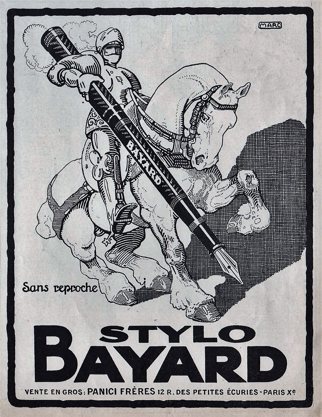 La storia della Bayard , ampiamente illustrata nel nostro wiki, comincia nel 1922 come " Panici Freres ", denominazione qualche anno dopo mutata in " Bayard "per richiamare il mito del famoso cavaliere medievale Pierre Terrail de Bayard, il cavaliere senza macchia e senza paura che in questa pubblicità del 1927 vediamo brandire orgogliosamente la penna a mo' di lancia. Rispetto all'indirizzo che appare nella pubblicità la sede, pochi anni dopo, fu spostata sempre a Parigi, ma al nuovo indirizzo di rue des Cordelieres 31, nel tredicesimo arrondissement, sulla rive gauche.