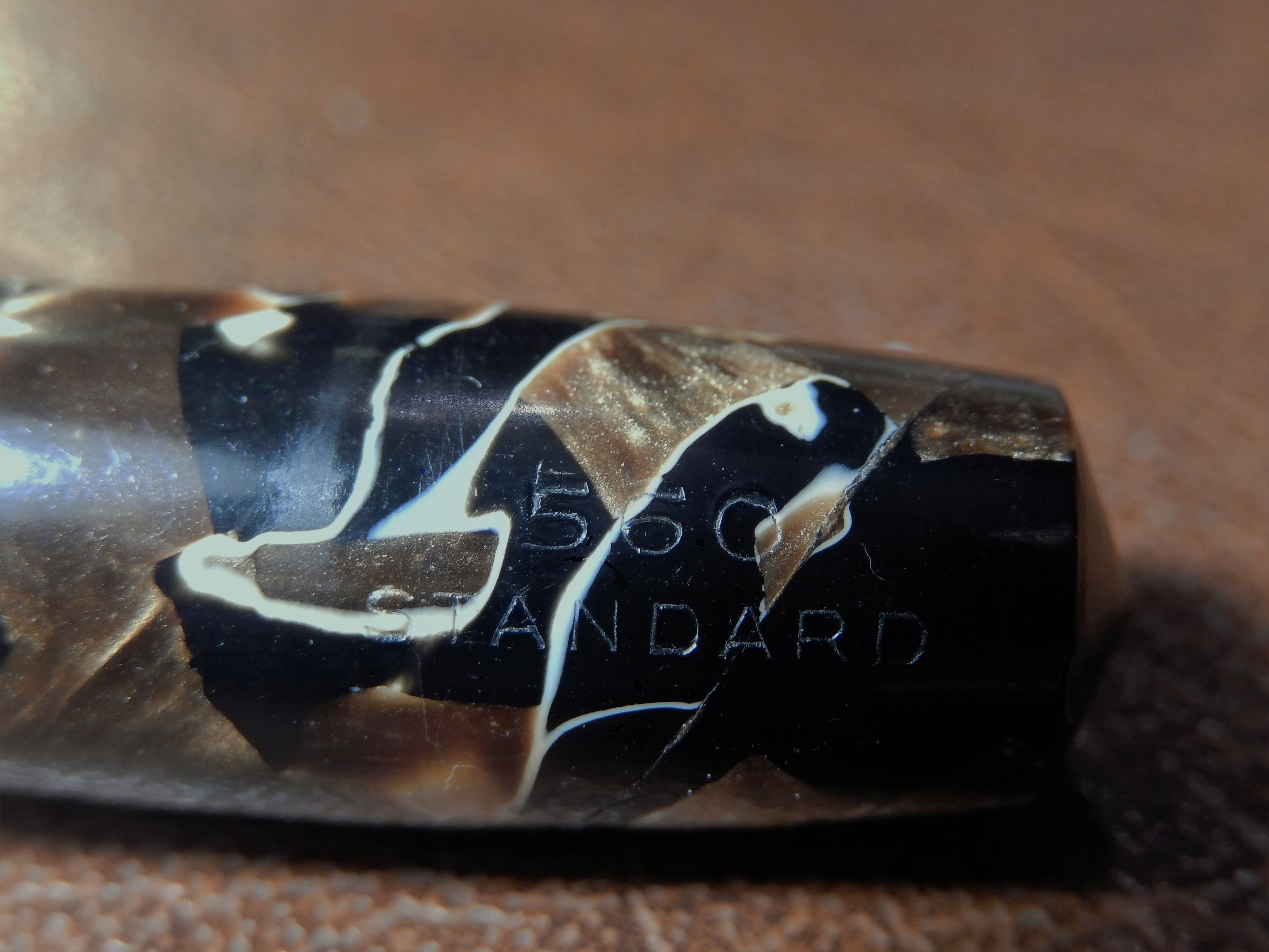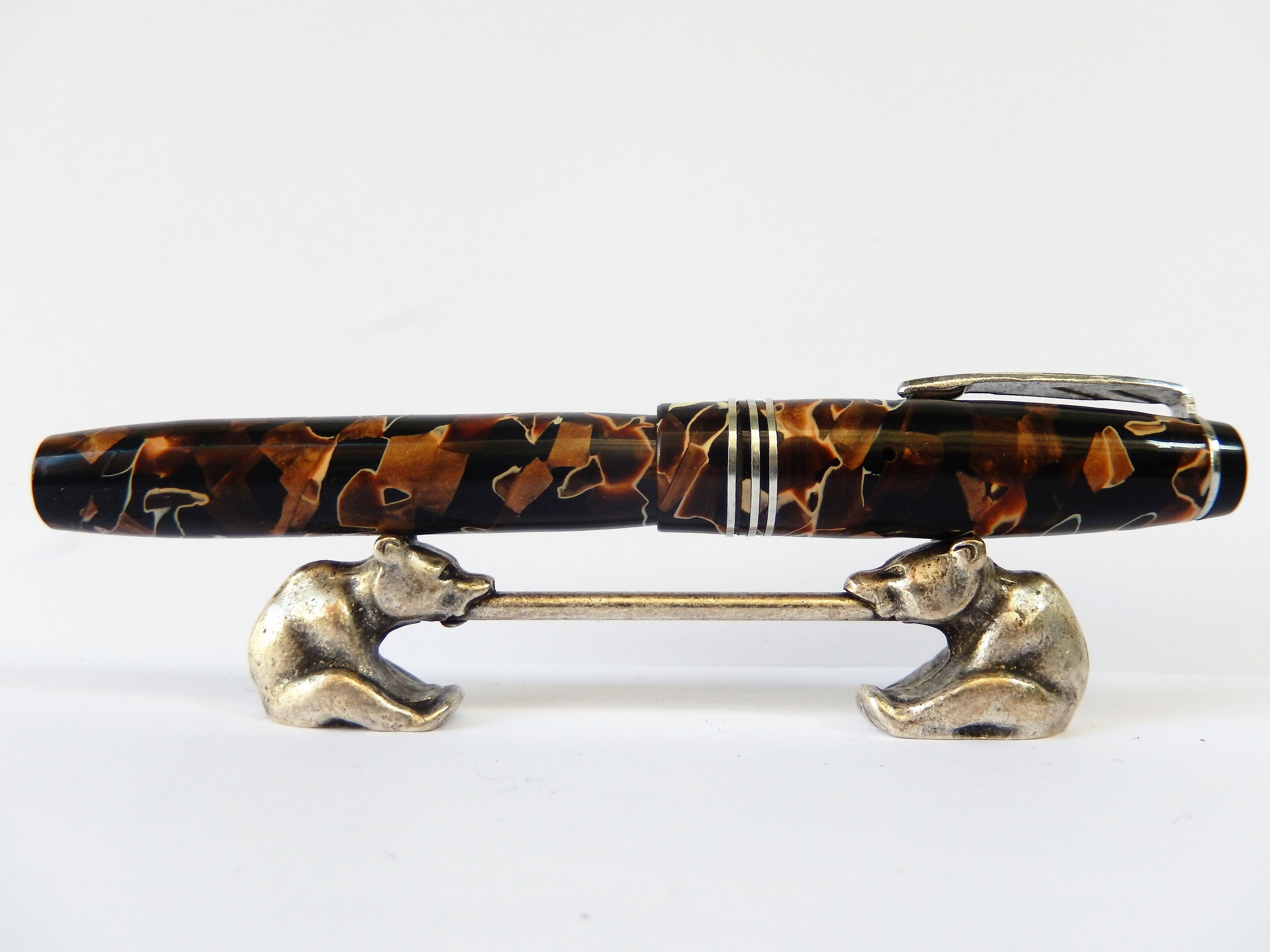 Sfoggia una bella celluloide con una accattivante colorazione marbrè brune e crema, mentre di colore nero ed entrambe di forma conica sono le due estremità del cappuccio e del fondello, sul quale è riportato il numero del modello, mentre sul corpo troviamo inciso su due livelli " Excelsior - Bayard " Molto gradevole la clip che presenta due galloni ancora di ispirazione decò, che ritroviamo anche sulla leva di carica.
