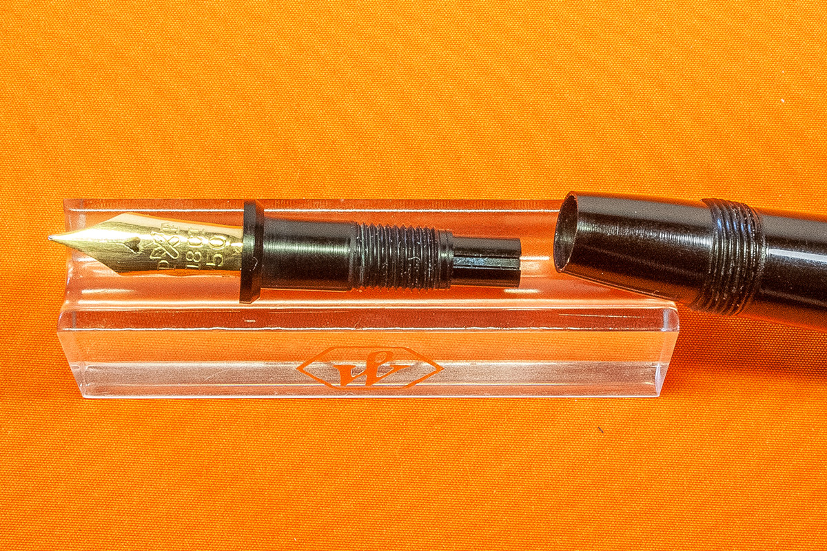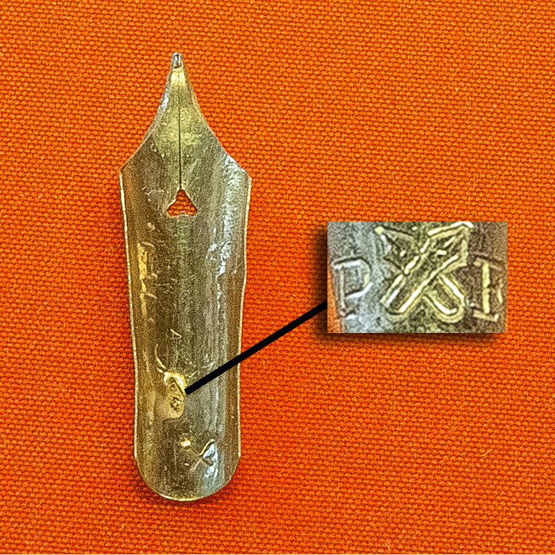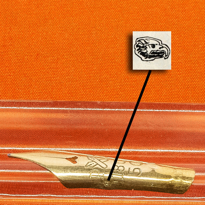 Curiosamente sono presenti i punzoni su entrambe le facce del pennino: su quella superiore la classica testa d'aquila, indicante l'oro francese a 18 carati, su quella posteriore il simbolo della casa. Grazie a tutti per l'attenzione