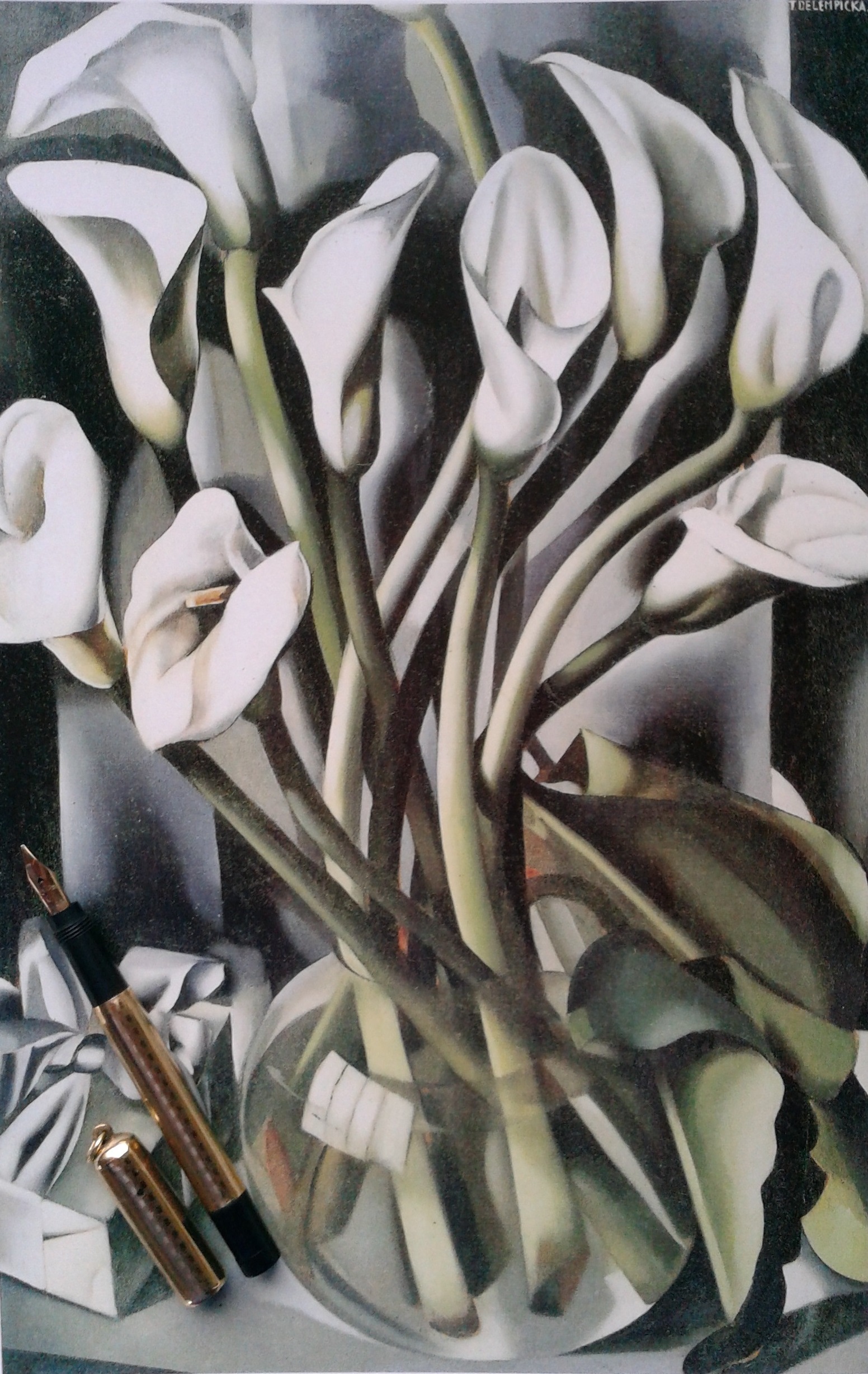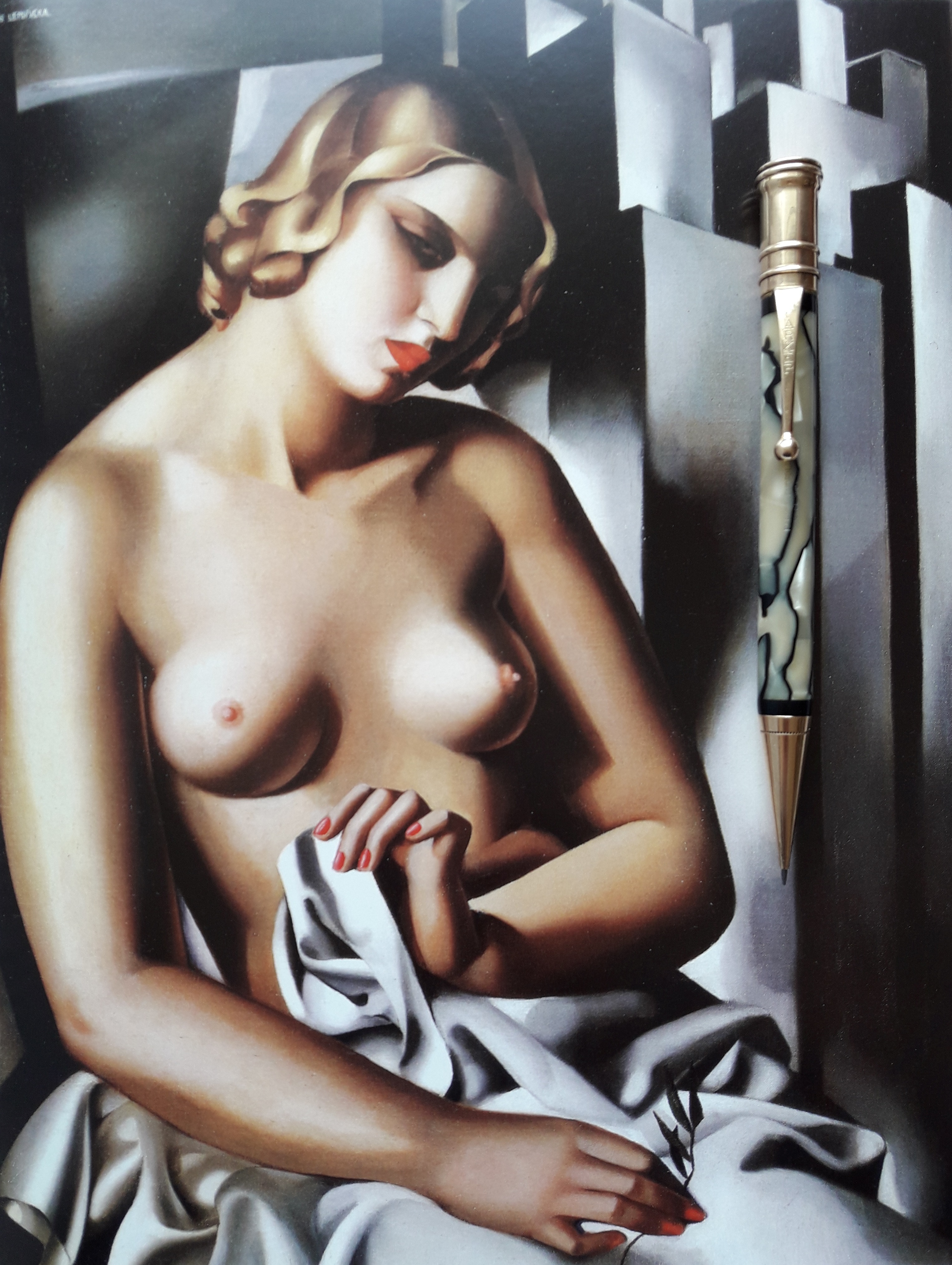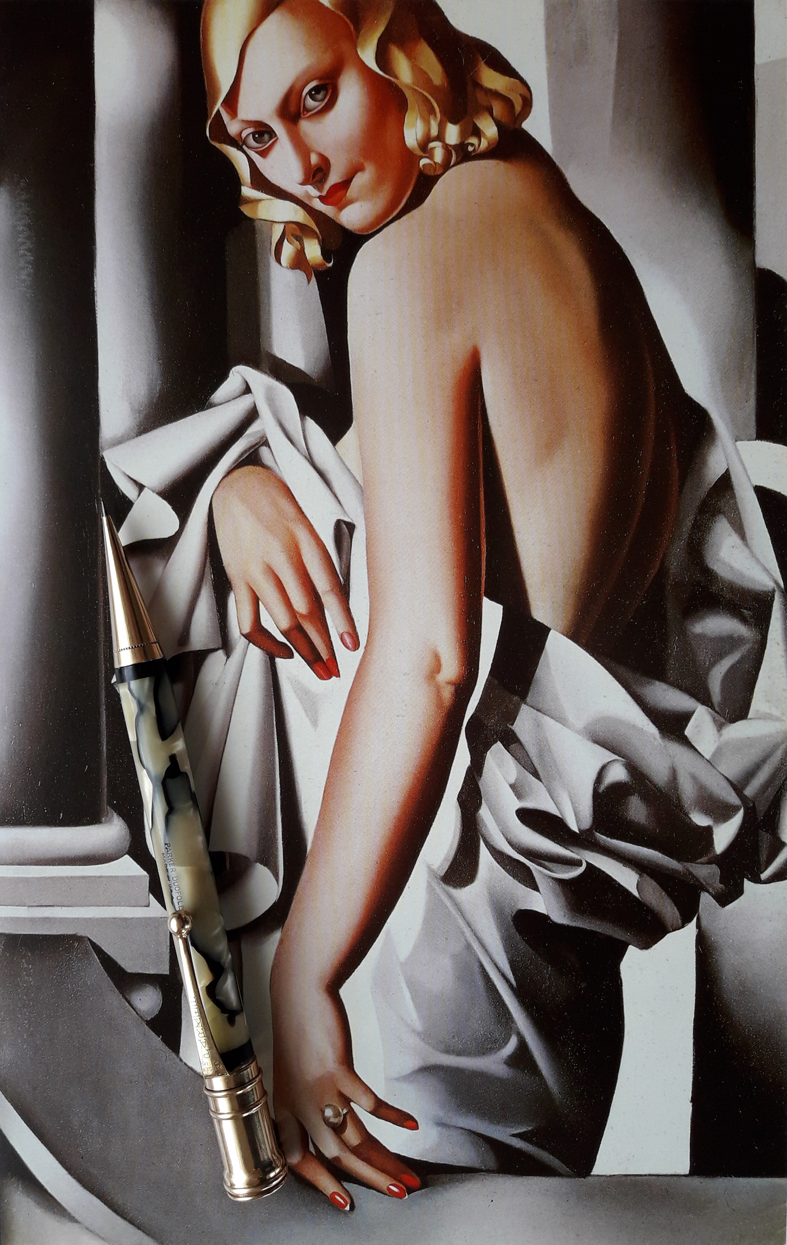 In questo dipinto di Tamara De Lempicka (1898-1980) sono presenti tutti gli elementi cromatici e stilistici del più puro glamour Déco che ritroviamo anche sulla penna: l’oro delle chiome, il perla degli occhi e dell’anello, il bianco della veste e il nero zigzagante del drappeggio, le linee curve alla base della colonna e l’impianto perfettamente cilindrico del fusto…