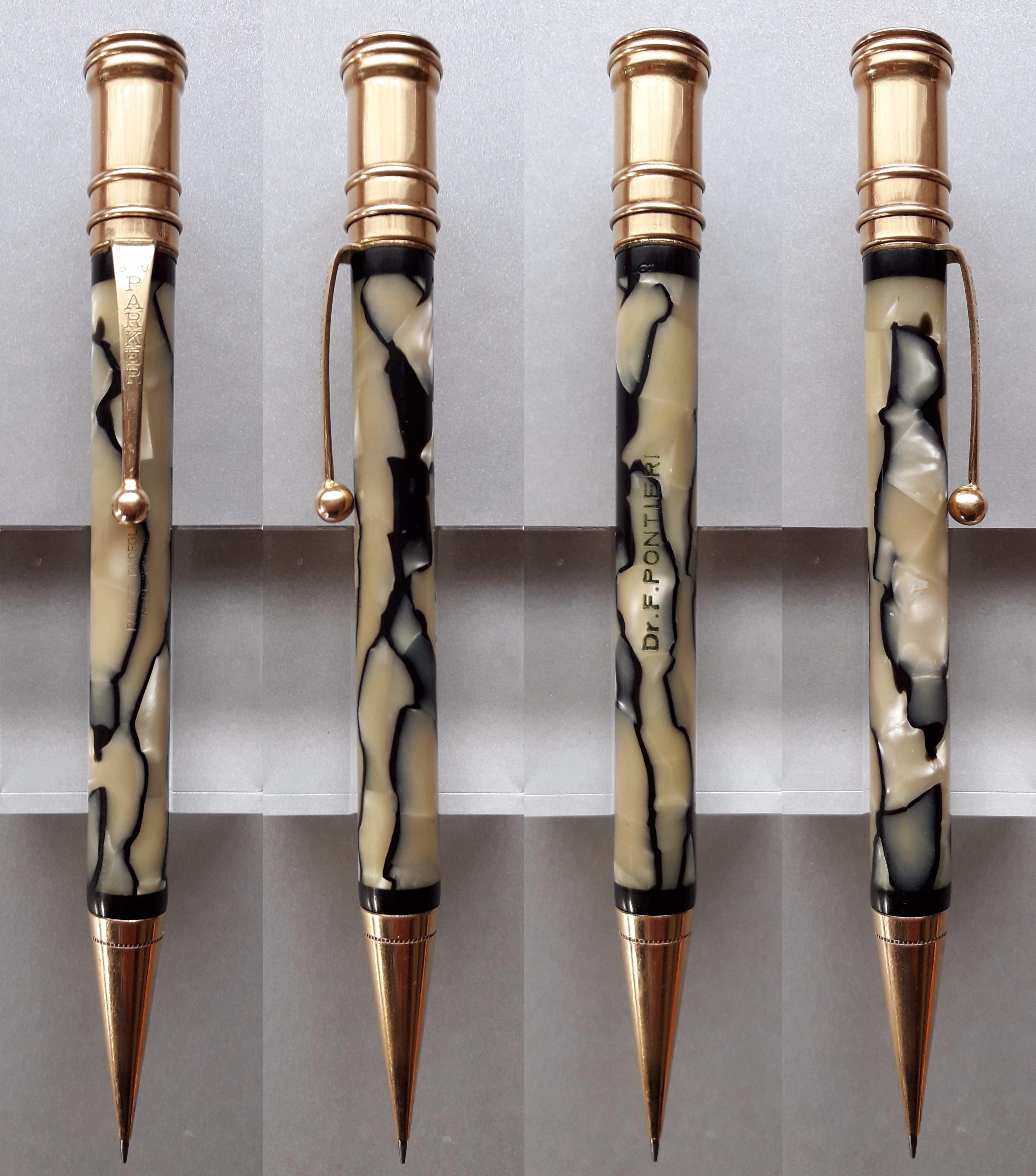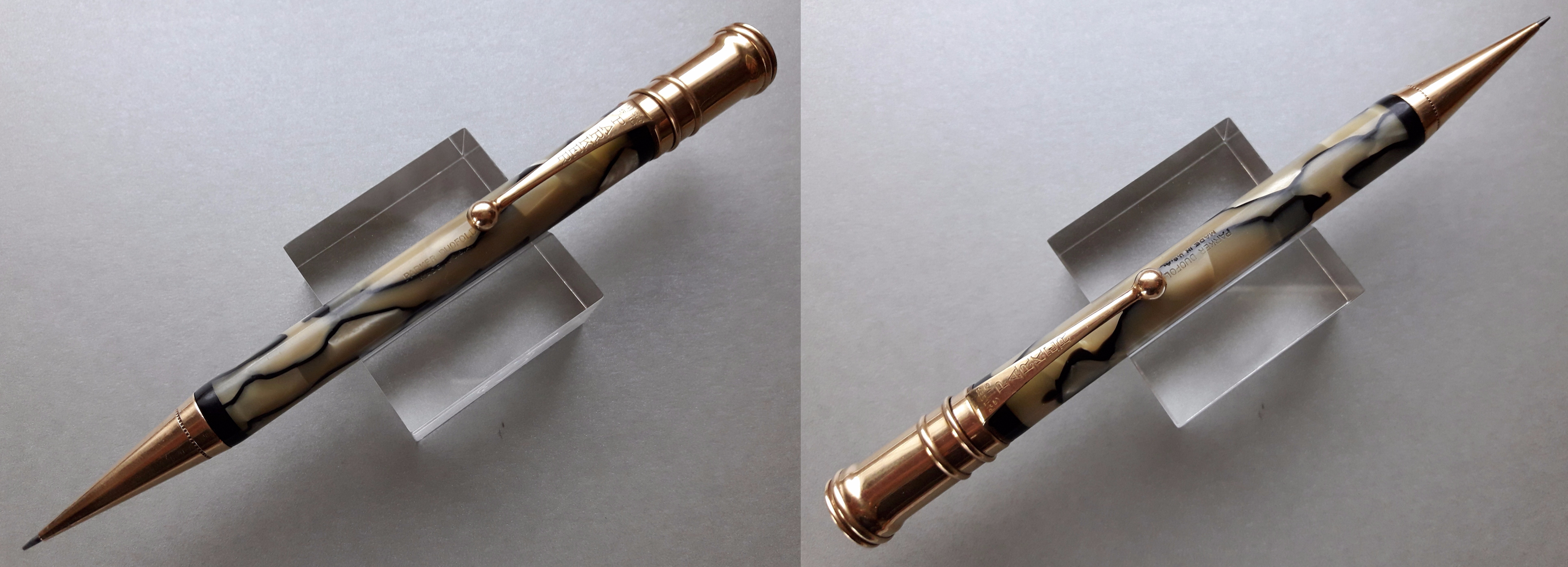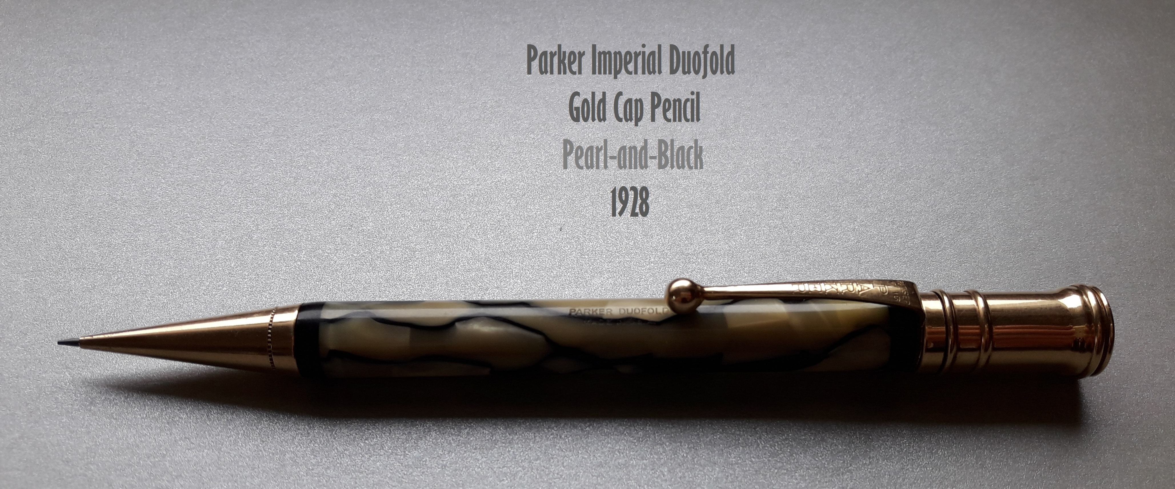 Una particolarità cromatica del nero&perla Parker sembrerebbe risiedere (secondo almeno uno dei commentatori) nell’aggiunta alla celluloide di “scaglie di pesce”: tale elemento, “composito” e “animalier” proprio come il Déco propugnava, avrebbe però compromesso la tenuta della colorazione della parte chiara del materiale, già messa a repentaglio dalle esalazioni dei sacchetti per l’inchiostro nelle stilografiche. Quindi un colore così bello e ben conservato, che sia su una stilografica o su una matita, è sicuramente degno di apprezzamento… 8-)