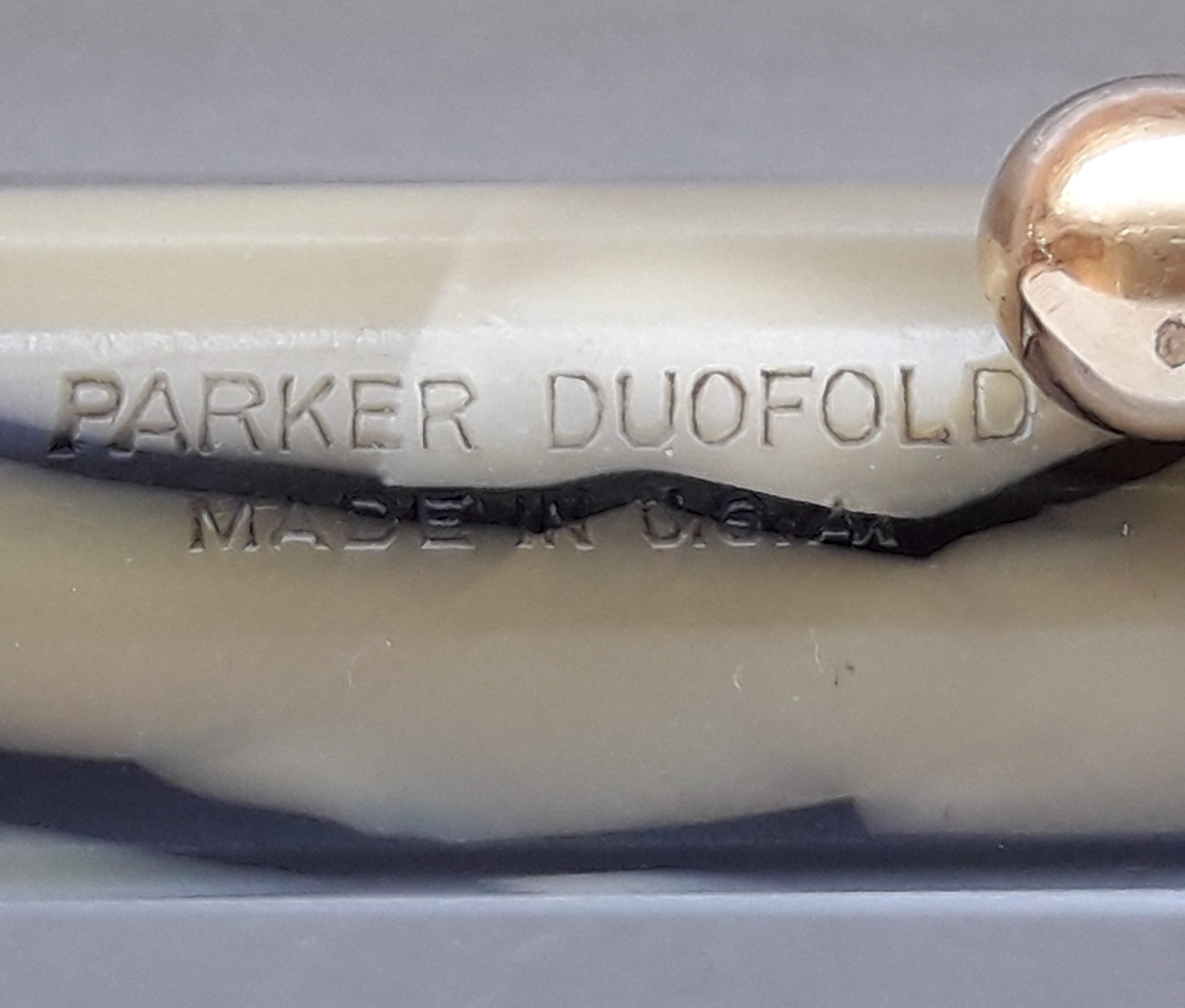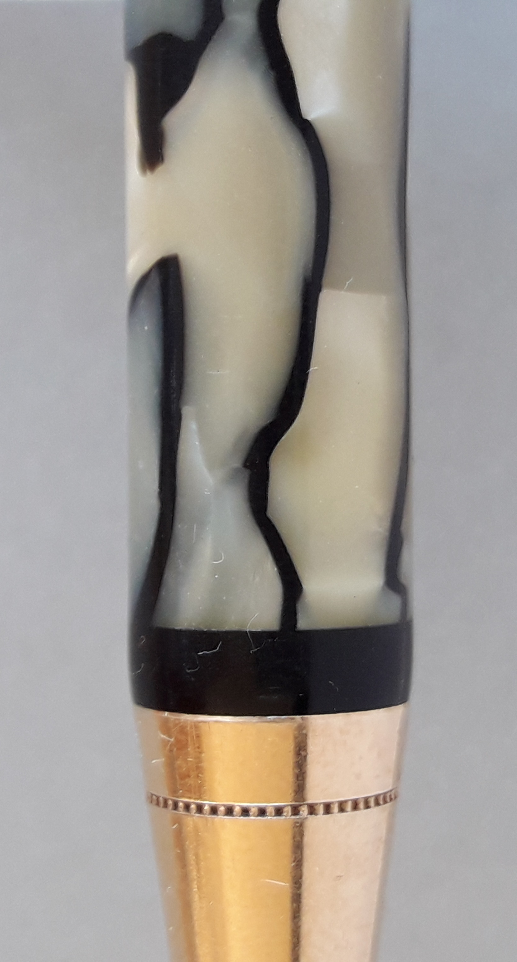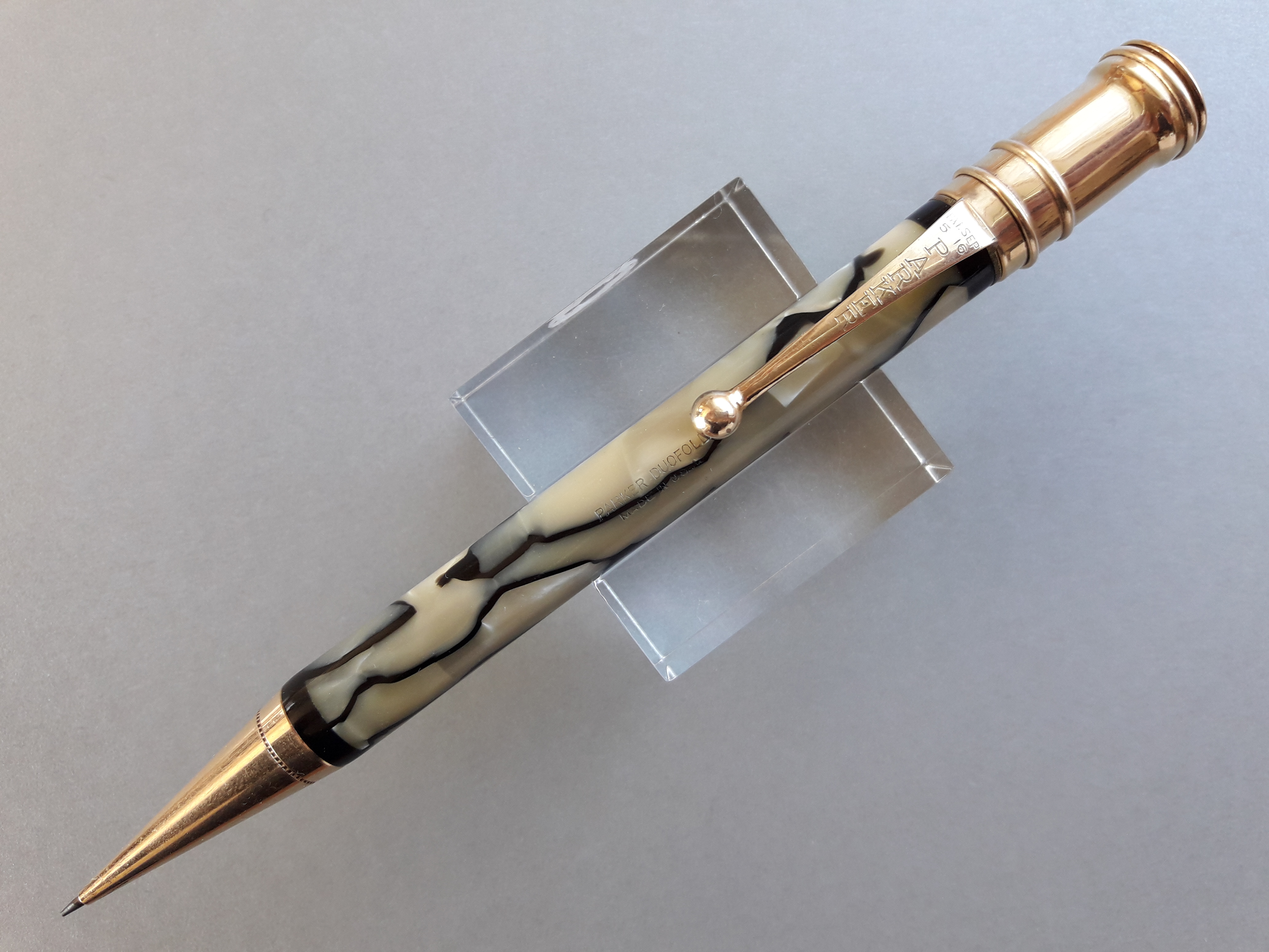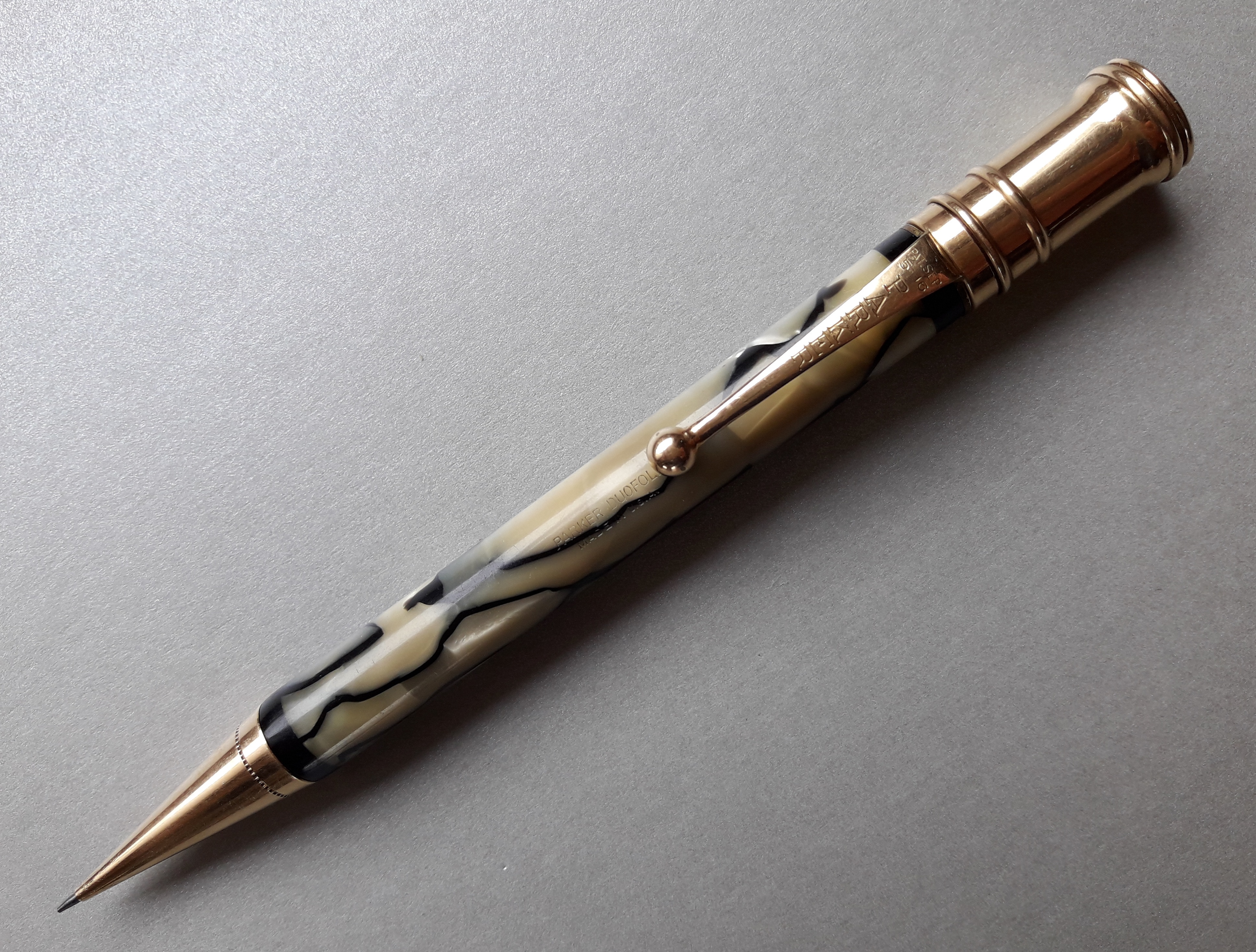 Una particolarità cromatica del nero&perla Parker sembrerebbe risiedere (secondo almeno uno dei commentatori) nell’aggiunta alla celluloide di “scaglie di pesce”: tale elemento, “composito” e “animalier” proprio come il Déco propugnava, avrebbe però compromesso la tenuta della colorazione della parte chiara del materiale, già messa a repentaglio dalle esalazioni dei sacchetti per l’inchiostro nelle stilografiche. Quindi un colore così bello e ben conservato, che sia su una stilografica o su una matita, è sicuramente degno di apprezzamento… 8-)