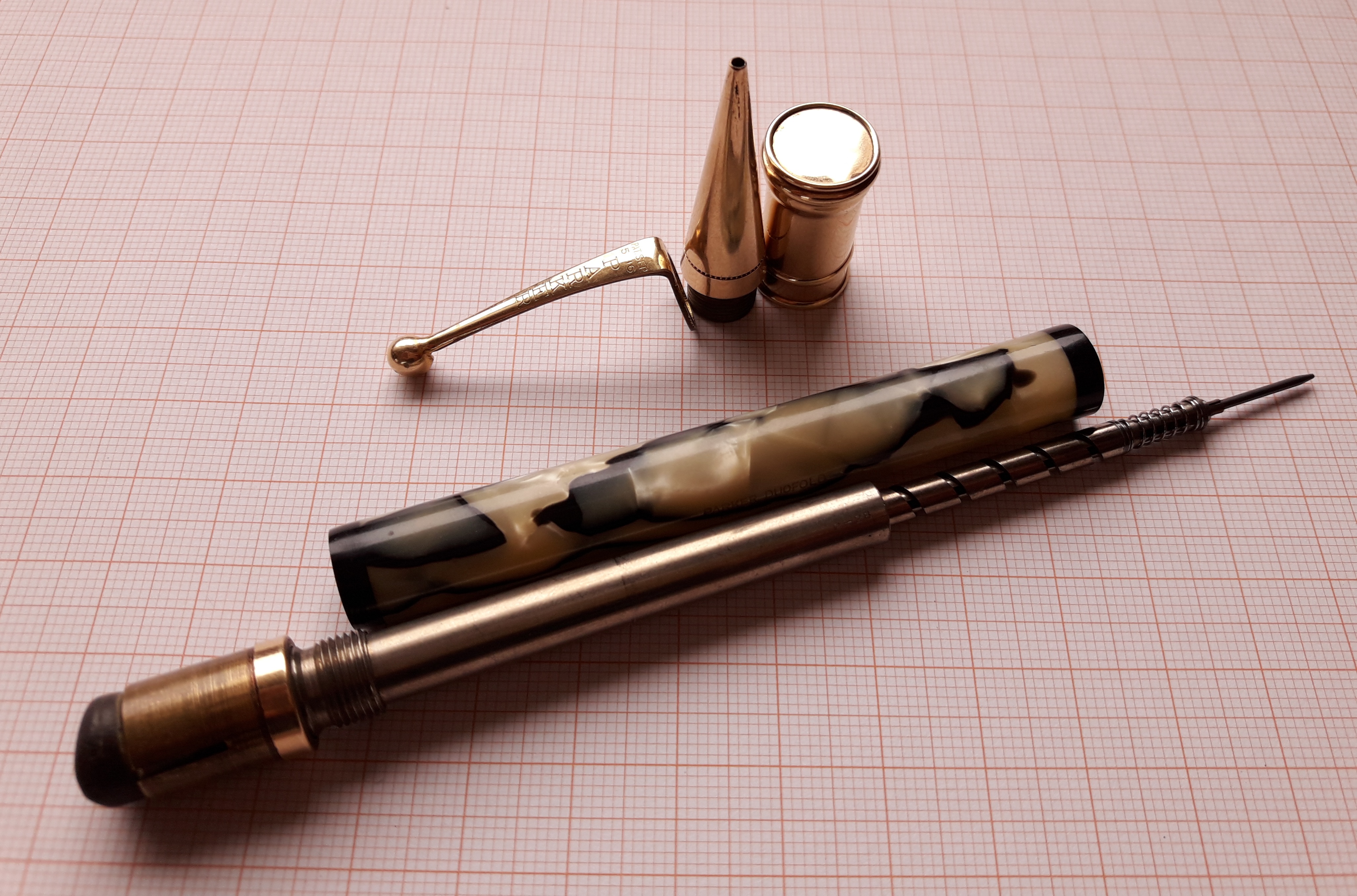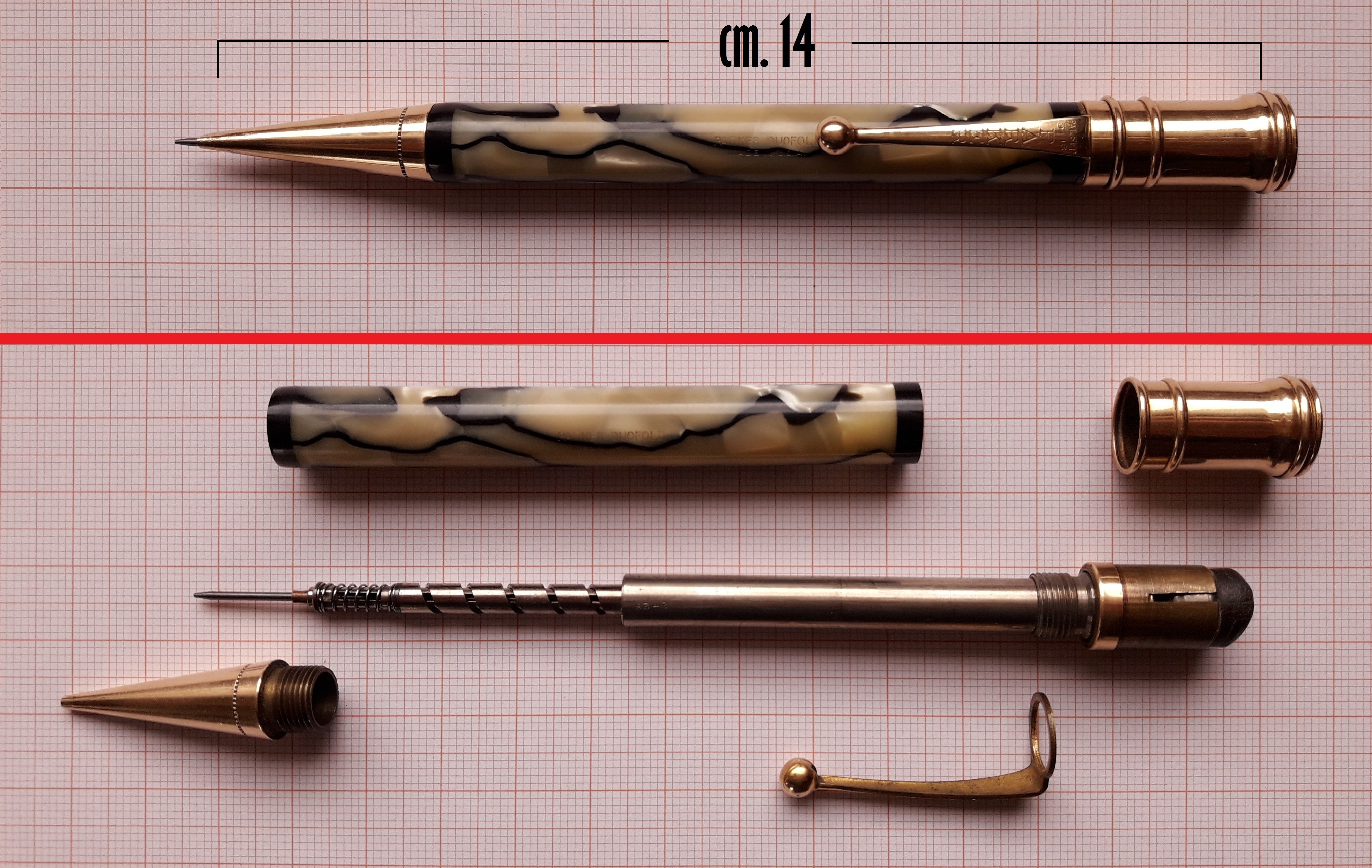 Ovvero: la prima matita della Casa risale solo al 1922, ma la matita abbinata alla prima Duofold (che vide la luce nel 1921) non venne resa disponibile che dal 1924! E questa fu la ragione principale per cui, anche ad un'osservazione superficiale, lo stile dei due strumenti non risulta perfettamente armonizzato, anzi… :problem: Gli unici elementi autenticamente condivisi sono la celluloide ed il fermaglio, la celeberrima washer-clip ("a rondella") brevetto Parker.