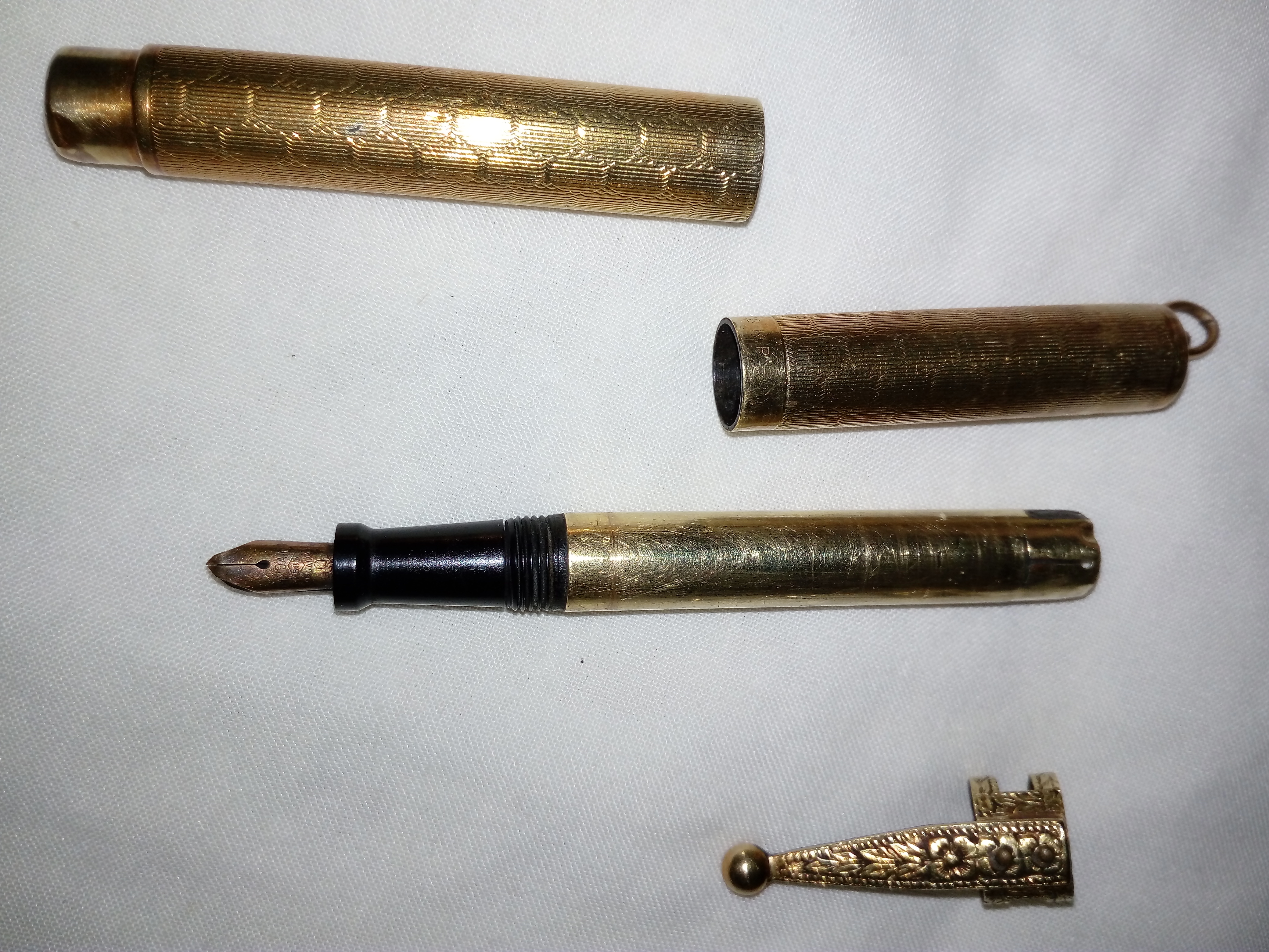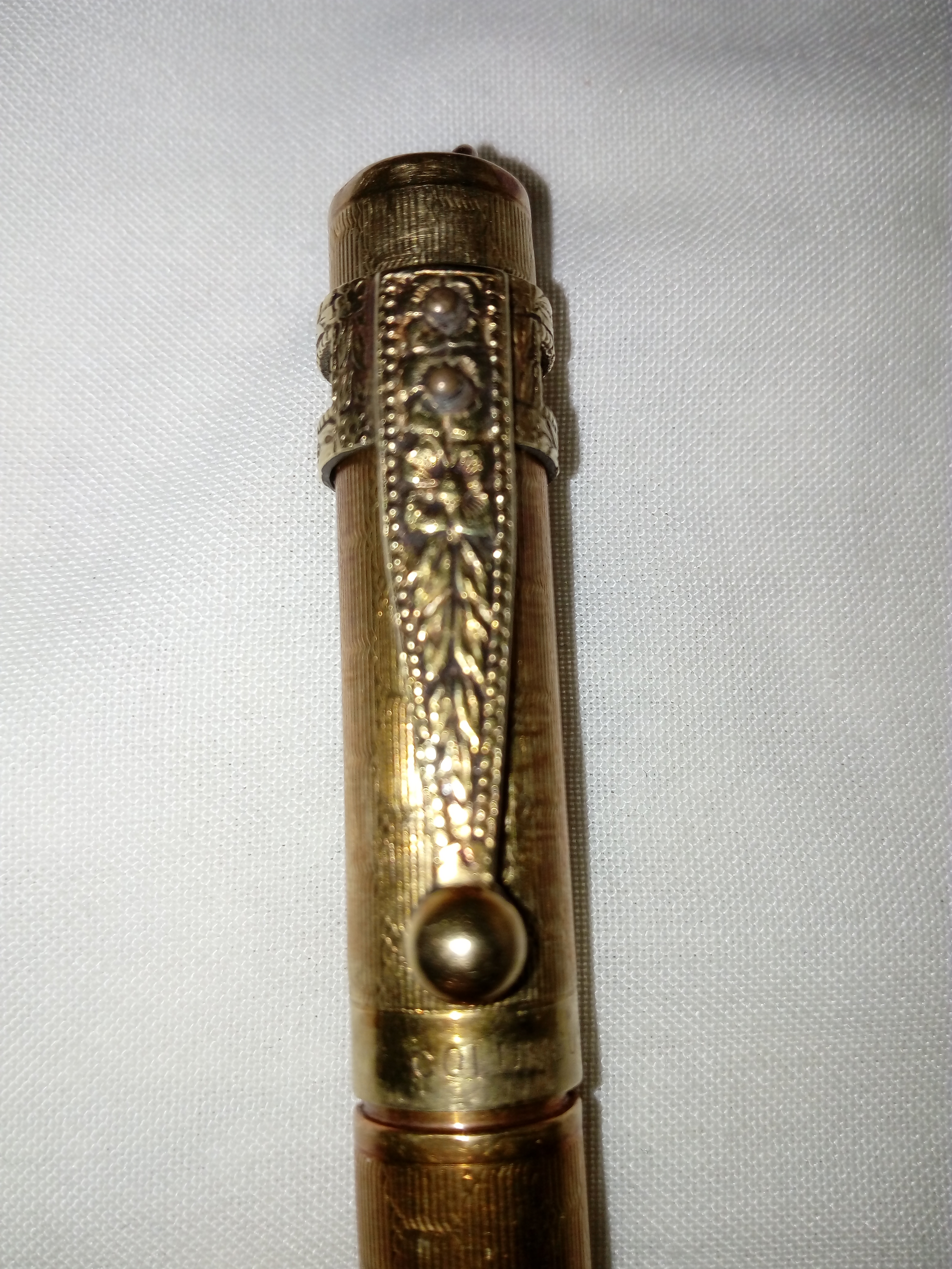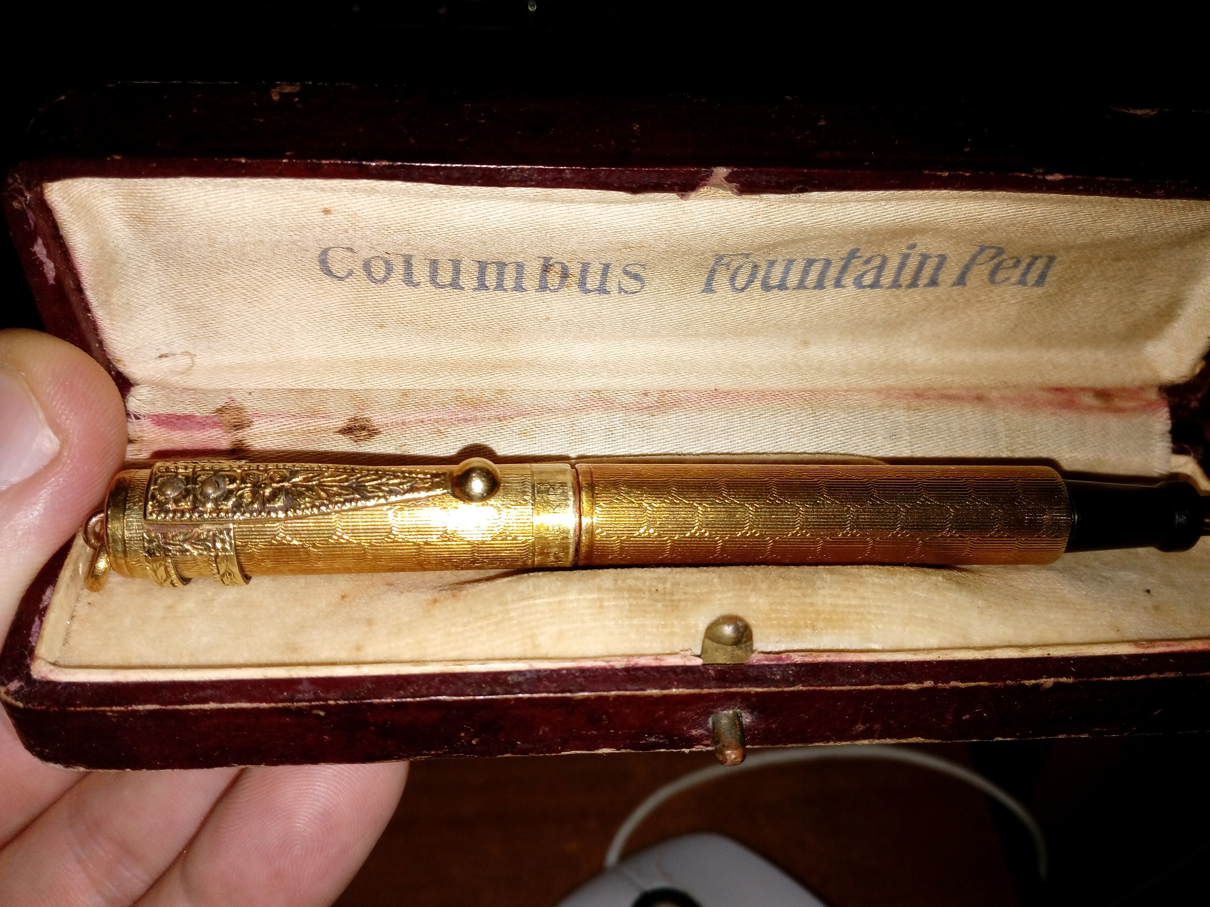 Dovrebbe essere una Columbus, azienda italiana di Milano certamente una delle prime della ditta quindi anni '20 safety, rientrante ed overlay, ricoperta, ottone, lamina oro (18k); 585 si riferisce alla caratura del pennino (14K); una particolarità nell'astuccio: Columbus fountain pen all'inglese, la nascente industria italiana di stilografiche si ispirava a Waterman's e Parker d'oltreoceano. Se ha il pennino originale è una bella penna (e relativamente rara).
