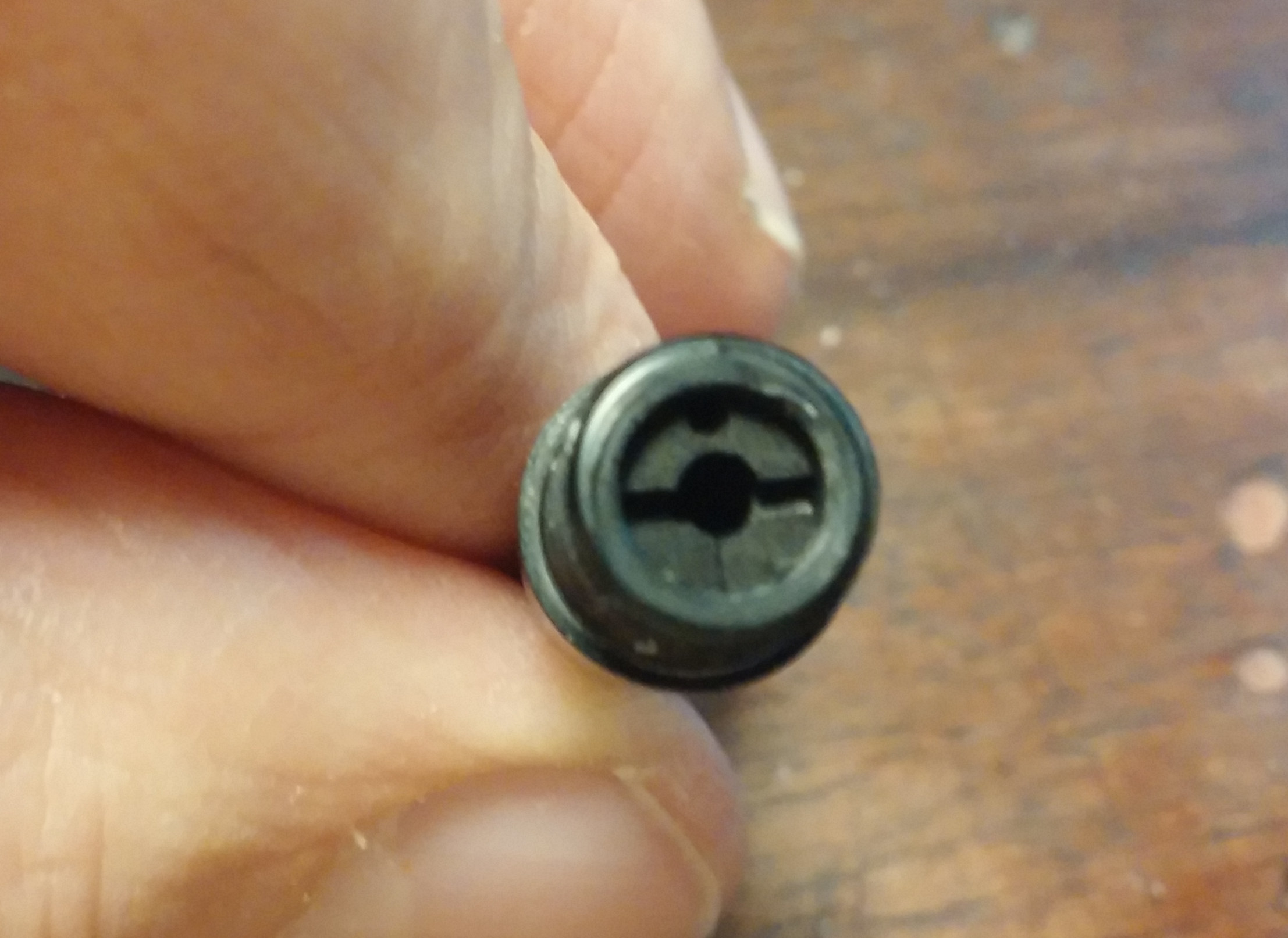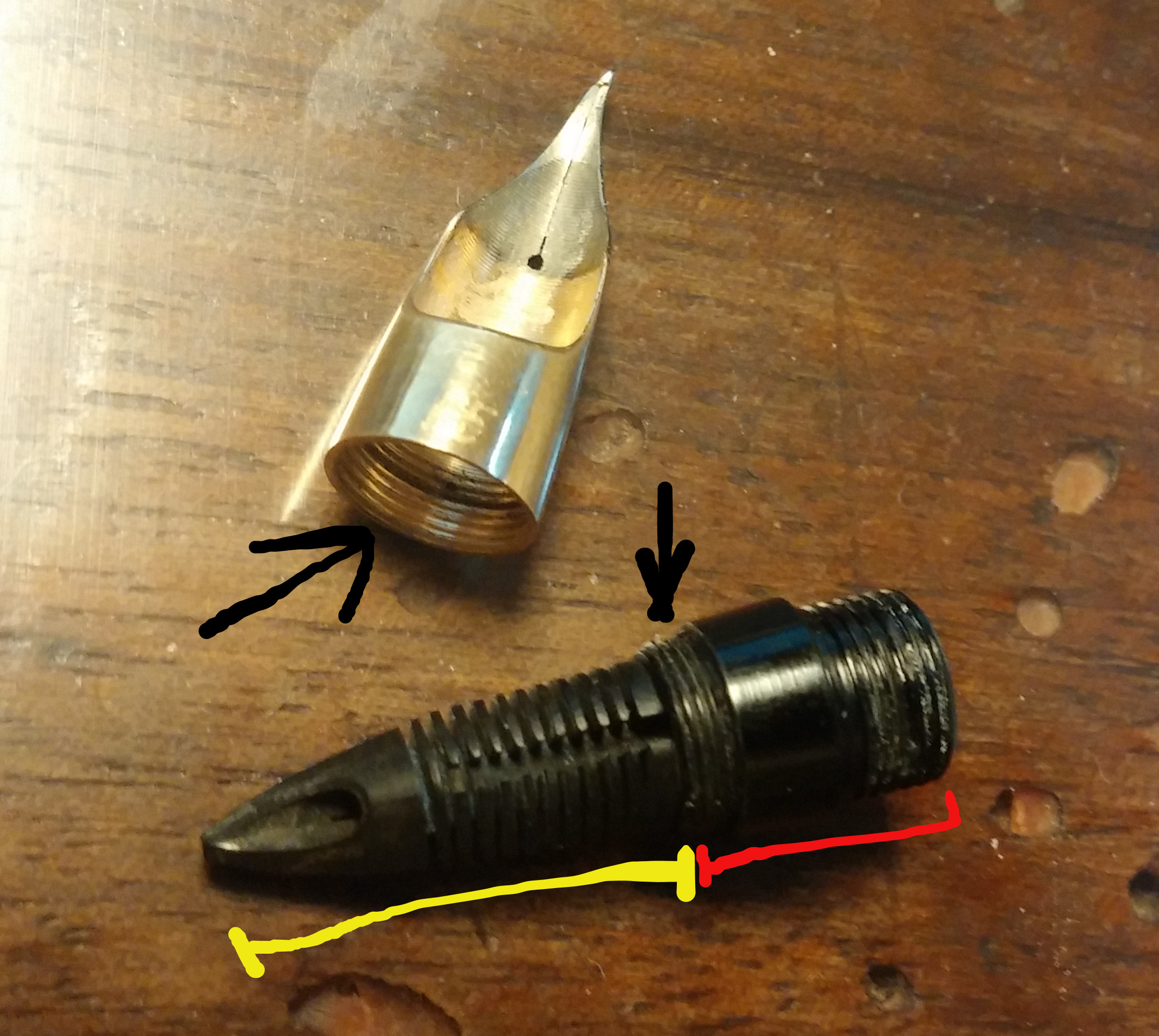 Qui sotto conduttore (giallo) con ghiera (rosso), e pennino. Evidenziate le due filettature che si devono ingaggiare l'una all'altra. Qui invece è in evidenza l'intaglio sul dietro del conduttore per allinearlo correttamente al pennino. Il pennino ha le punte un po' stortignaccole. Lo so. Ci sto lavorando con pazienza.