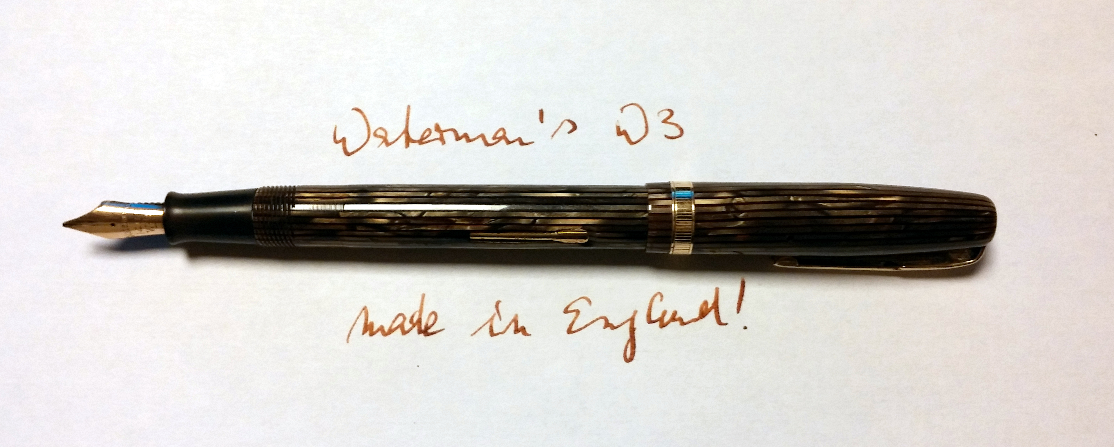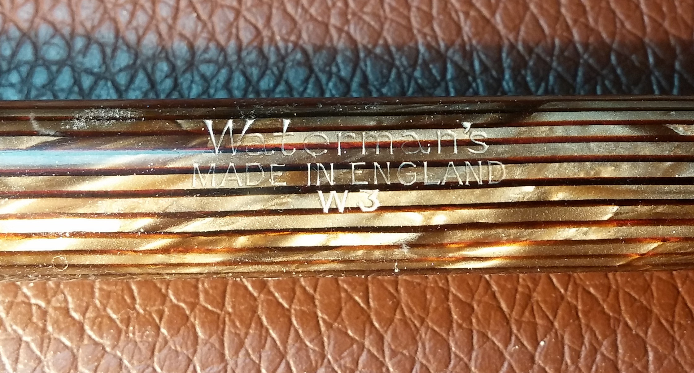 E' una Waterman's prodotta in Inghilterra, di una bella celluloide striata marrone. Lunga 128 mm incappucciata. Sul corpo "Waterman's / Made in England / W3". Sul pennino: "Watermans / 14ct / W3".