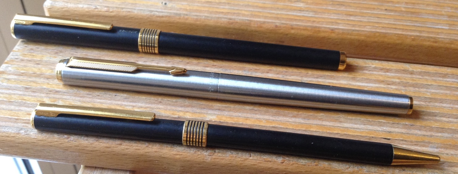 Ad esempio, la clip della 95 é molto più elegante di quella che equipaggia la Arrow, appare meno "grezza". Le ali della clip, particolarmente pronunciate in entrambi i modelli, sulla 95 non sono lisce ma incise con una fitta serie di linee oblique. La 95 é stata prodotta dal 1988 al 1994 in diverse versioni, da quelle laccate su ottone a quelle placcate in argento e in oro 2 ct. Quella che posseggo appartiene alla grande famiglia delle Parker Flighter, caratterizzate dal fatto di avere fusto e cappuccio in acciaio satinato. E' questo a mio parere uno degli stili più caratteristici delle Parker moderne.