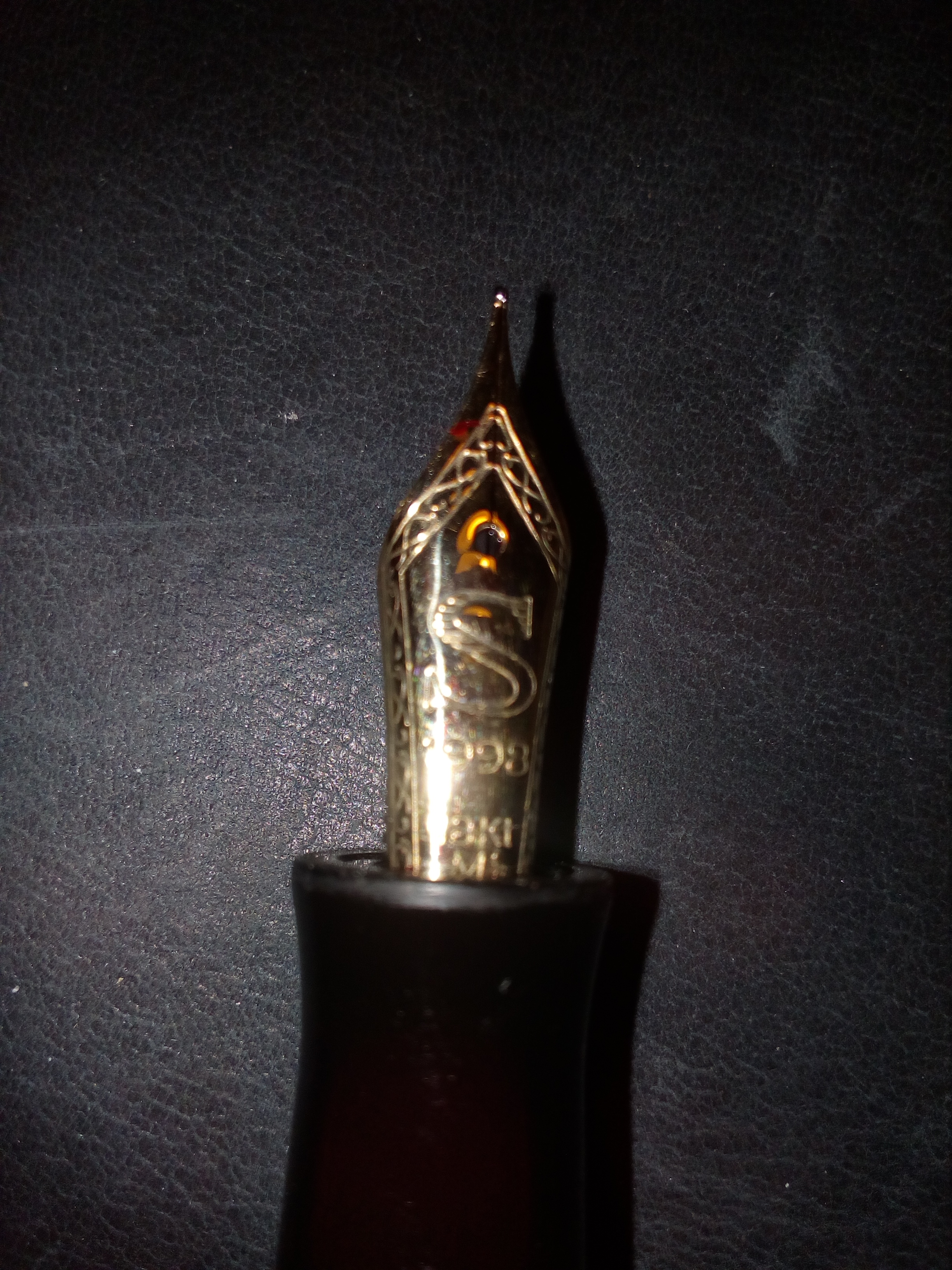 Il corpo pennino è uguale all’altra: nero che si restringe per agevolare l’impugnatora. Il pennino è il pezzo forte della penna e punto d’onore d’azienda. È di grandi dimensioni, tutto in oro 18k, cesellato con un motivo che segue il bordo e con la solita S al centro. Lo sfiato è circolare. Il pennino viene prodotto internamente all’azienda. Ogni particolare della penna è di produzione italiana. Una veretta molto fine separa il corpo pennino dal fondello che prosegue liscio fino alla fine, senza altri inserti.