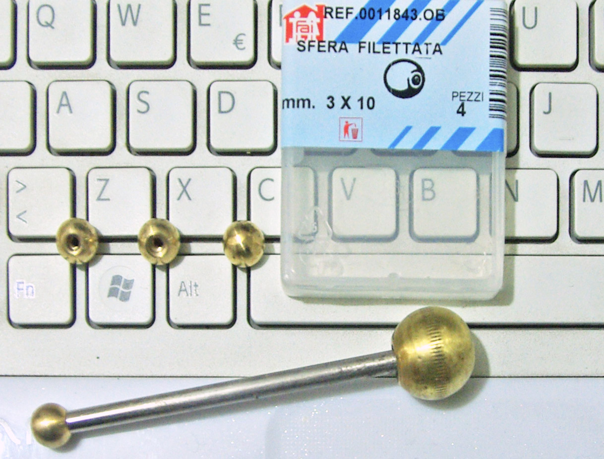 Le sfere piccole le ho trovate in un brico (Obi, mi sembra), ne avevano di alcuni diametri diversi, il foro filettato, proporzionato al diametro, ne consente il fissaggio a viti o barrette lunghe il desiderato. ciao a tutti, e.....................