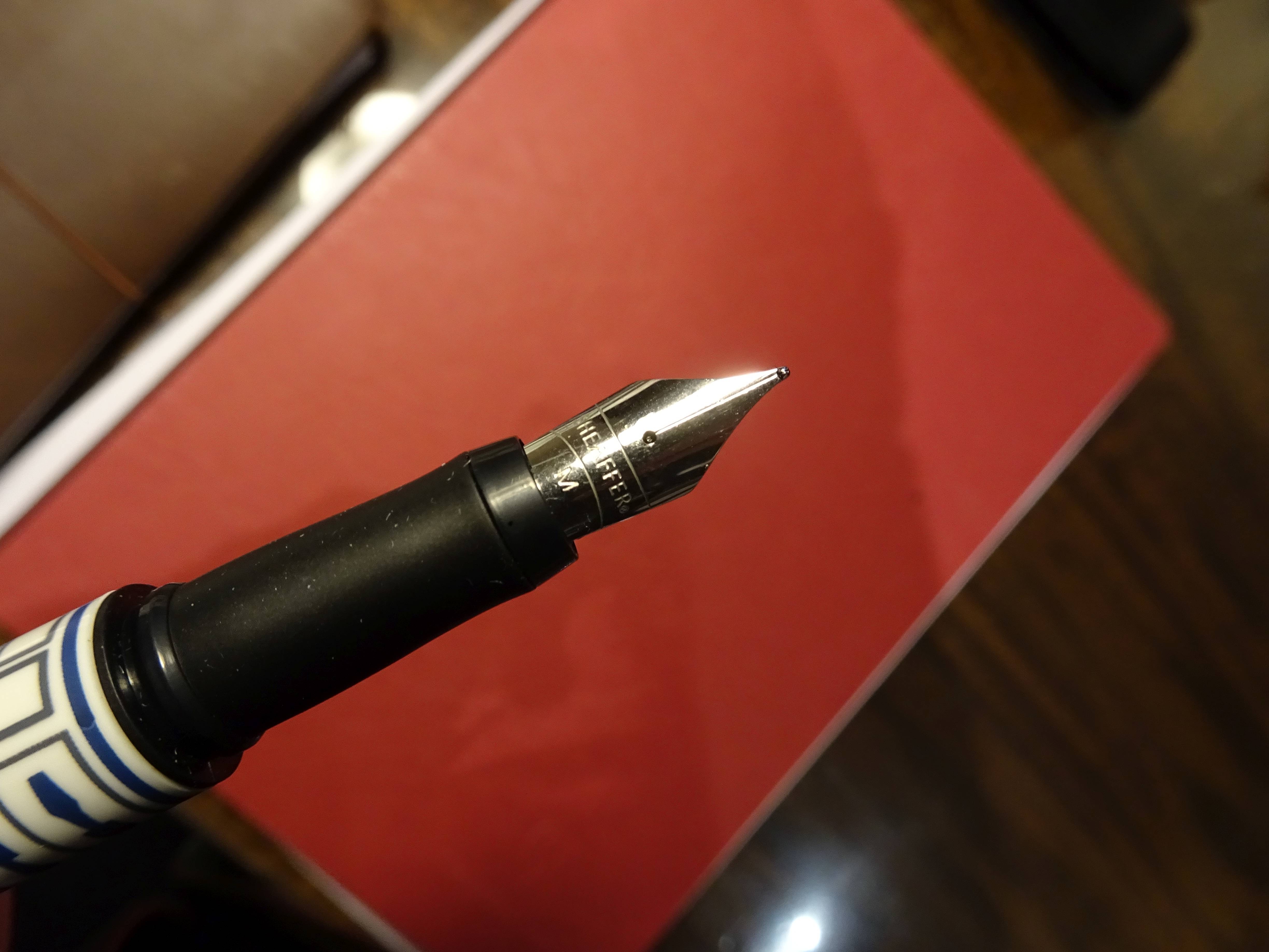 Il pennino, nella migliore tradizione Sheaffer è rigido ma scorrevolissimo, con una portata di inchiostro decisamente ricca. Si tratta di una misura M per nulla abbondante, direi un vero M, non stile Pelikan, quasi B.