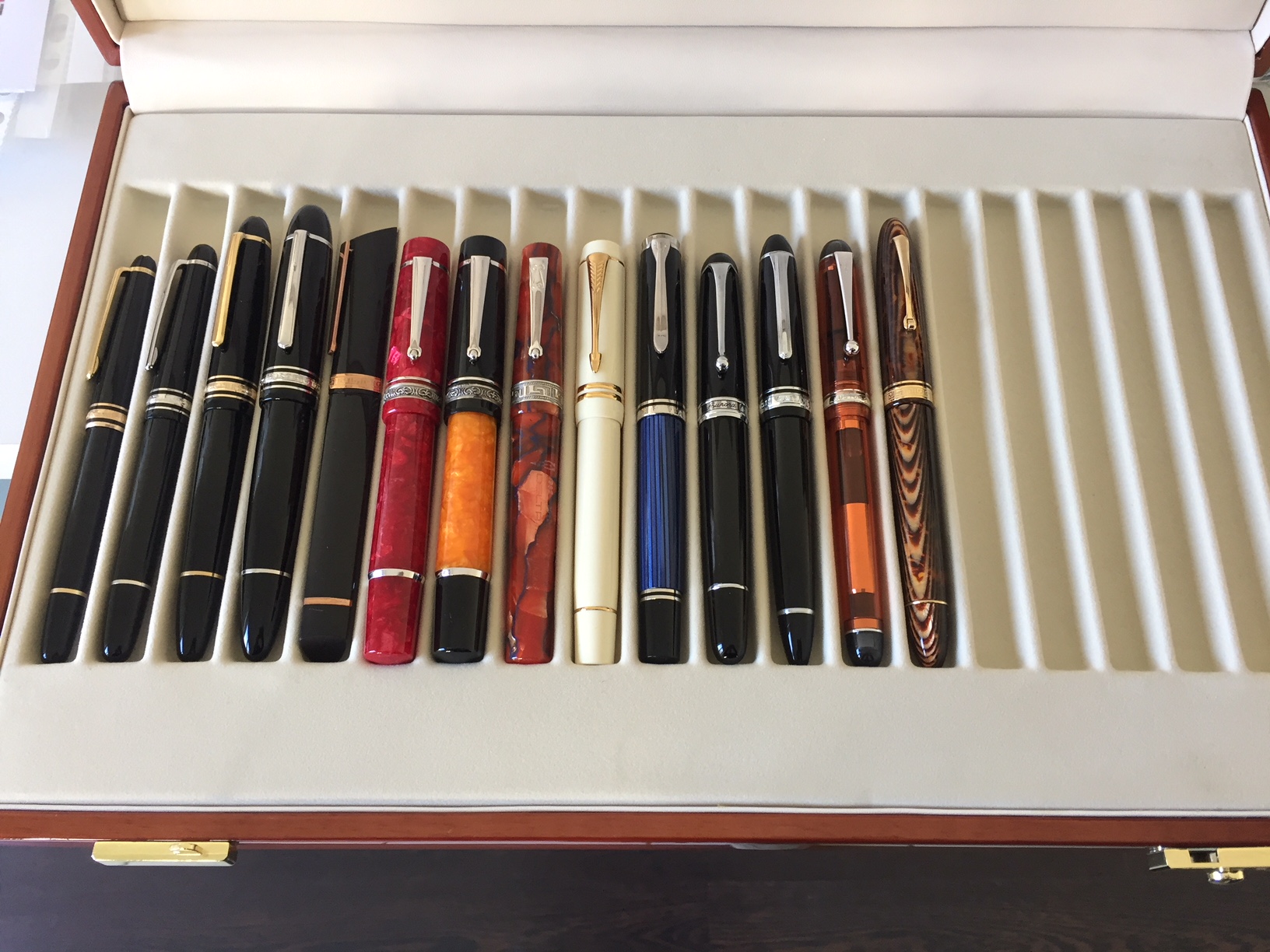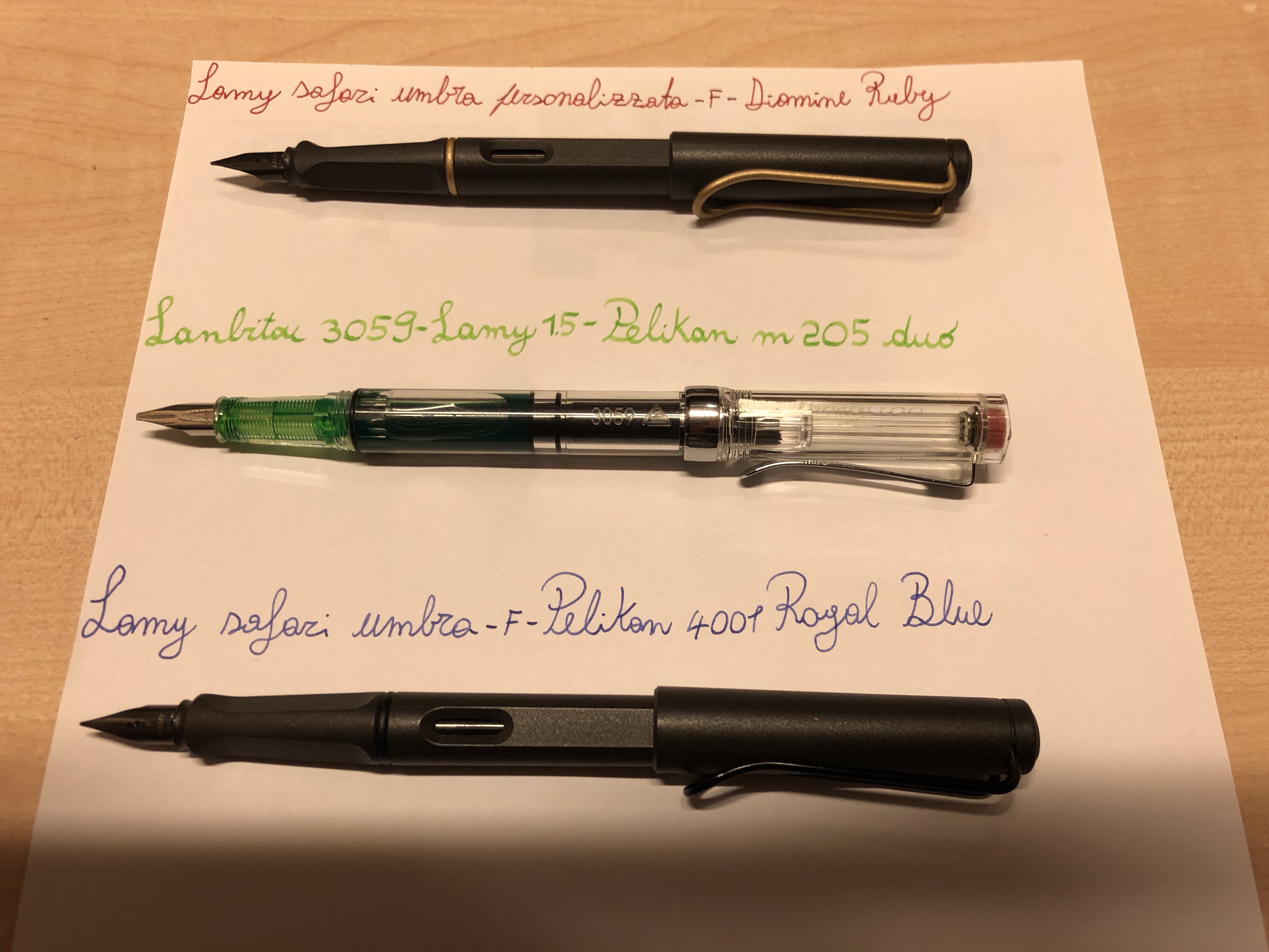 La rossa è una Zemax, la verde è una Visconti, la nera è una Waterman Man e la blu non ha bisogno di presentazioni.