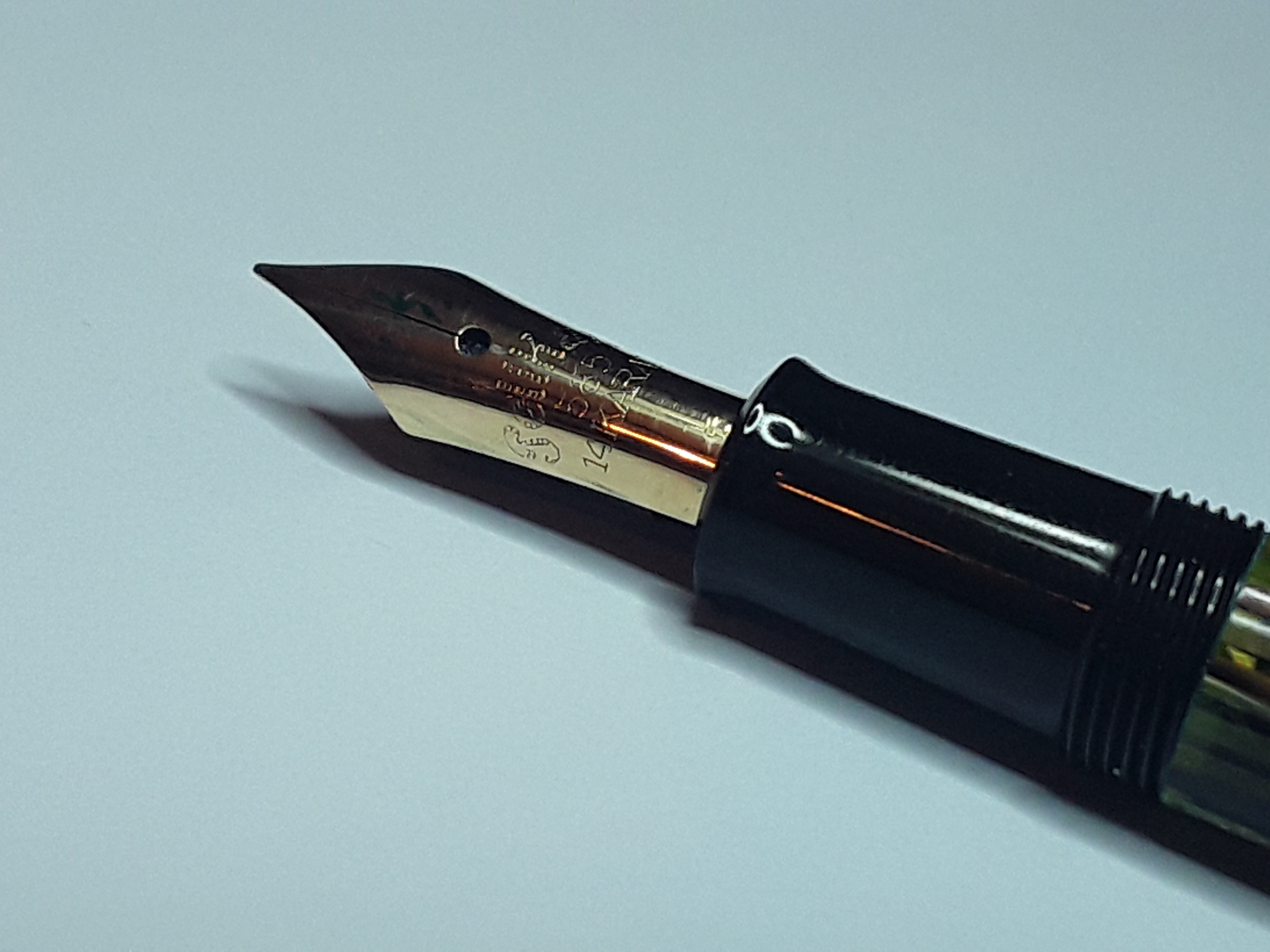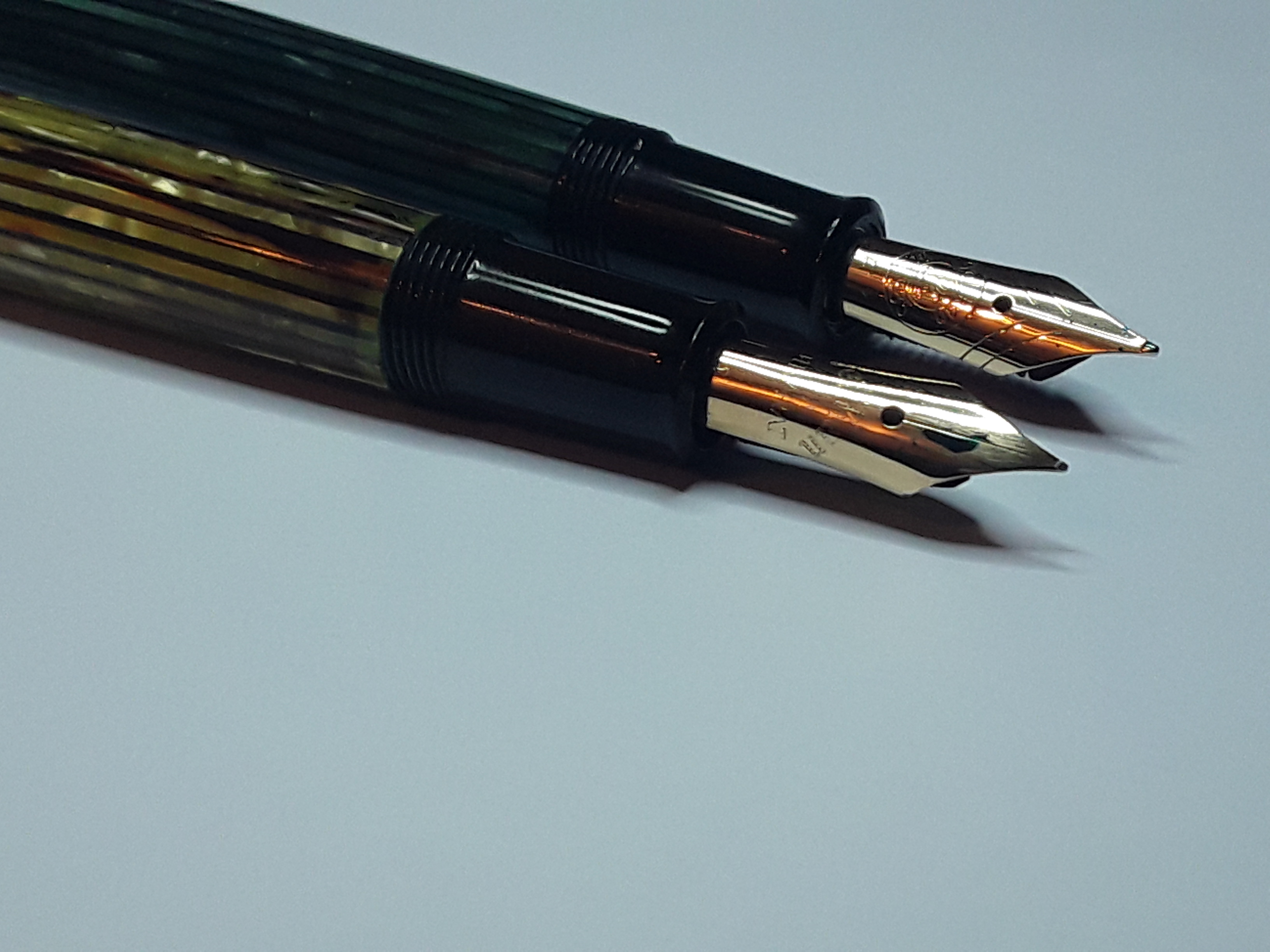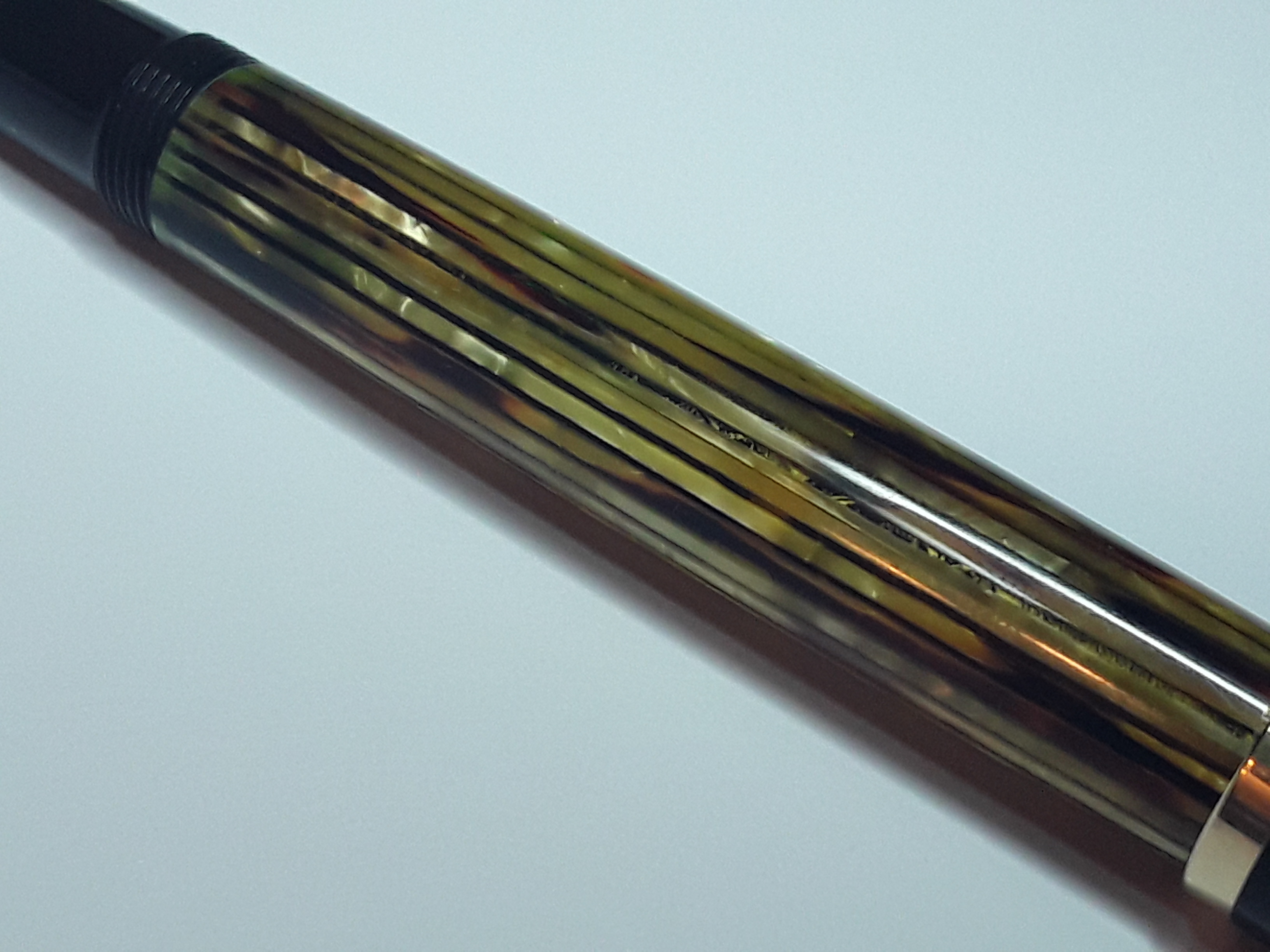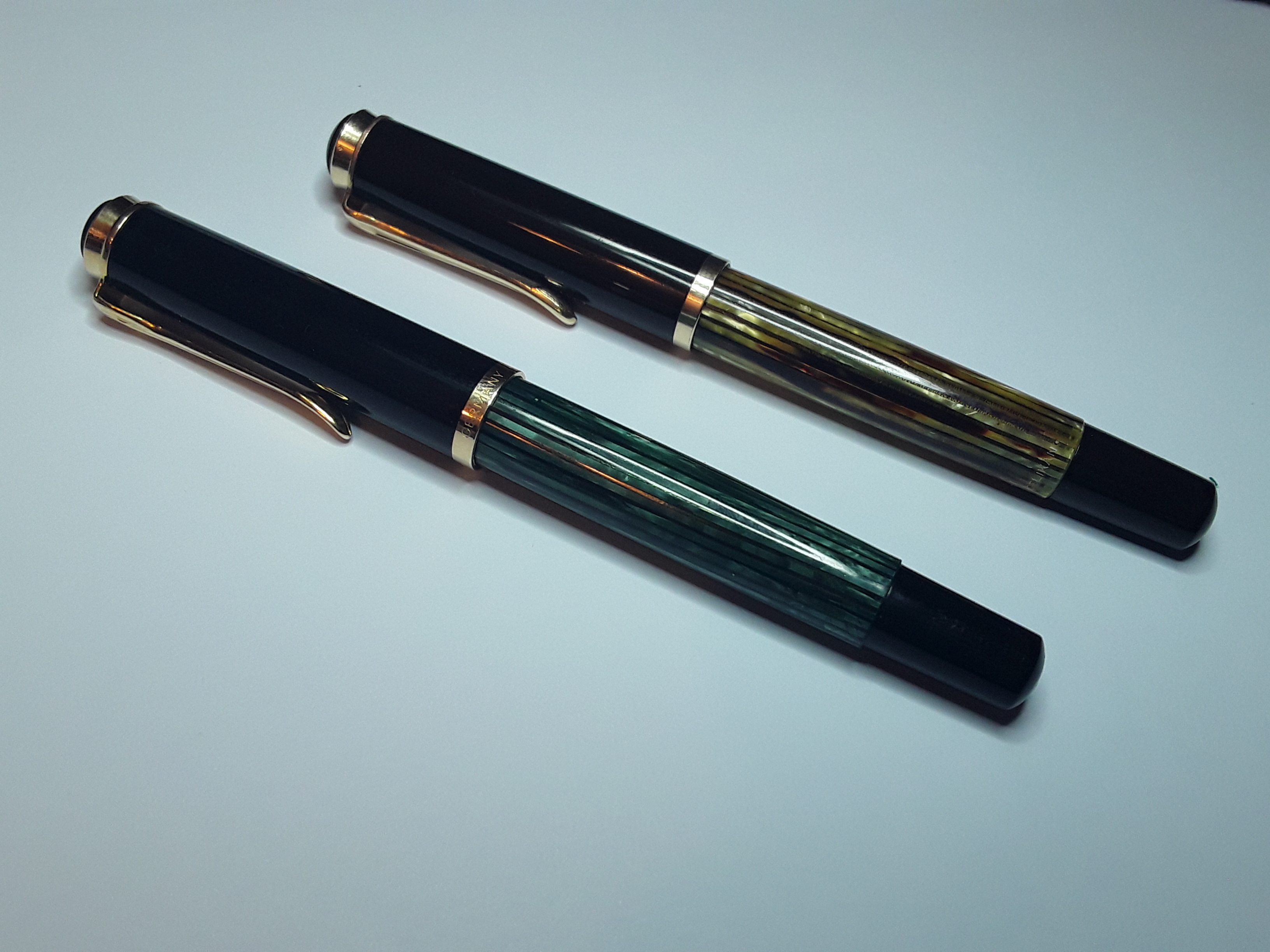 Vi voglio presentare l'ultimo arrivo. È ormai da un po' di tempo che mi sono fissato con le tedesche, in particolar modo con le Pelikan vintage, e da altrettanto tempo mi sono imputato sulla Pelikan m400 brown tortoise, una penna che hanno fatto solo per poco tempo qualche anno fa anche in misura m800. Adoro i riflessi e il colore che cambiano in base a come si posiziona la penna, ed essendo un soddisfatto possessore di una m400 Old Style nel classico verde striato (il cui verde a mio parere non ha niente a che vedere con il verde di oggi in fatto di variazioni cromatiche), volevo tentare altri orizzonti riguardo al colore. Domenica scorsa, al settimanale mercatino di numismatica e filatelia di via Orefici a Milano, trovai tra le varie bancarelle di monete una paio di scatole piene di stilografiche (purtroppo a Milano i prezzi sono sempre un po' altini). Tra molte Waterman rientranti e varie italiane, vi era uno scompartimento dedicato totalmente alle Pelikan, e tra le 140 monocromatiche e le 400nn è saltata fuori una bellissima 400 brown tortoise degli anni 50, dai colori spettacolari e dal corpo e cappuccio color marrone scuro. Tra una contrattazione e l'altra, la portai a casa per un prezzo a mio parere abbastanza buono (sulla trentina di euro, per via del nome del vecchio proprietario inciso sul cappuccio che poi nascosi sotto la clip). Dopo una bella ripulita e lucidata, notai un paio di cose che mi lasciarono un poco perplesso: la prima, sull'anello del cappuccio non vi è scritto nulla, nemmeno Pelikan o Germany; la seconda, il pennino non mi sembra il classico 400 ma assomiglia a quello della serie 100 con la scritta Pelikan fatta a cerchietti e sotto 14 KARAT e sotto ancora la misura (F); la terza, la penna carica bene (forse un poco duro lo stantuffo all'inizio, ma dopo una lavata si è smollato un pochino), non ha crepe e non trafila inchiostro, ma tra le linee trasparenti noto un sottile reticolo traslucido all'interno del serbatoio, come se si stesse cristallizzando, eppure rumori strani non ne sento, anzi mi sembra molto robusta. Detto ciò, questi colori (più chiari e secondo me più ricchi del moderno brown tortoise) mi fa davvero impazzire, il pennino è flessibile e gratta forse un po' troppo per i miei gusti (magari lo faccio sistemare e ammorbidire un pochino). Perciò qual miglior modo per iniziare gli esami universitari con una bella Pelikan, spero solo di non distrarmi troppo a guardarla durante gli scritti, altrimenti sono rovinato! Vi lascio qualche foto della penna confrontata con la m400 verde. Se avete qualche informazione aggiuntiva precisazione su di essa, le accolgo più che volentieri. Grazie a tutti per l'attenzione e vi auguro una buona giornata!