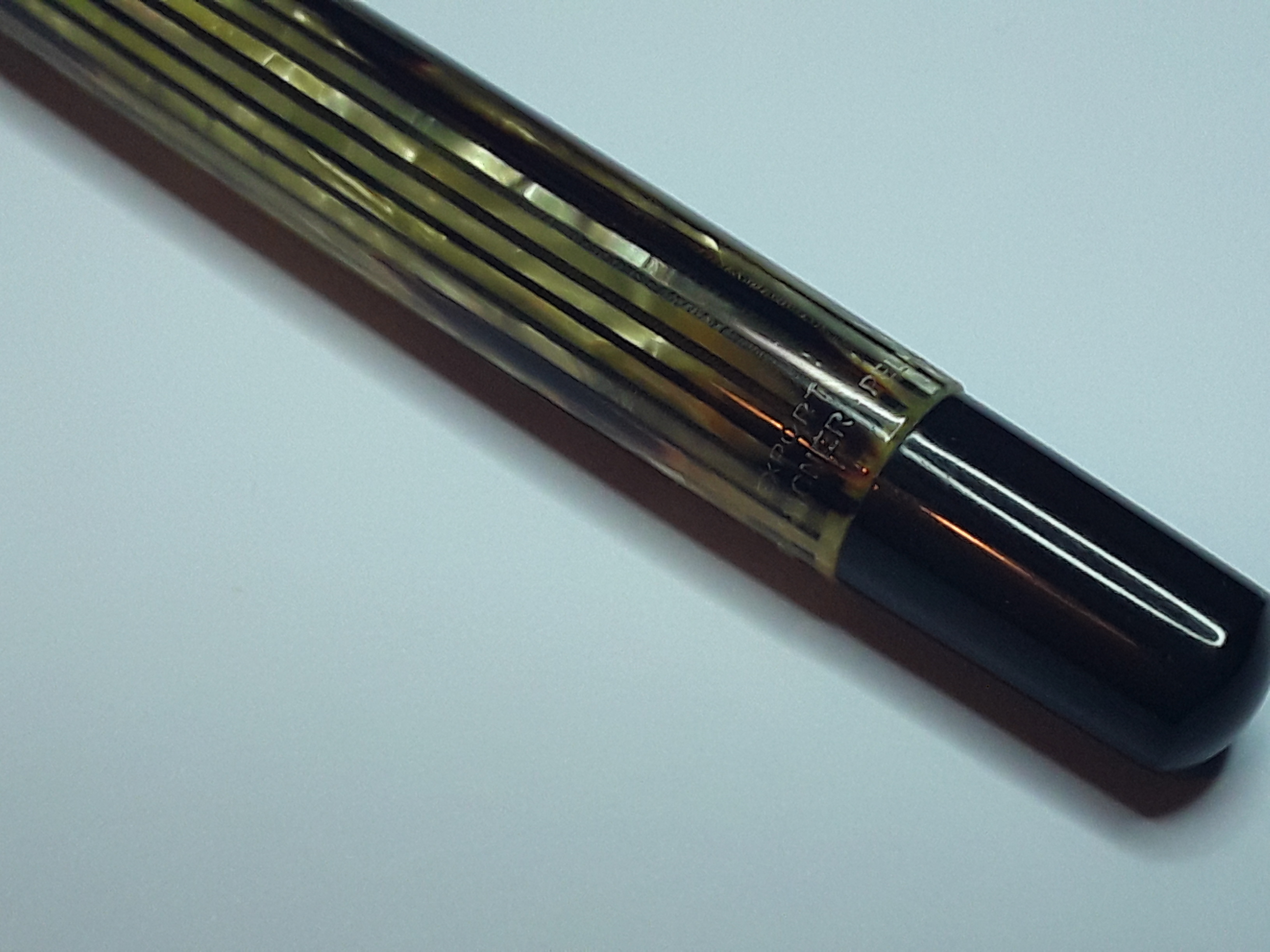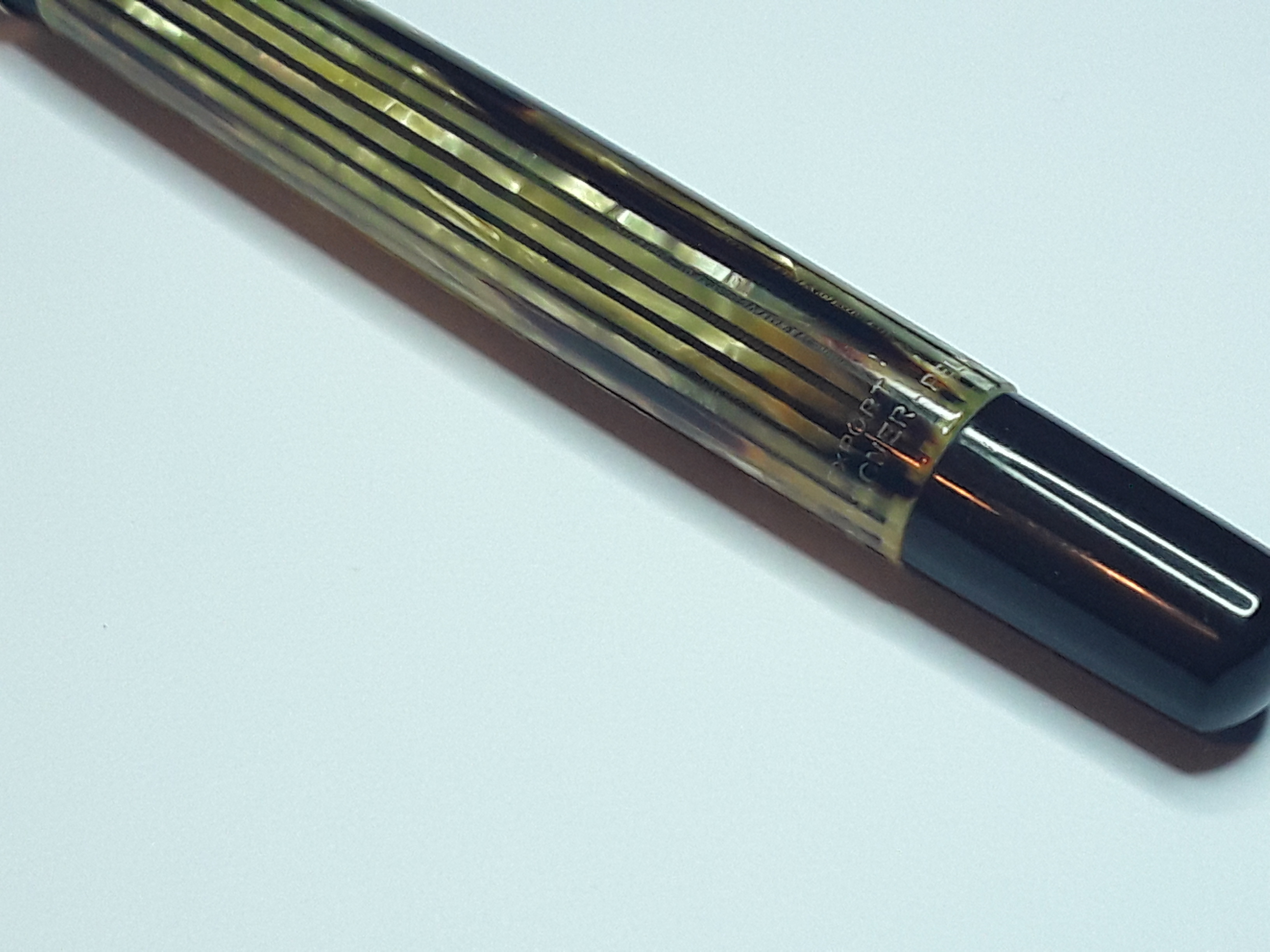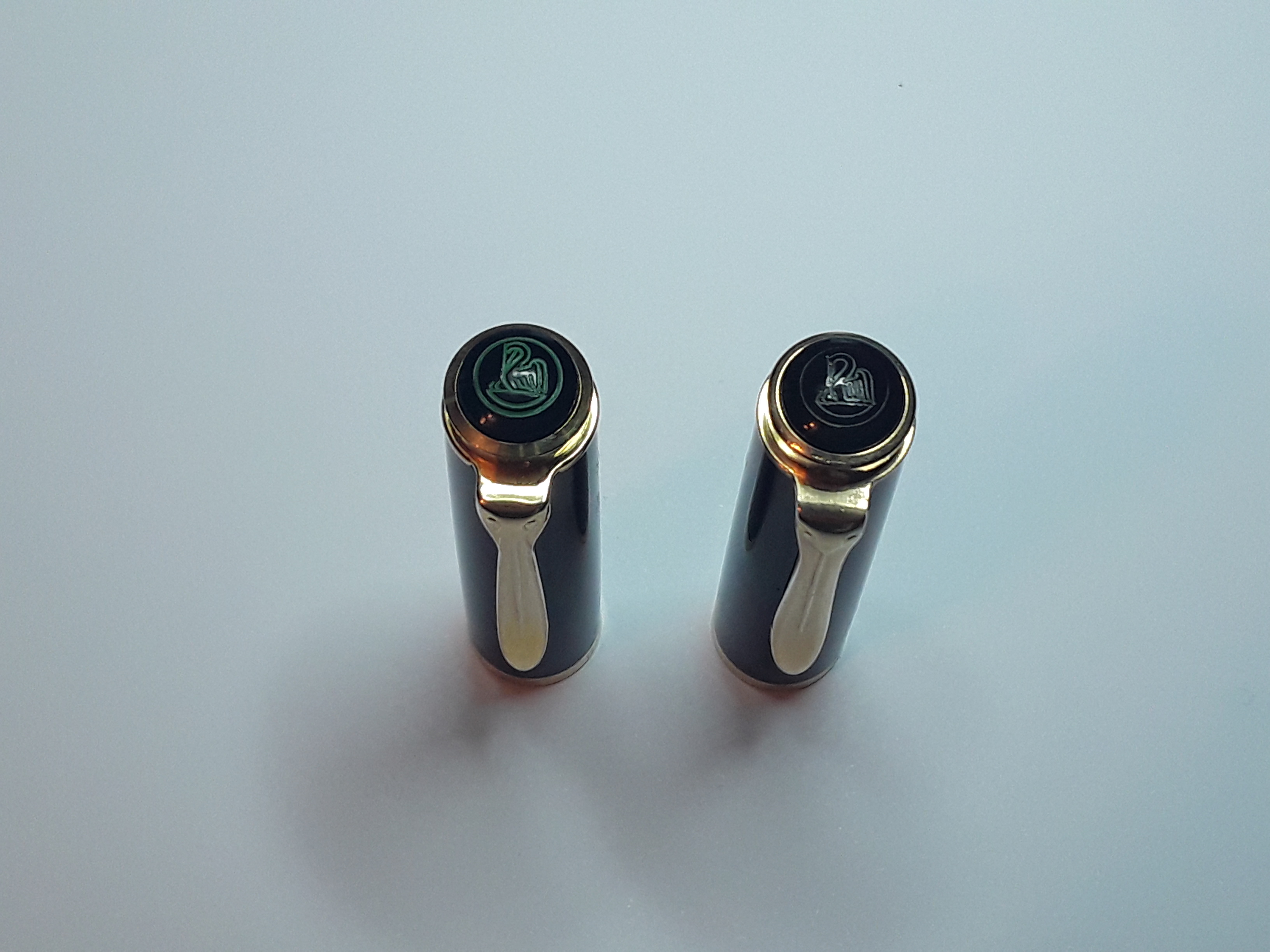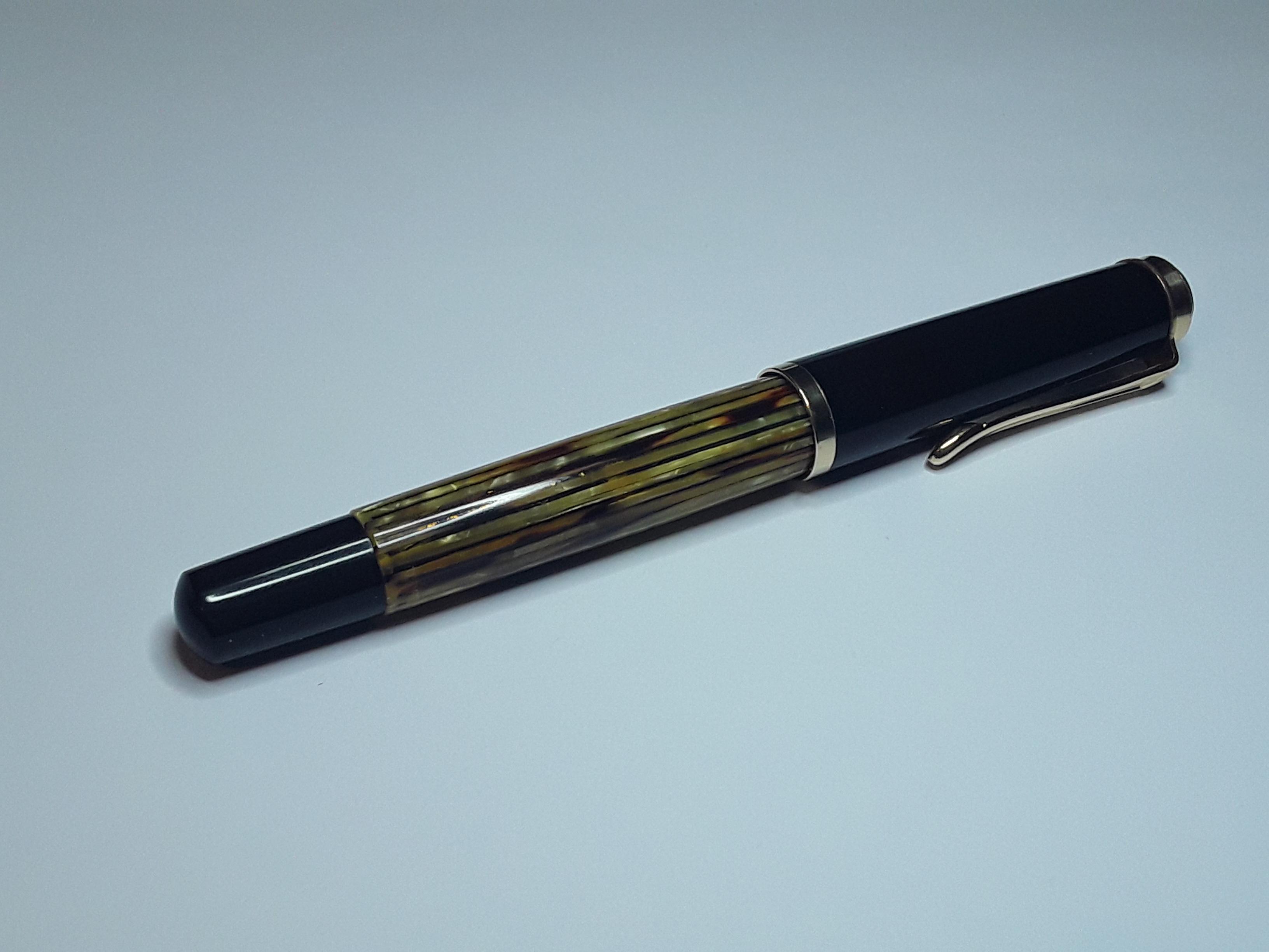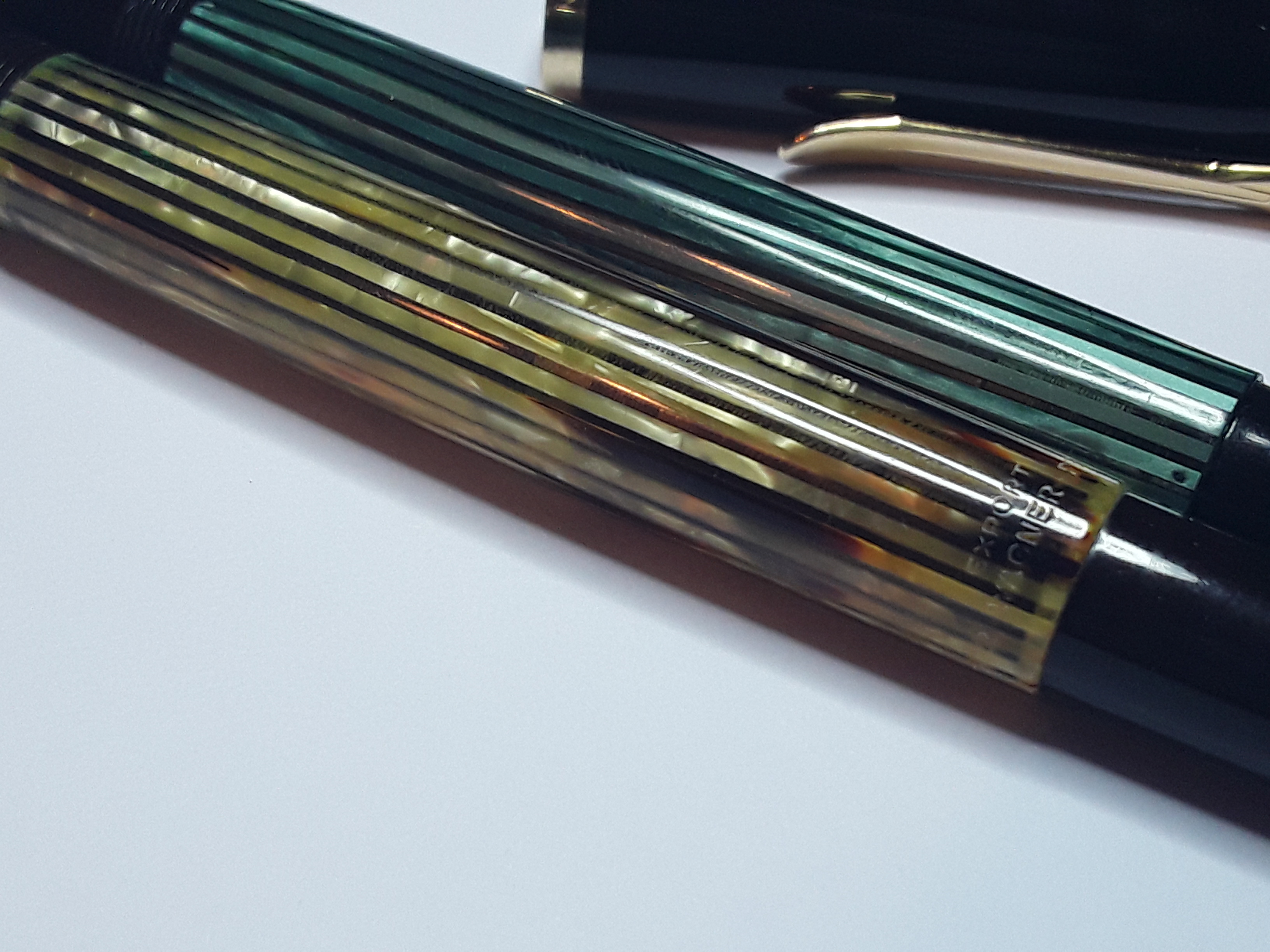Vi voglio presentare l'ultimo arrivo. È ormai da un po' di tempo che mi sono fissato con le tedesche, in particolar modo con le Pelikan vintage, e da altrettanto tempo mi sono imputato sulla Pelikan m400 brown tortoise, una penna che hanno fatto solo per poco tempo qualche anno fa anche in misura m800. Adoro i riflessi e il colore che cambiano in base a come si posiziona la penna, ed essendo un soddisfatto possessore di una m400 Old Style nel classico verde striato (il cui verde a mio parere non ha niente a che vedere con il verde di oggi in fatto di variazioni cromatiche), volevo tentare altri orizzonti riguardo al colore. Domenica scorsa, al settimanale mercatino di numismatica e filatelia di via Orefici a Milano, trovai tra le varie bancarelle di monete una paio di scatole piene di stilografiche (purtroppo a Milano i prezzi sono sempre un po' altini). Tra molte Waterman rientranti e varie italiane, vi era uno scompartimento dedicato totalmente alle Pelikan, e tra le 140 monocromatiche e le 400nn è saltata fuori una bellissima 400 brown tortoise degli anni 50, dai colori spettacolari e dal corpo e cappuccio color marrone scuro. Tra una contrattazione e l'altra, la portai a casa per un prezzo a mio parere abbastanza buono (sulla trentina di euro, per via del nome del vecchio proprietario inciso sul cappuccio che poi nascosi sotto la clip). Dopo una bella ripulita e lucidata, notai un paio di cose che mi lasciarono un poco perplesso: la prima, sull'anello del cappuccio non vi è scritto nulla, nemmeno Pelikan o Germany; la seconda, il pennino non mi sembra il classico 400 ma assomiglia a quello della serie 100 con la scritta Pelikan fatta a cerchietti e sotto 14 KARAT e sotto ancora la misura (F); la terza, la penna carica bene (forse un poco duro lo stantuffo all'inizio, ma dopo una lavata si è smollato un pochino), non ha crepe e non trafila inchiostro, ma tra le linee trasparenti noto un sottile reticolo traslucido all'interno del serbatoio, come se si stesse cristallizzando, eppure rumori strani non ne sento, anzi mi sembra molto robusta. Detto ciò, questi colori (più chiari e secondo me più ricchi del moderno brown tortoise) mi fa davvero impazzire, il pennino è flessibile e gratta forse un po' troppo per i miei gusti (magari lo faccio sistemare e ammorbidire un pochino). Perciò qual miglior modo per iniziare gli esami universitari con una bella Pelikan, spero solo di non distrarmi troppo a guardarla durante gli scritti, altrimenti sono rovinato! Vi lascio qualche foto della penna confrontata con la m400 verde. Se avete qualche informazione aggiuntiva precisazione su di essa, le accolgo più che volentieri. Grazie a tutti per l'attenzione e vi auguro una buona giornata!