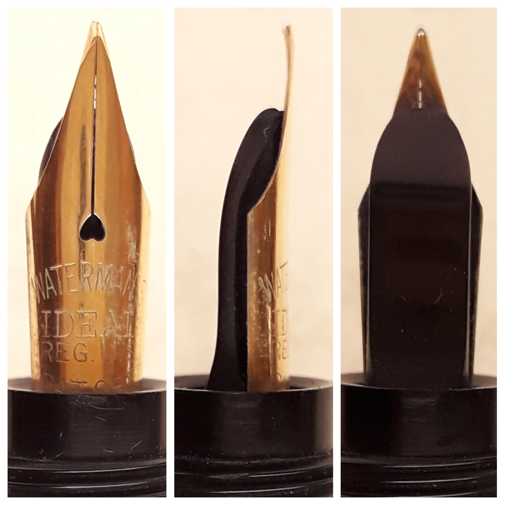 Ma lasciamo le favole e torniamo alla sostanza: ciò che sempre accomuna tutte queste penne-che-sono-la-stessa-penna (4x) è la caratteristica di essere invariabilmente dotate di pennini dalle prestazioni eccezionali, per molti versi sconcertanti se paragonate alla produzione d’oggidì. Si consideri l’elaborata quanto ardita lavorazione sfaccettata della punta di questa 42… e poi si osannino pure senza ritegno i pennini Lamy di ferro intercambiabili… (il paragone non paia blasfemo: questo classico vintage l’ho pagato quanto una Aion). Le rientranti, che si erano mantenute sulla breccia per quasi un trentennio quando le innovazioni nel campo della scrittura erano all’ordine del giorno e la sfida per la sopravvivenza davvero durissima, sono penne grandiose, e così “corazzate” mi ricordano, chissà perché?, i dinosauri (ma avevo trovato similitudine anche con animaletti altrettanto simpatici ma assai meno impegnativi https://forum.fountainpen.it/viewtopic.php?t=14604