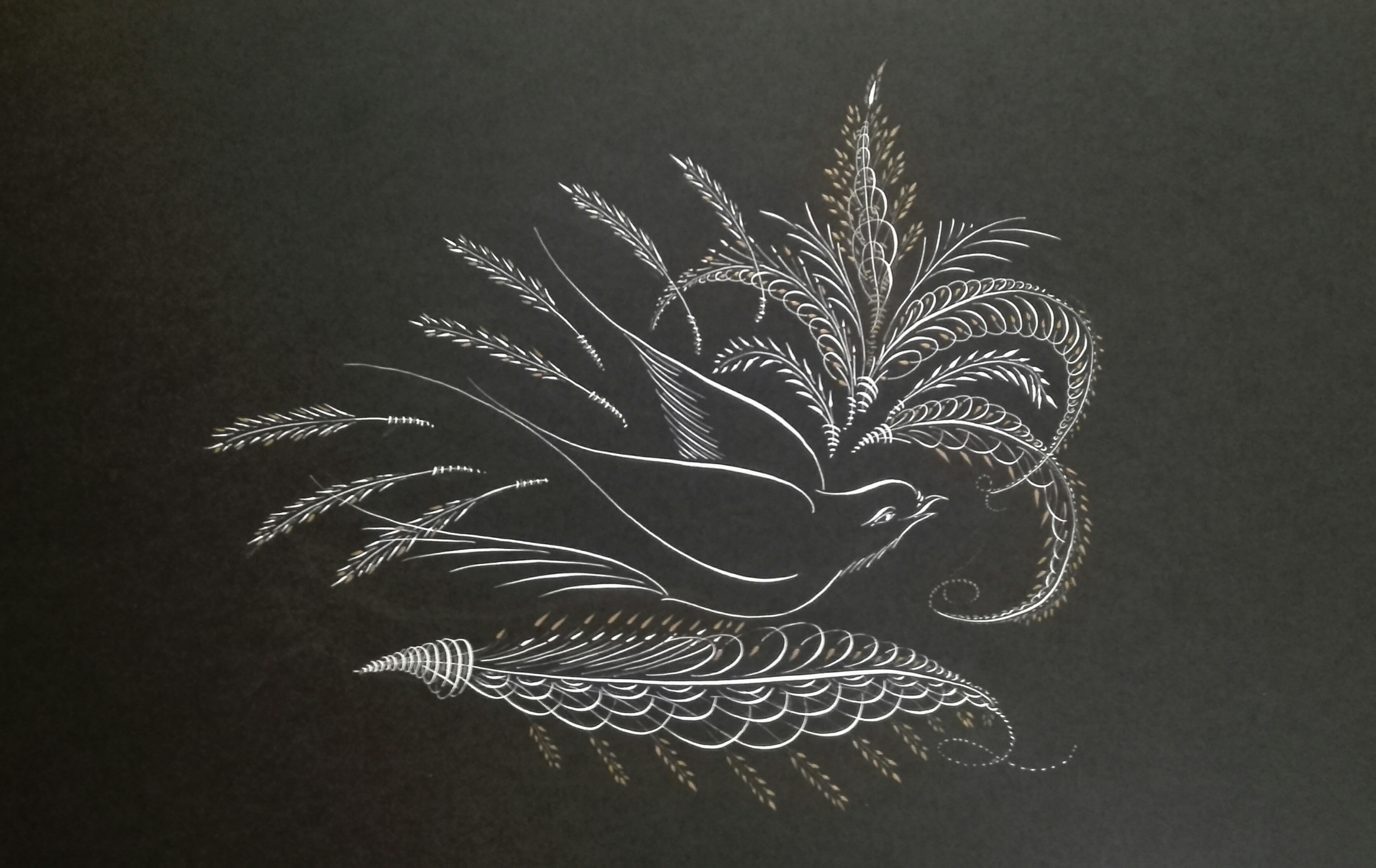 Si esegue con il pennino a punta fine ed è essenzialmente composta degli stessi tratti che si usano per la calligrafia. I soggetti principali sono fiori e uccellini.