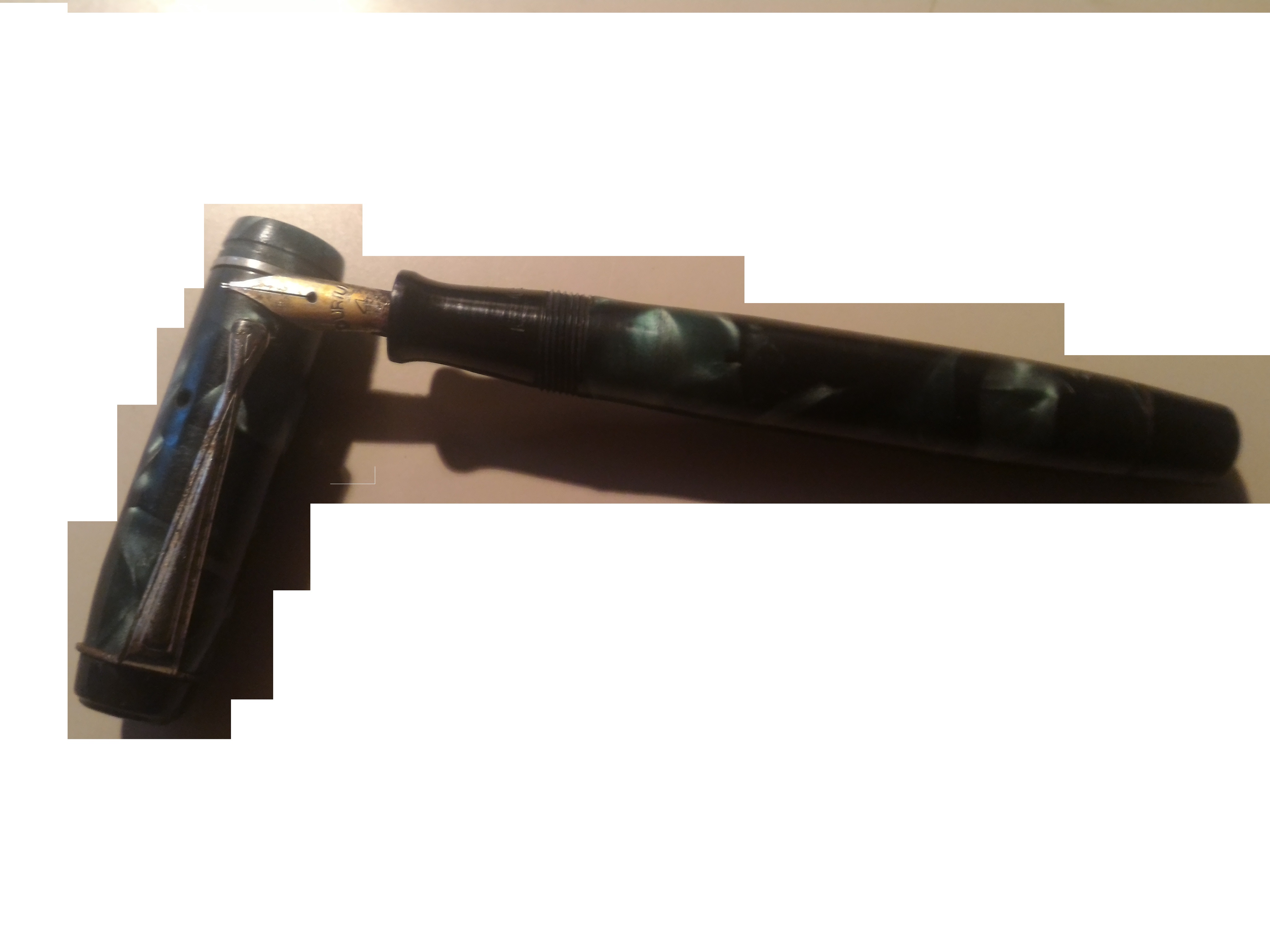 Riguardo le penne che hai caricato, le moderne non le conosco, anche se la quarta ha una clip a freccia e potrebbe essere una Parker (o imitazione di), se è una Parker in genere c'è pure scritto il nome da qualche parte. La seconda penna sembra una anonima anni '30/40 in celluloide, il pennino durium e quella clip si trovano su tantissime penne di quel periodo, prova a vedere se sul corpo c'è una qualche stampigliatura (non è detto, ma talvolta la traccia è molto leggera e si vede solo osservando con luce a raso,e con l'aiuto di una lente).