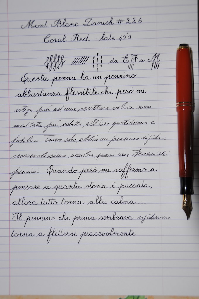 Salve, volevo mostrarvi l'ultima arrivata nella mia piccola collezione. Lungi da me dare spiegazioni di dettaglio, mi limito al riepilogo delle caratteristiche principali. Si tratta di una MB 226 credo di produzione danese di fine anni '40. Il pennino in oro 14k misura 6, è piuttosto flessibile e consente di scrivere con un tratto che va da molto fine a medio. Cappuccio, corpo e fondello sono in celluloide mentre il puntale è in ebanite come pure l'alimentatore che condivide con i modelli 126 e 136. Il sistema di caricamento è a pulsante di fondo, non lo avevo mai sperimentato e devo dire che risulta molto pratico. La clip e le verette sul cappuccio sono placcate oro. Le prime impressioni sono molto positive, come dicevo, il pennino, opportunamente sollecitato, può prodursi in variazioni di tratto, viceversa, scrive con notevole fluidità in un tratto sottile a me particolarmente gradito. Spero vi piaccia, a voi qualche foto.