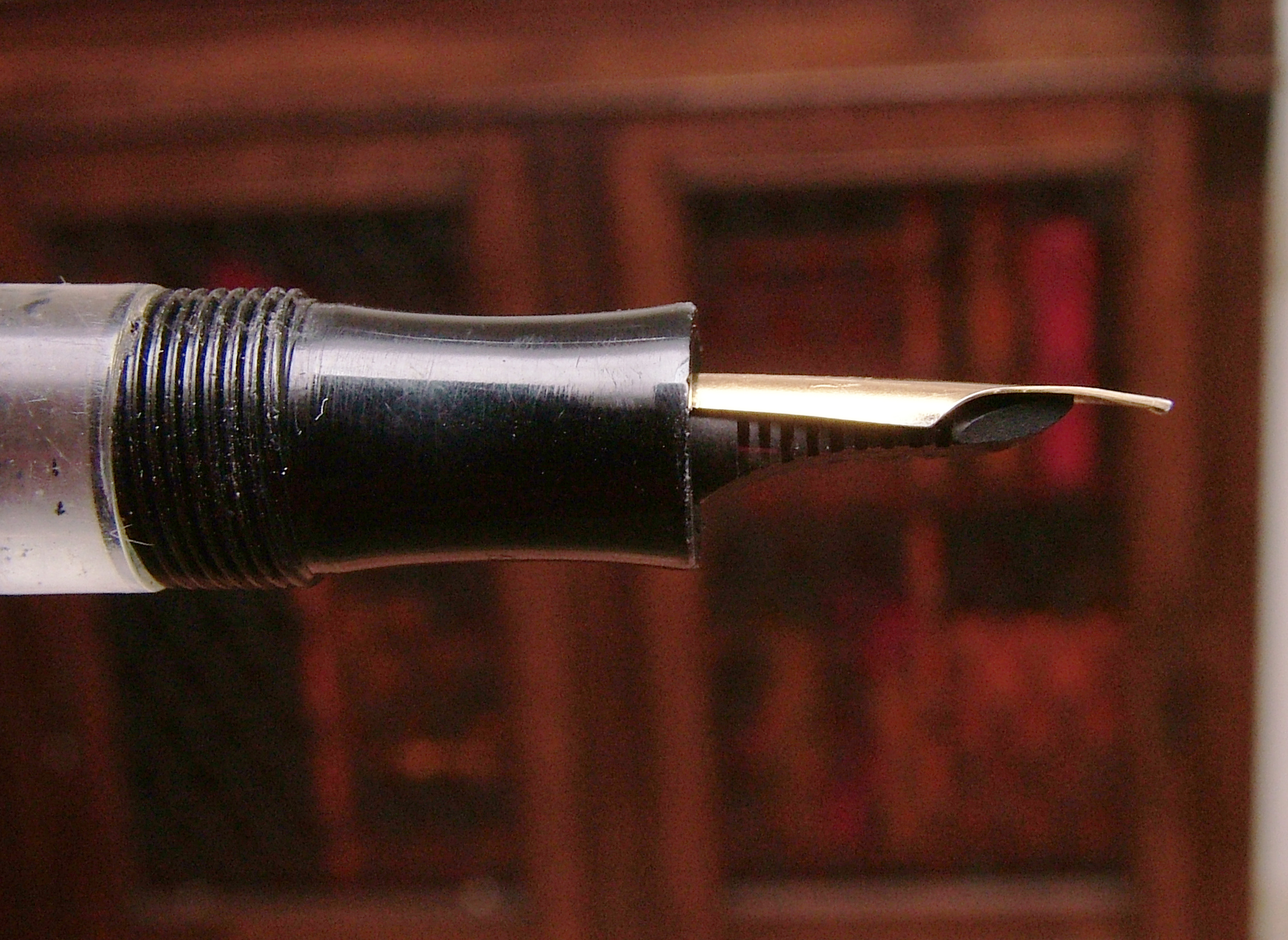 Scolastica anni 50 trovata su una bancarella, penna completamente disastrata, fusto rotto con profonde voragini in 2 punti, doratura inesistente e mancanza fondello posteriore, mi faceva tenerezza, pur non essendo una penna di alto lignaggio oserei dire la cenerentola delle stilo, aveva delle forme molto carine, mi ricordava molto per forma una via di mezzo tra Pelikan 100 e le Kaweco anni 30/40, penne da cui sono particolarmente attratto.
