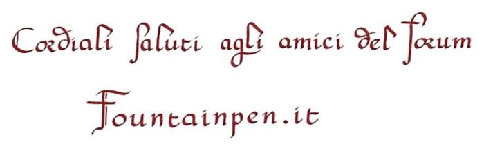 Mi farà piacere condividere con voi le impressioni su una nuova penna o un nuovo inchiostro. Vi scrivo un rapido saluto, con una calligrafia che ricorda la cancelleresca, ma in realtà piuttosto personale. La penna calligrafica, pennino stub "M", è decisamente da battaglia (in materiale plastico, marca "Standardgraph", a cartucce) ed è caricata con inchiostro Diamine Red Dragon.
