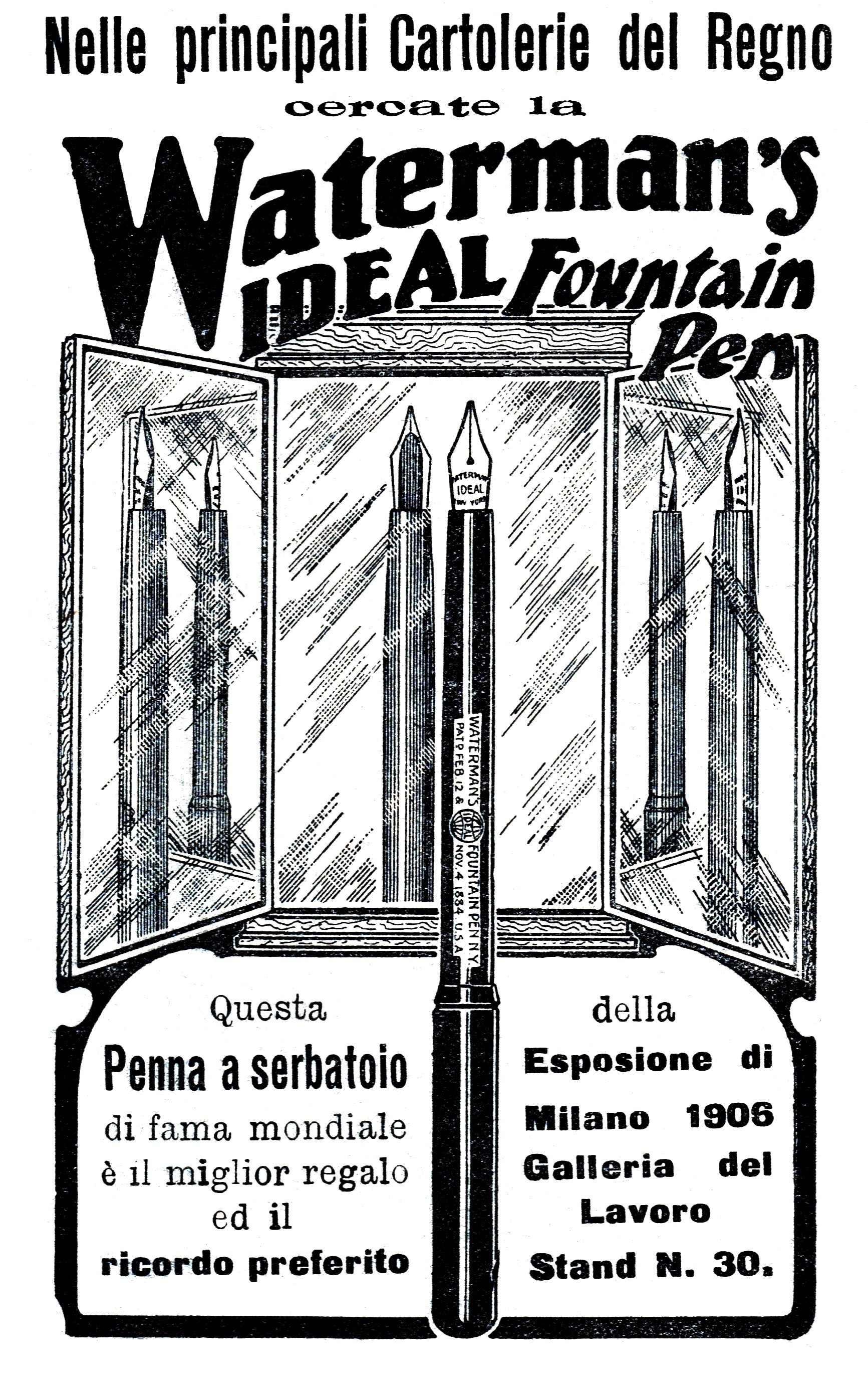 Nel numero de “La Domenica del Corriere” che andò in stampa tra quelle due date compare - con l’invero imbarazzante “refuso” “Esposione” al posto di “Esposizione” :ugeek: - una bella ed ingegnosa inserzione pubblicitaria della Waterman, tra le primissime Ad italiane della Casa americana di cui possediamo la data certa.